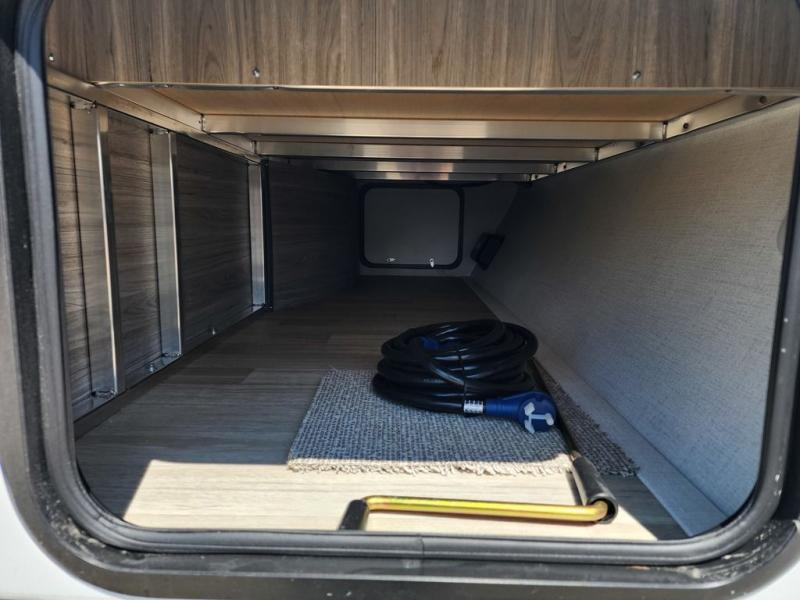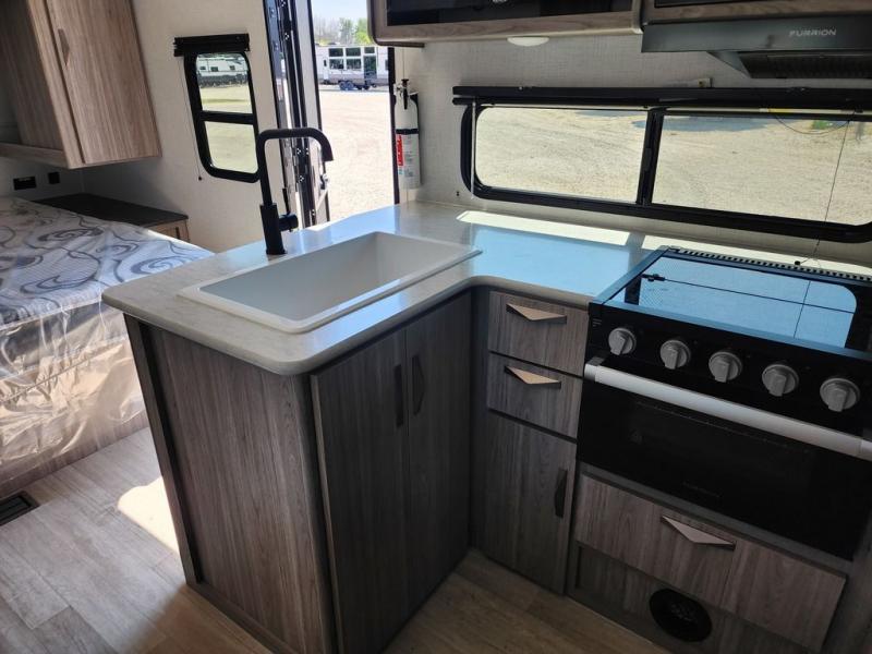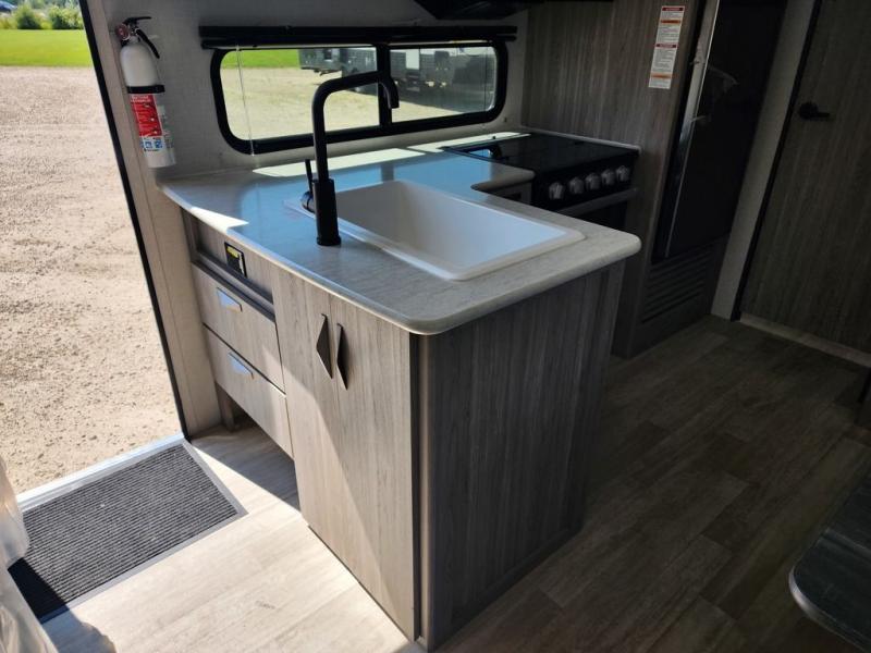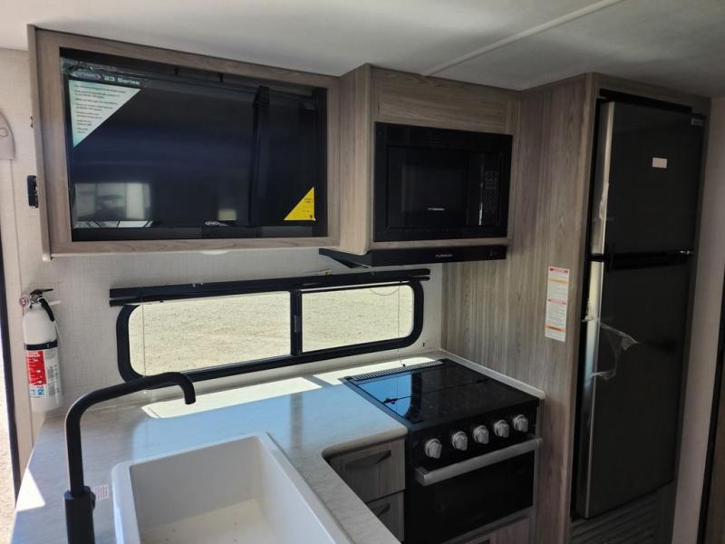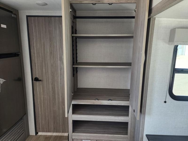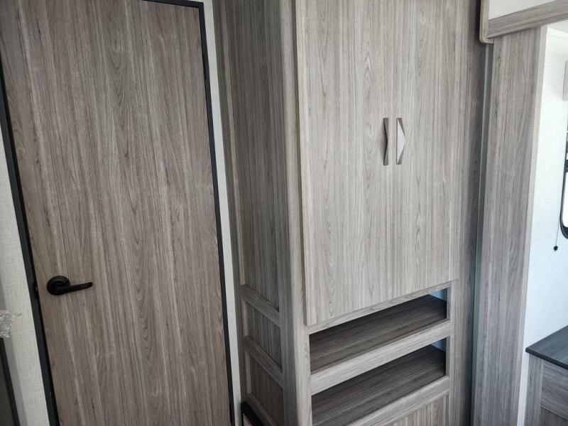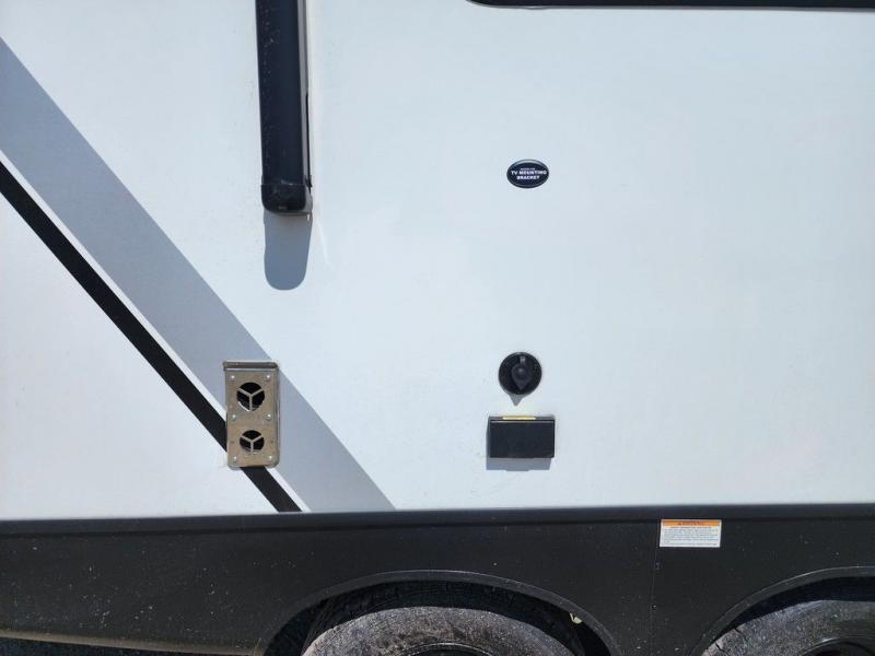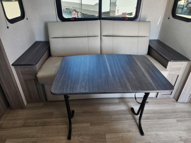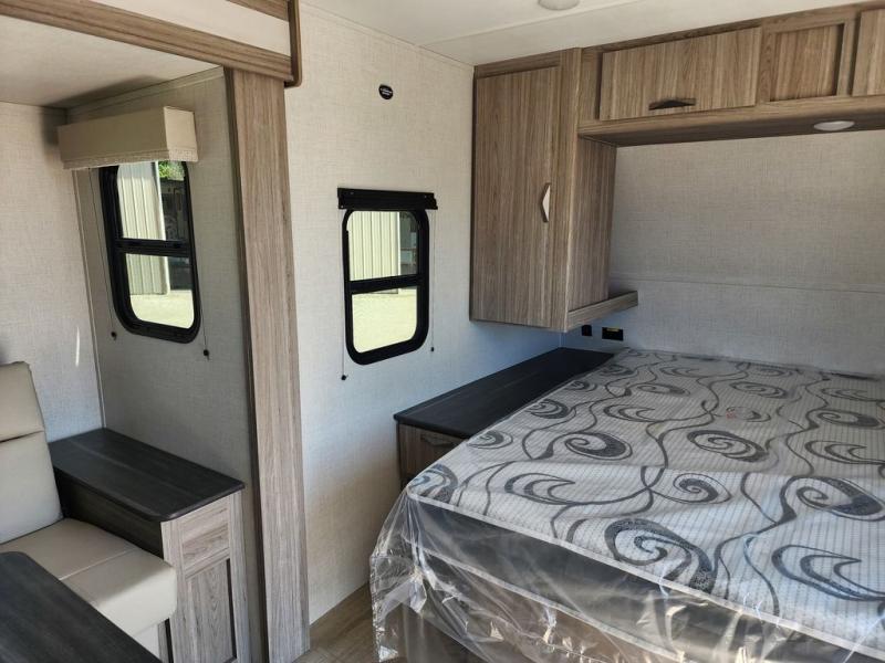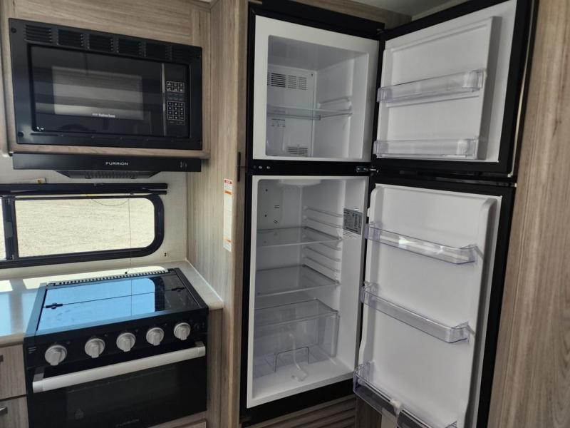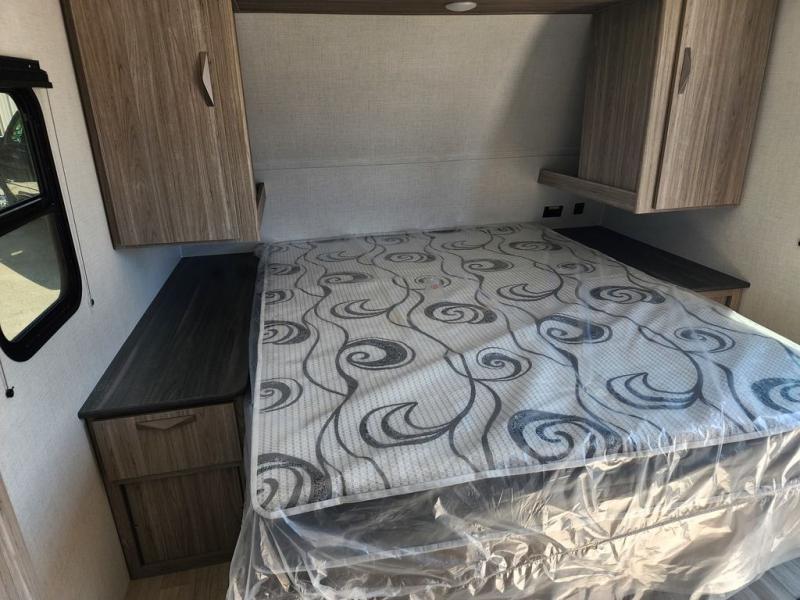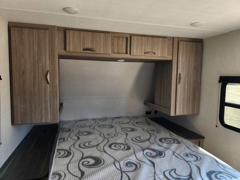 This is the perfect couple's trailer for weekend trips to the campground. You can set up the patio awning when you arrive, then unload the pass-thru storage before heading out on a trail. The full rear bath inside will let you freshen up when you get back, and there is a jack knife sofa slide where you can relax in the air conditioning. A two burner range and microwave oven lets you make dinner when you're hungry, and a large double door 12V refrigerator will be perfect to keep food fresh. This unit also includes a front queen bed with dual wardrobes and nightstands plus a privacy curtain if you have someone staying over on the sofa!