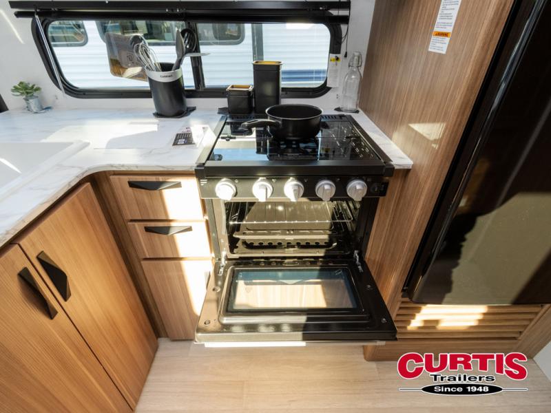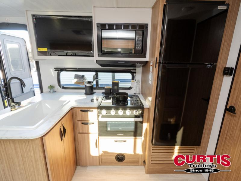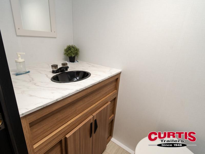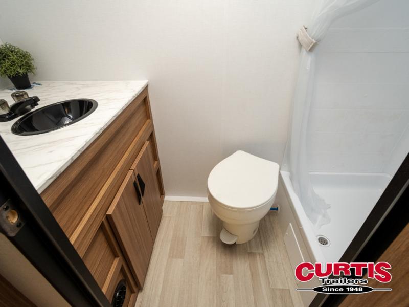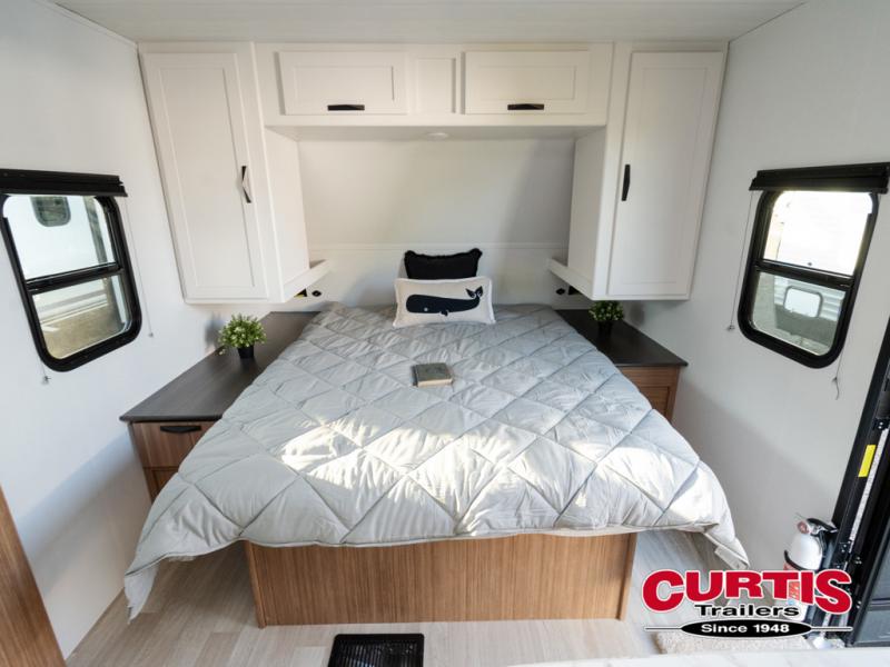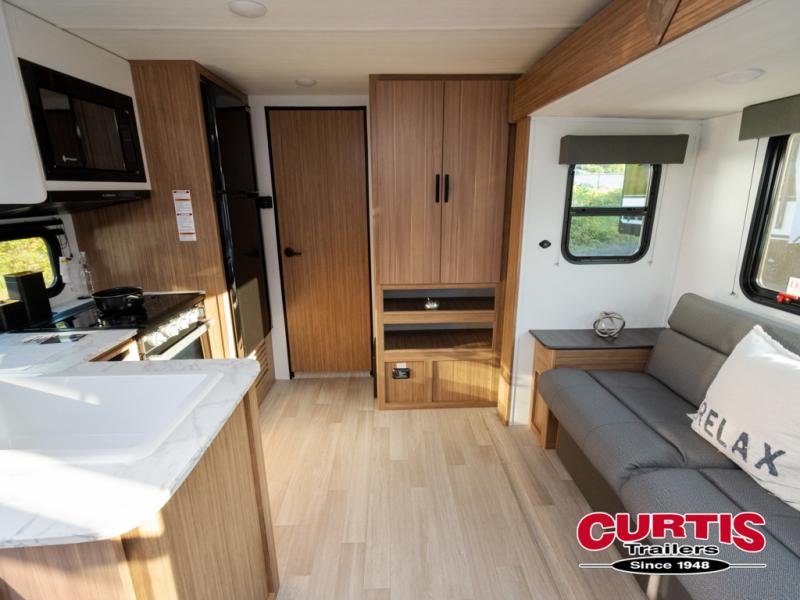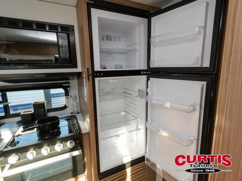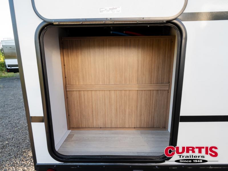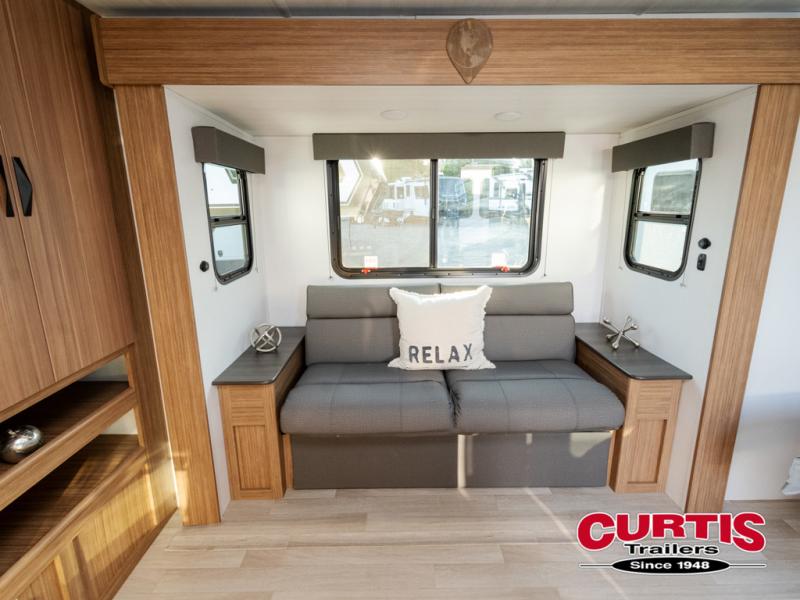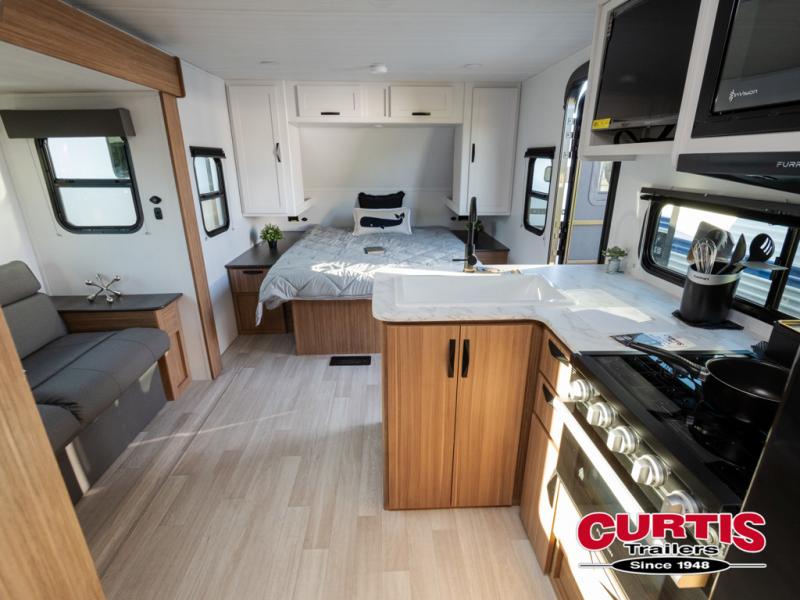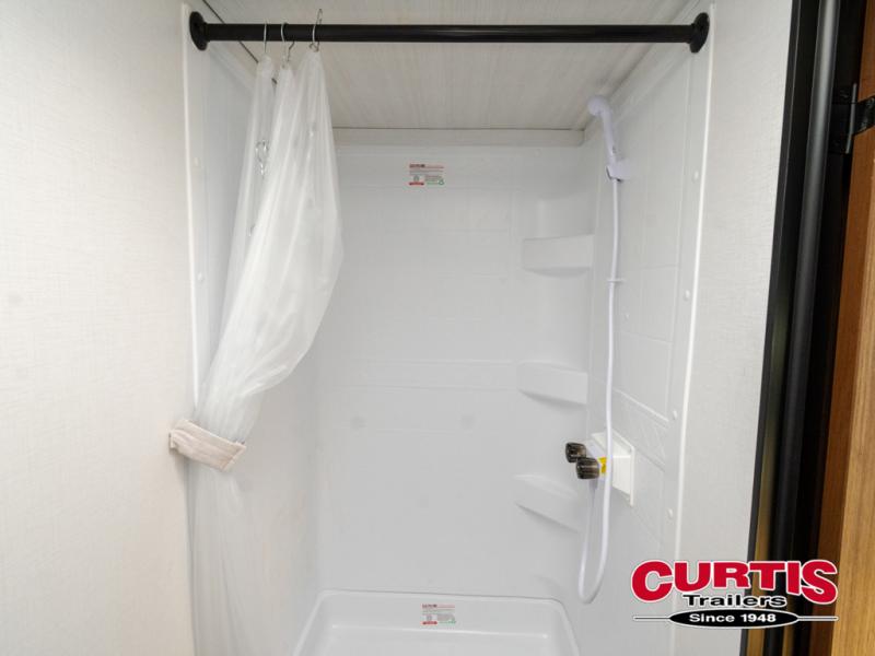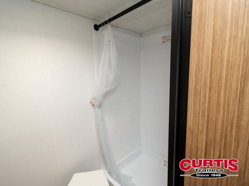This is the perfect couple's trailer for weekend trips to the campground. You can set up the patio awning when you arrive, then unload the pass-thru storage before heading out on a trail. The full rear bath inside will let you freshen up when you get back, and there is a jack knife sofa slide where you can relax in the air conditioning. A two burner range and microwave oven lets you make dinner when you're hungry, and a large double door 12V refrigerator will be perfect to keep food fresh. This unit also includes a front queen bed with dual wardrobes and nightstands plus a privacy curtain if you have someone staying over on the sofa!