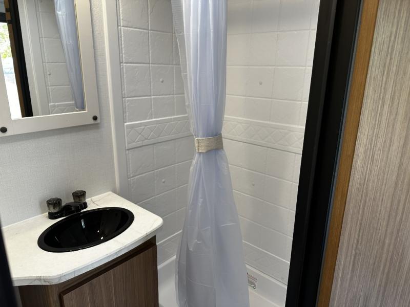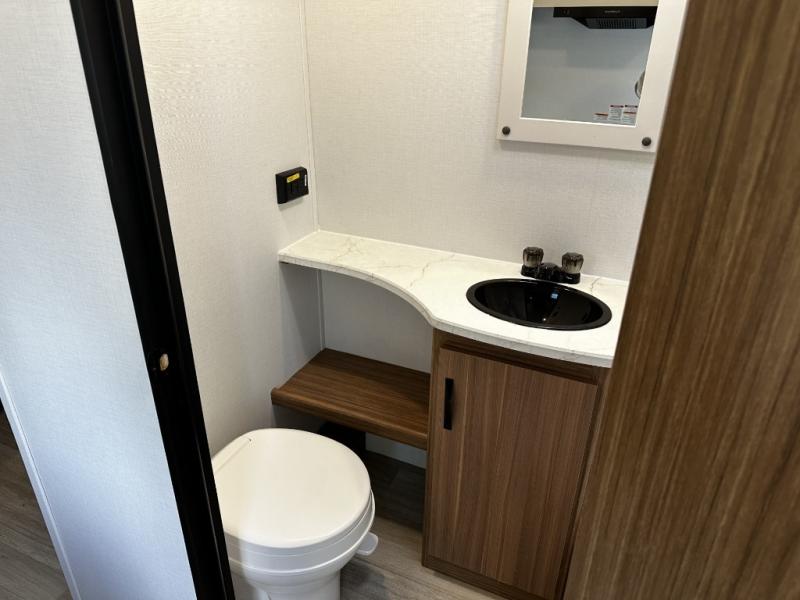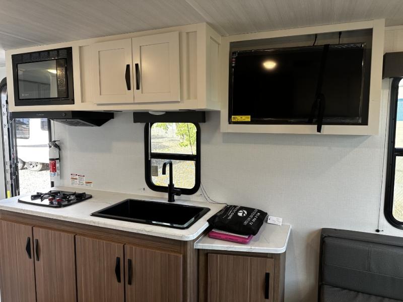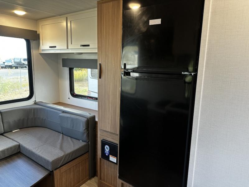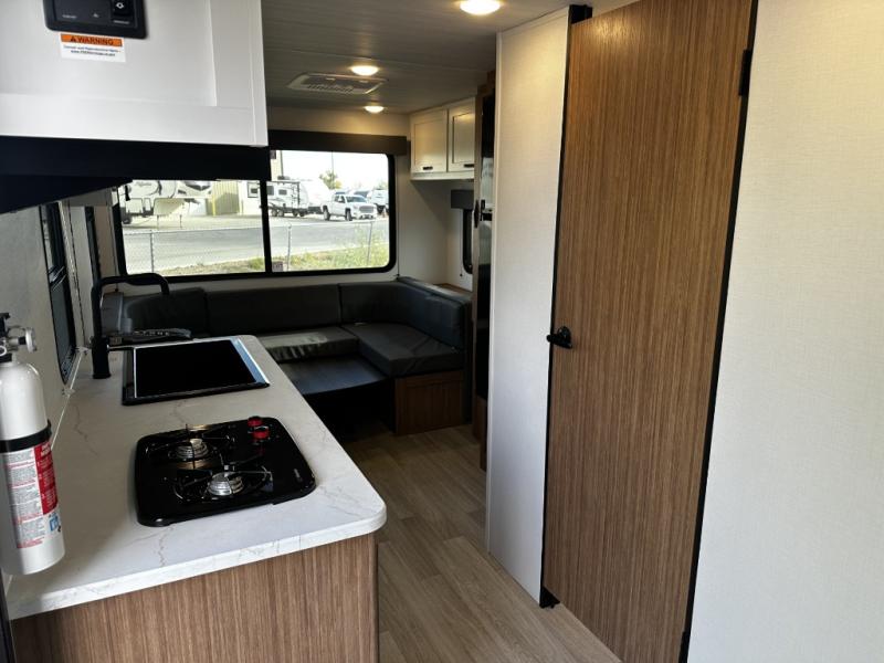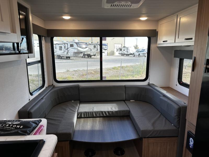 Pack your bags and hitch up this travel trailer for a fun weekend excursion! You can get a good night's sleep on the front queen bed with a wardrobe at the foot of the bed, and overhead cabinets above it for your items. You can also transform the U-shaped dinette with a counter next to it into an extra sleeping space. The chef of your group can make meals on the two burner range or in the microwave if you're on the go. There is also a large double door 12V refrigerator and pantry for food storage. Outside, you can relax underneath the patio awning and store all of your gear in the front exterior pass-through storage area!