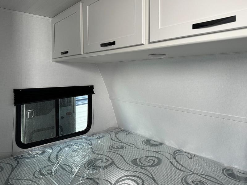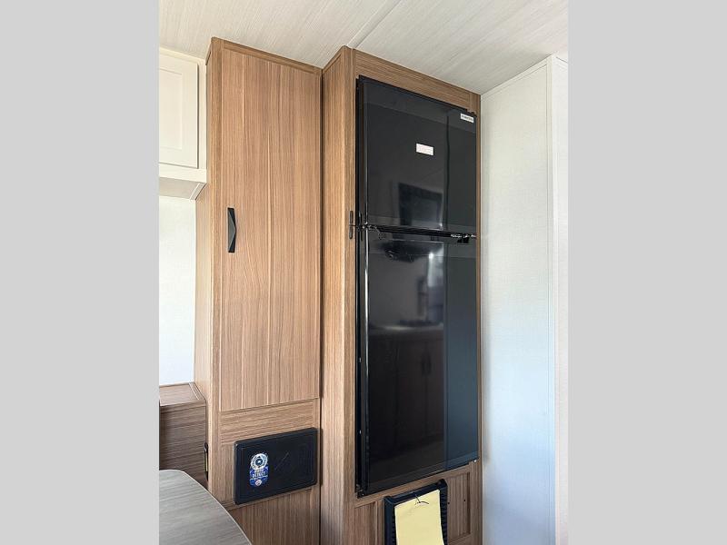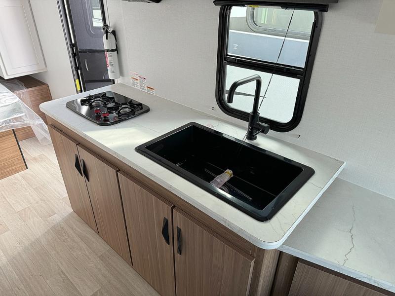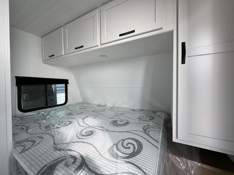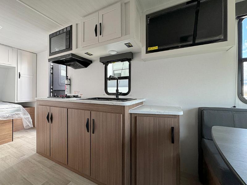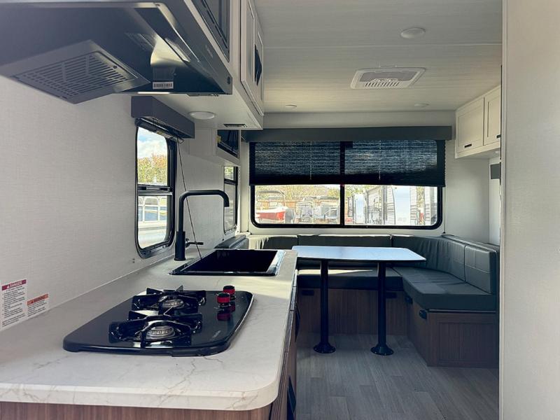 Pack your bags and hitch up this travel trailer for a fun weekend excursion! You can get a good night's sleep on the front queen bed with a wardrobe at the foot of the bed, and overhead cabinets above it for your items. You can also transform the U-shaped dinette with a counter next to it into an extra sleeping space. The chef of your group can make meals on the two burner range or in the microwave if you're on the go. There is also a large double door 12V refrigerator and pantry for food storage. Outside, you can relax underneath the patio awning and store all of your gear in the front exterior pass-through storage area!