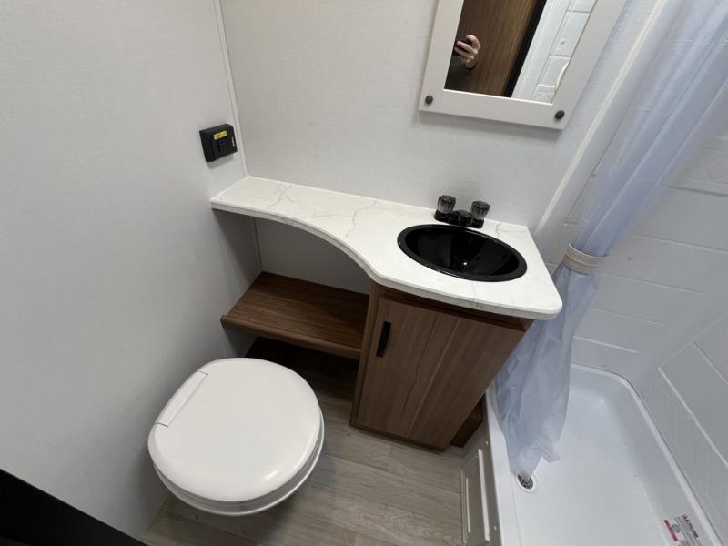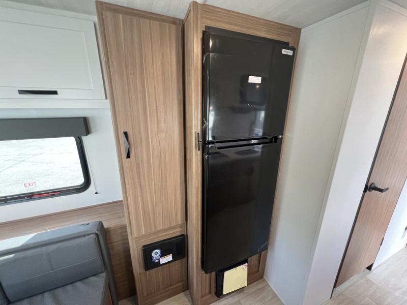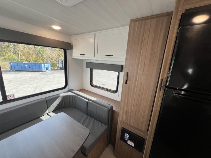 Pack your bags and hitch up this travel trailer for a fun weekend excursion! You can get a good night's sleep on the front queen bed with a wardrobe at the foot of the bed, and overhead cabinets above it for your items. You can also transform the U-shaped dinette with a counter next to it into an extra sleeping space. The chef of your group can make meals on the two burner range or in the microwave if you're on the go. There is also a large double door 12V refrigerator and pantry for food storage. Outside, you can relax underneath the patio awning and store all of your gear in the front exterior pass-through storage area!