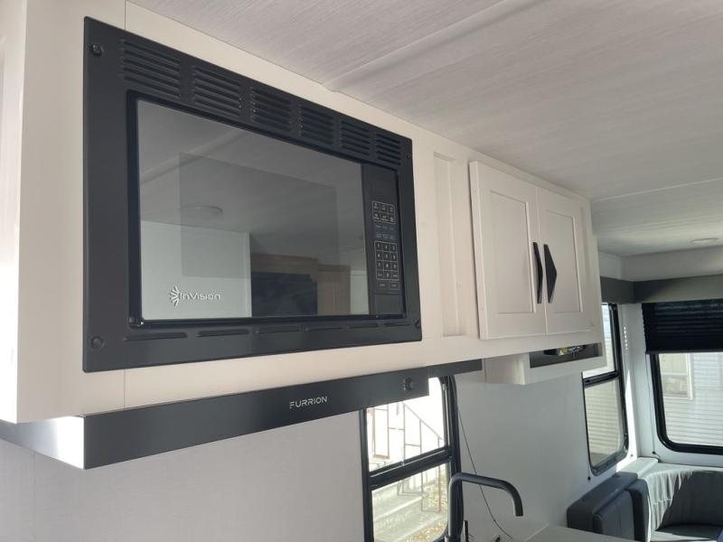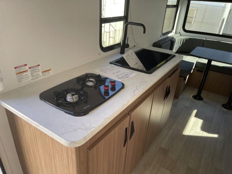Pack your bags and hitch up this travel trailer for a fun weekend excursion! You can get a good night's sleep on the front queen bed with a wardrobe at the foot of the bed, and overhead cabinets above it for your items. You can also transform the U-shaped dinette with a counter next to it into an extra sleeping space. The chef of your group can make meals on the two burner range or in the microwave if you're on the go. There is also a large double door 12V refrigerator and pantry for food storage. Outside, you can relax underneath the patio awning and store all of your gear in the front exterior pass-through storage area!
