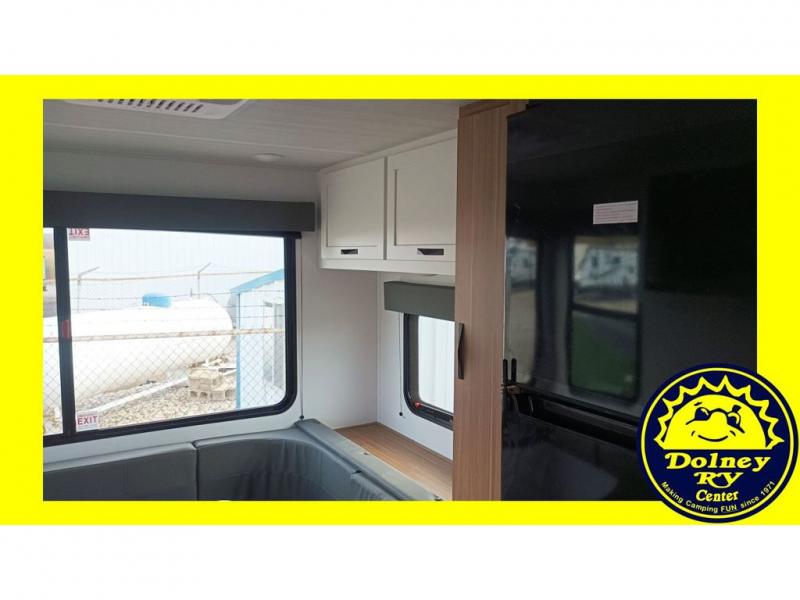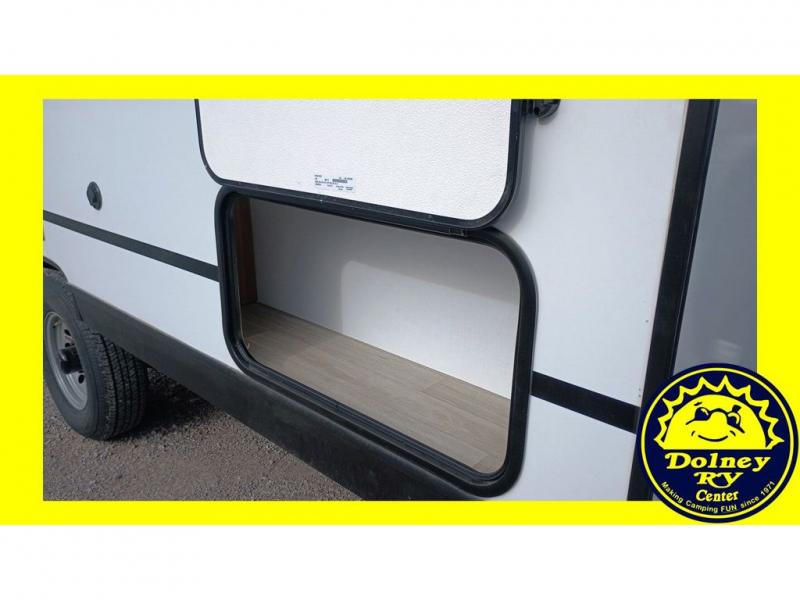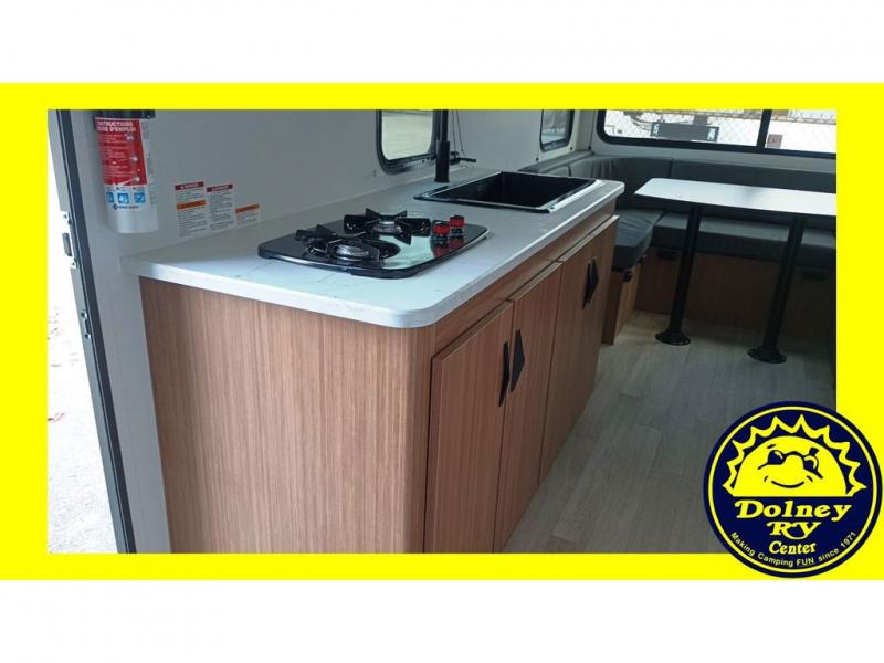 Pack your bags and hitch up this travel trailer for a fun weekend excursion! You can get a good night's sleep on the front queen bed with a wardrobe at the foot of the bed, and overhead cabinets above it for your items. You can also transform the U-shaped dinette with a counter next to it into an extra sleeping space. The chef of your group can make meals on the two burner range or in the microwave if you're on the go. There is also a large double door 12V refrigerator and pantry for food storage. Outside, you can relax underneath the patio awning and store all of your gear in the front exterior pass-through storage area!