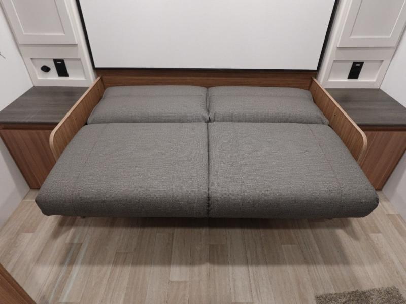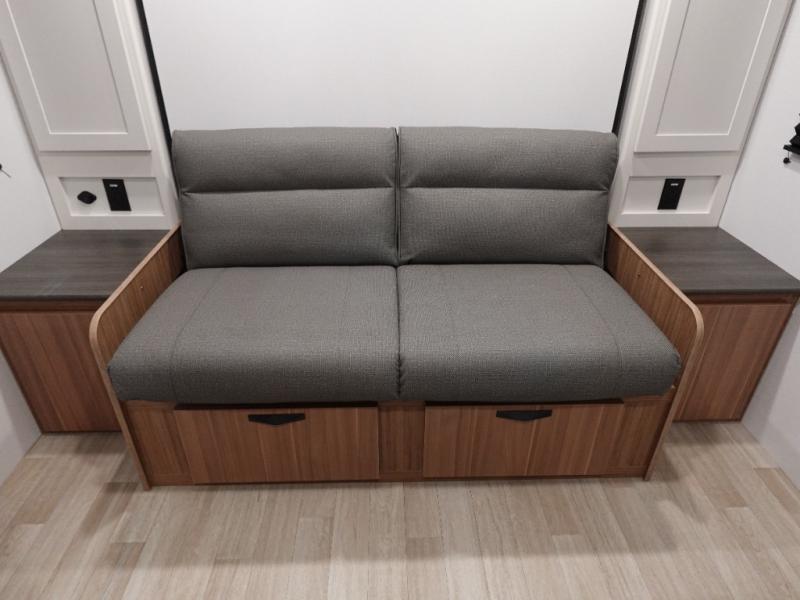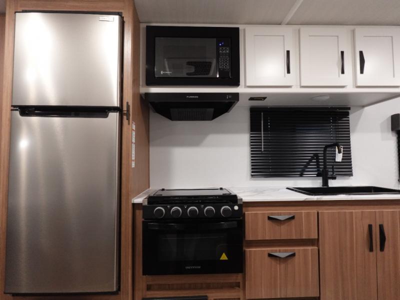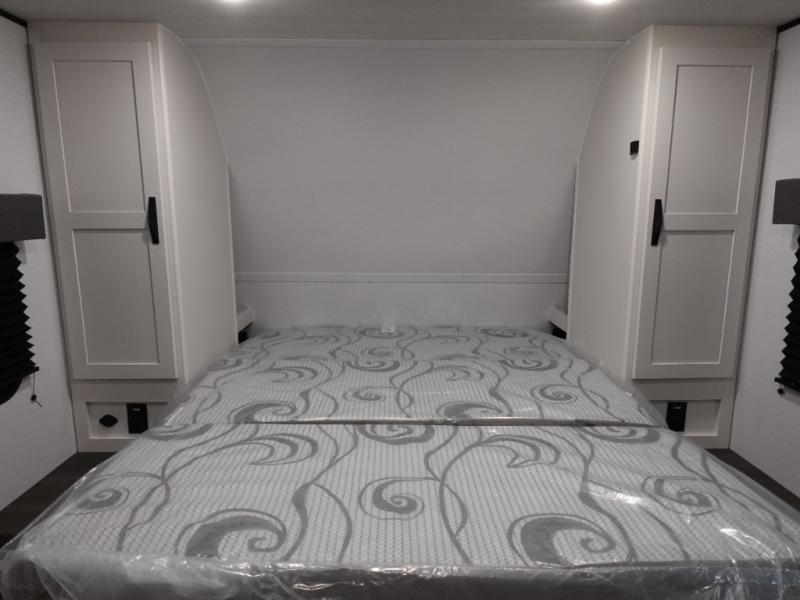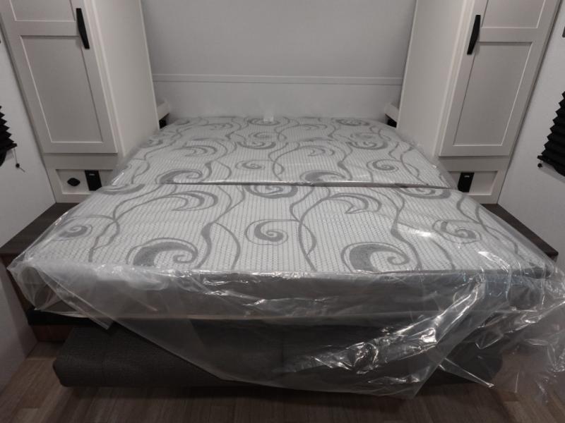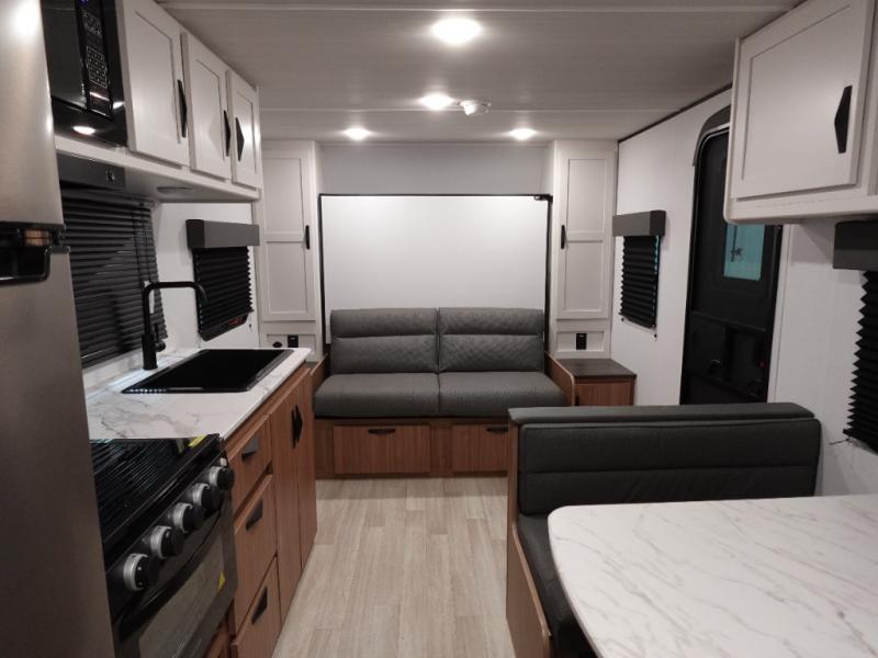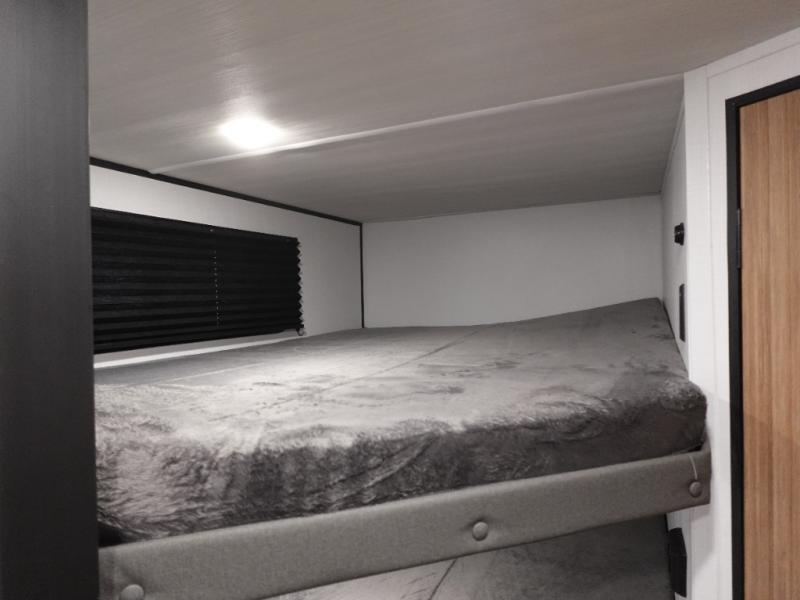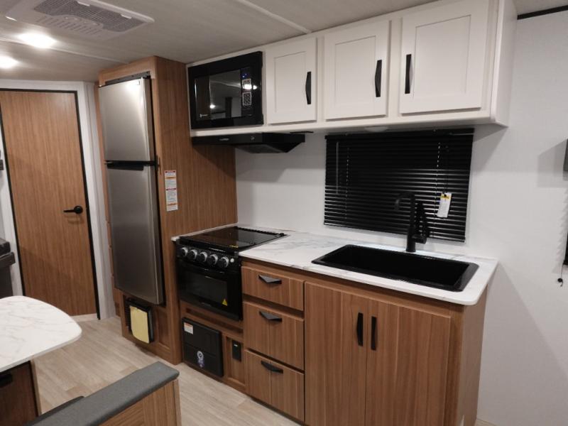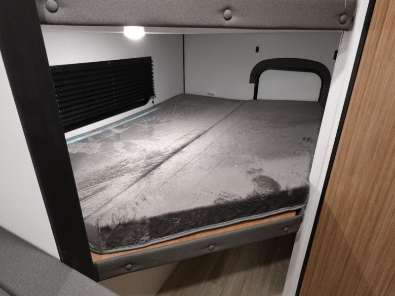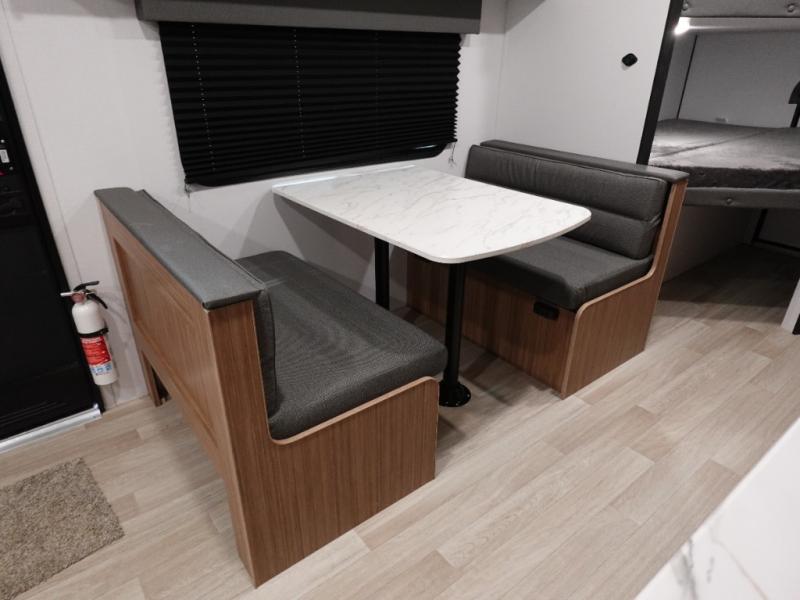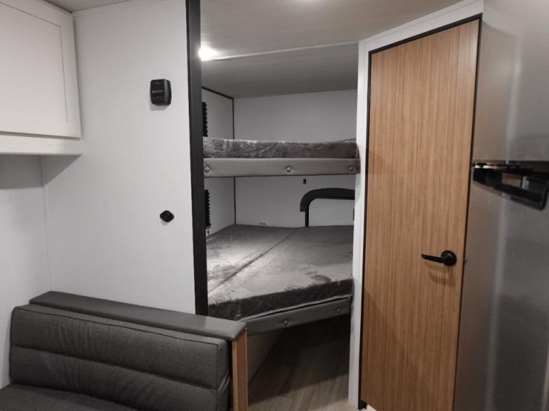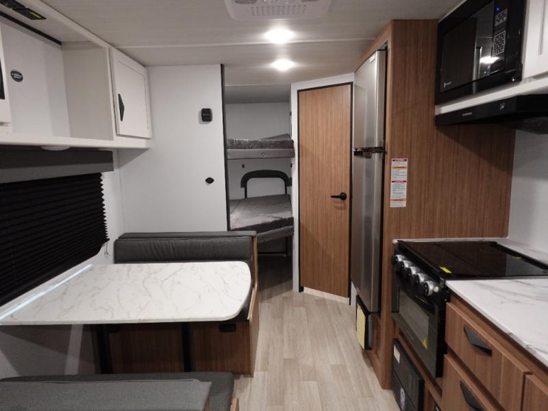 Your kids will love this travel trailer! The double-size bunks provide comfortable sleeping quarters, while the booth dinette offers a cozy spot for meals and relaxation. The full bathroom features everything you need to take care of yourself and is convenient on the go, plus, a refrigerator, microwave, and two-burner cooktop make meal prep a breeze. The overhead cabinets and pantry provide ample storage for your favorite spices and belongings. Moreover, the murphy bed offers additional sleeping space, and the wardrobe and nightstand on each side of the bed provide convenient storage and comfort. On the outside, you will find A 17' awning that provides shade and protection, while pass-thru storage offers additional space for gear and equipment.