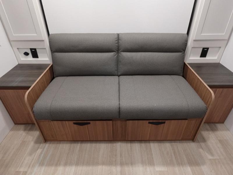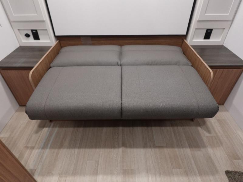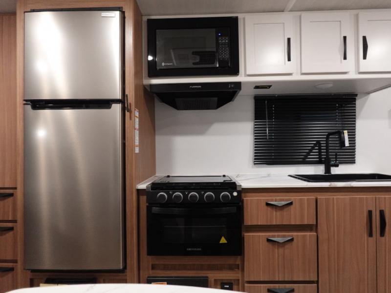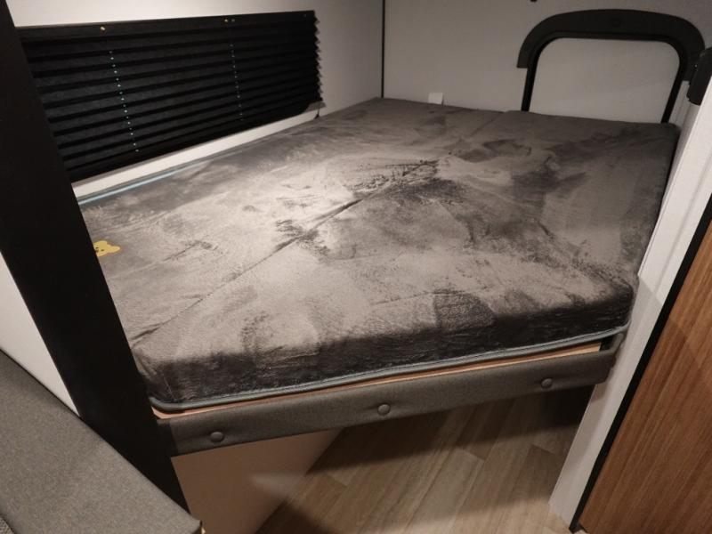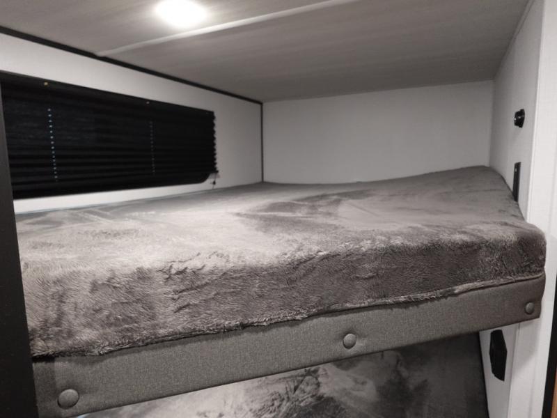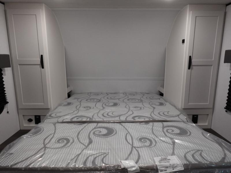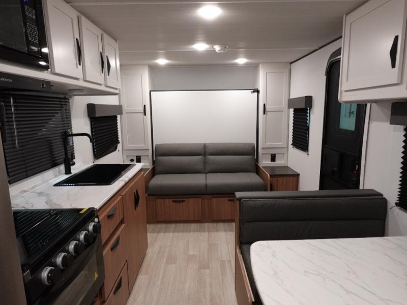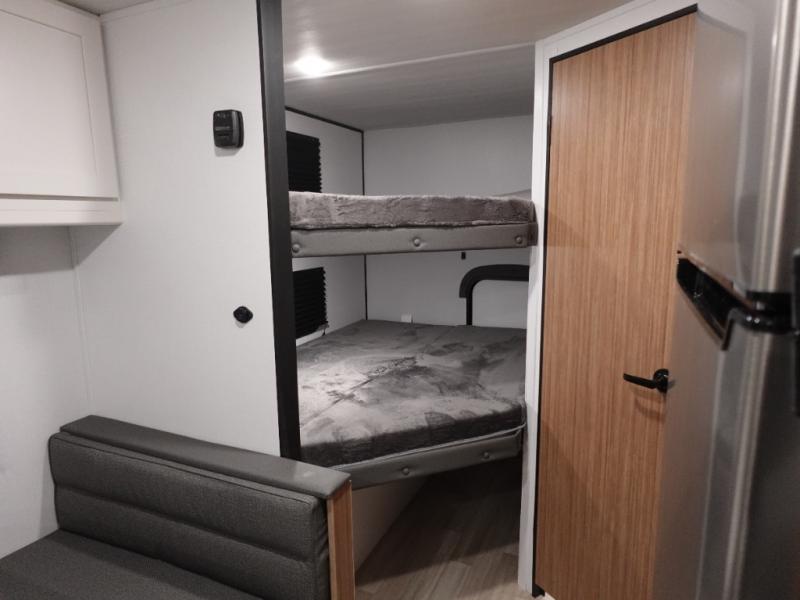Your kids will love this travel trailer! The double-size bunks provide comfortable sleeping quarters, while the booth dinette offers a cozy spot for meals and relaxation. The full bathroom features everything you need to take care of yourself and is convenient on the go, plus, a refrigerator, microwave, and two-burner cooktop make meal prep a breeze. The overhead cabinets and pantry provide ample storage for your favorite spices and belongings. Moreover, the murphy bed offers additional sleeping space, and the wardrobe and nightstand on each side of the bed provide convenient storage and comfort. On the outside, you will find A 17' awning that provides shade and protection, while pass-thru storage offers additional space for gear and equipment.