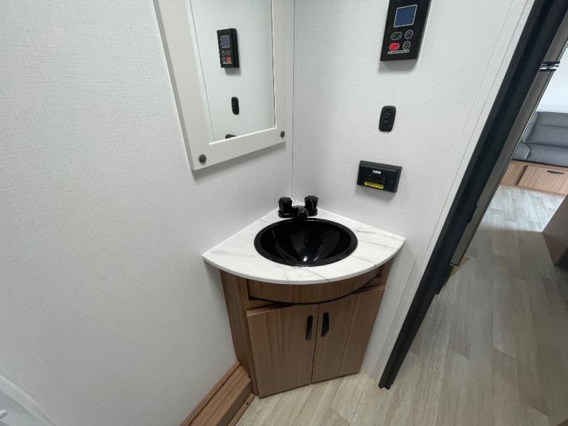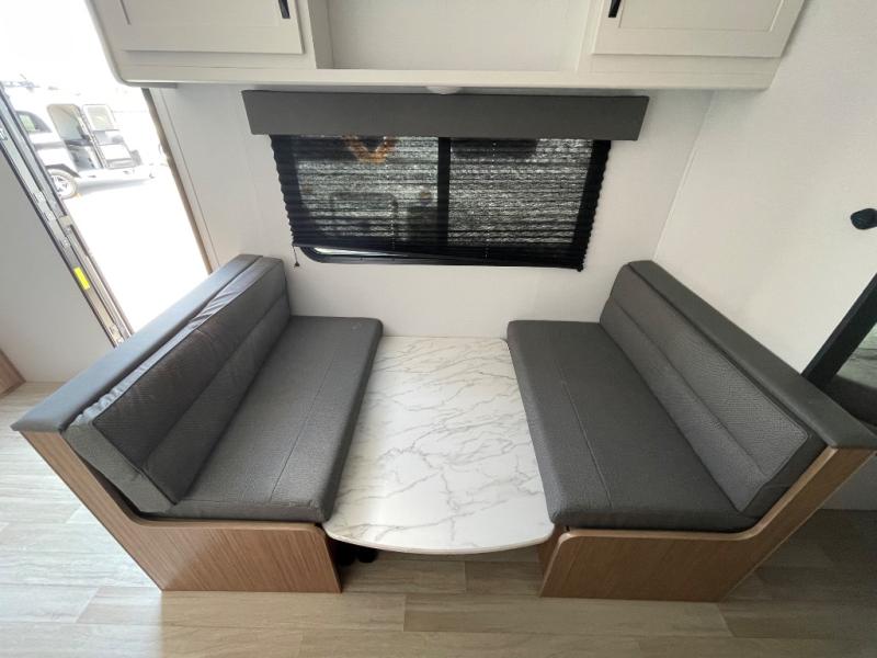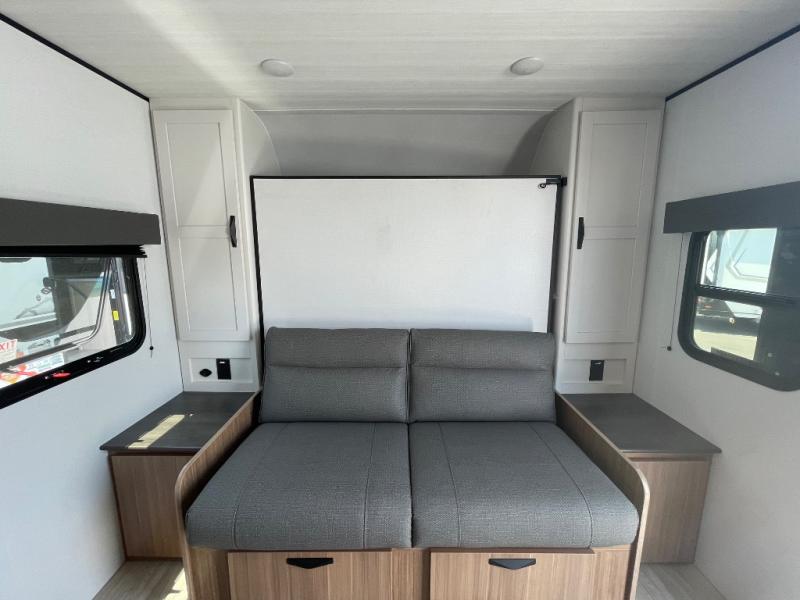Your kids will love this travel trailer! The double-size bunks provide comfortable sleeping quarters, while the booth dinette offers a cozy spot for meals and relaxation. The full bathroom features everything you need to take care of yourself and is convenient on the go, plus, a refrigerator, microwave, and two-burner cooktop make meal prep a breeze. The overhead cabinets and pantry provide ample storage for your favorite spices and belongings. Moreover, the murphy bed offers additional sleeping space, and the wardrobe and nightstand on each side of the bed provide convenient storage and comfort. On the outside, you will find A 17' awning that provides shade and protection, while pass-thru storage offers additional space for gear and equipment.