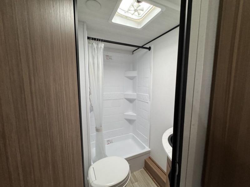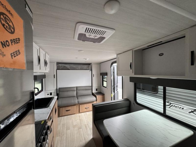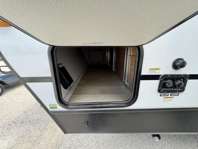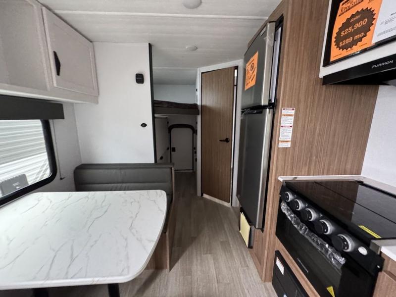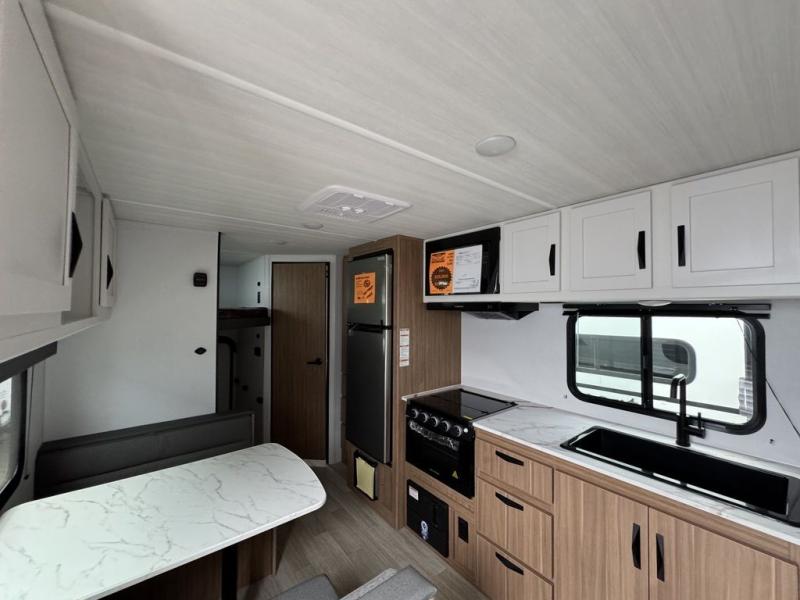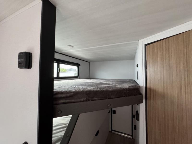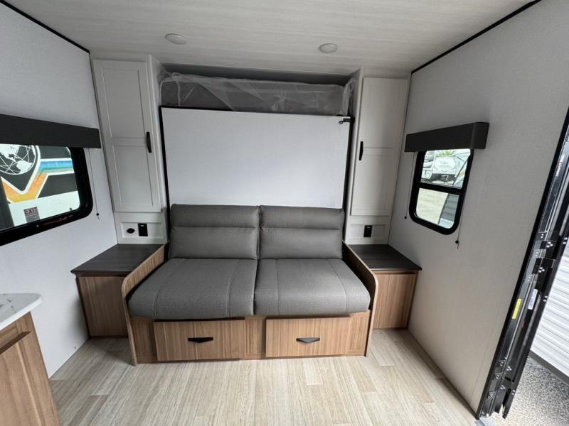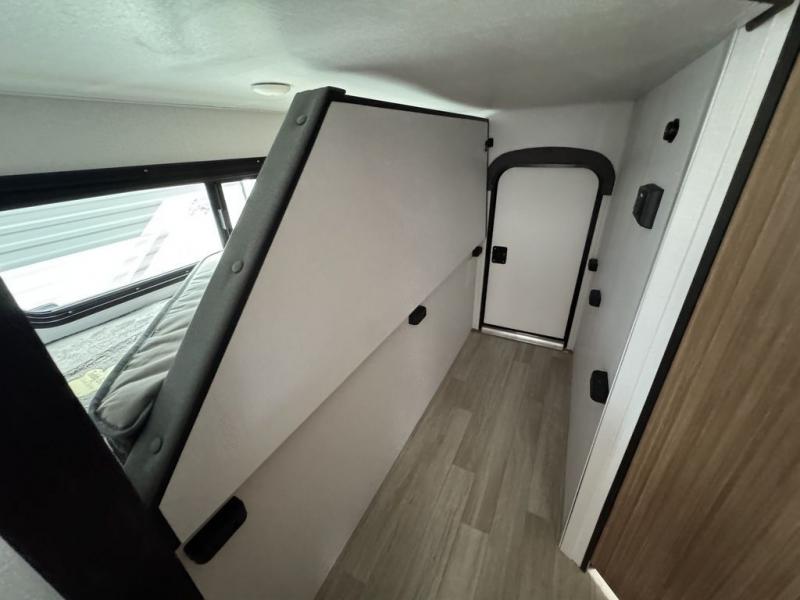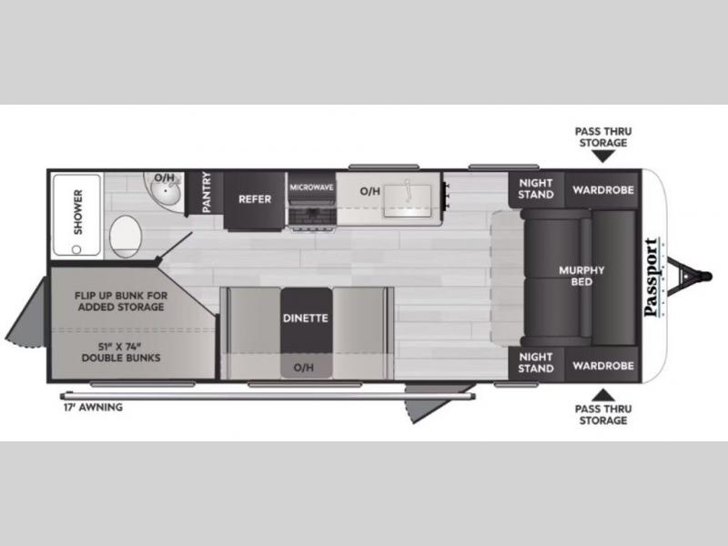 Your kids will love this travel trailer! The double-size bunks provide comfortable sleeping quarters, while the booth dinette offers a cozy spot for meals and relaxation. The full bathroom features everything you need to take care of yourself and is convenient on the go, plus, a refrigerator, microwave, and two-burner cooktop make meal prep a breeze. The overhead cabinets and pantry provide ample storage for your favorite spices and belongings. Moreover, the murphy bed offers additional sleeping space, and the wardrobe and nightstand on each side of the bed provide convenient storage and comfort. On the outside, you will find A 17' awning that provides shade and protection, while pass-thru storage offers additional space for gear and equipment.