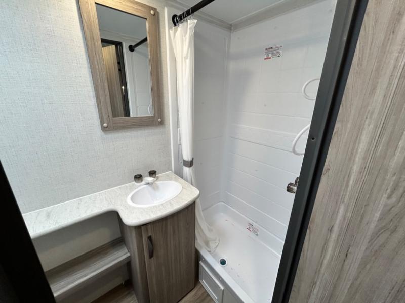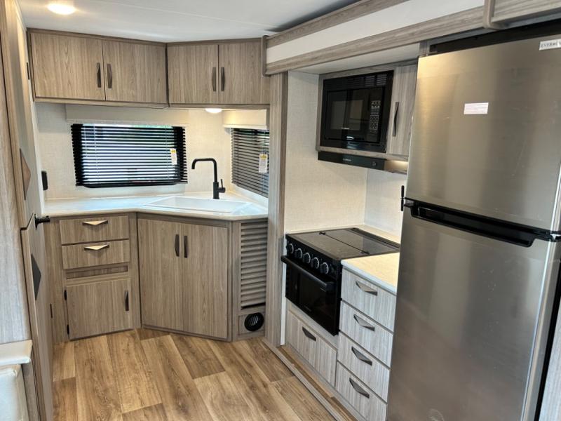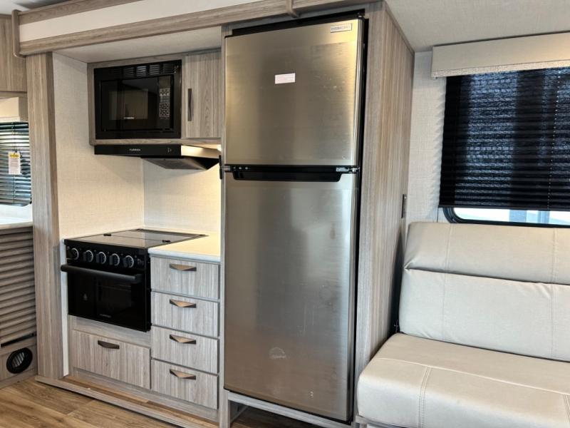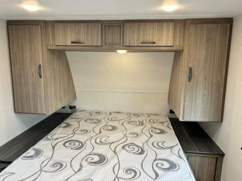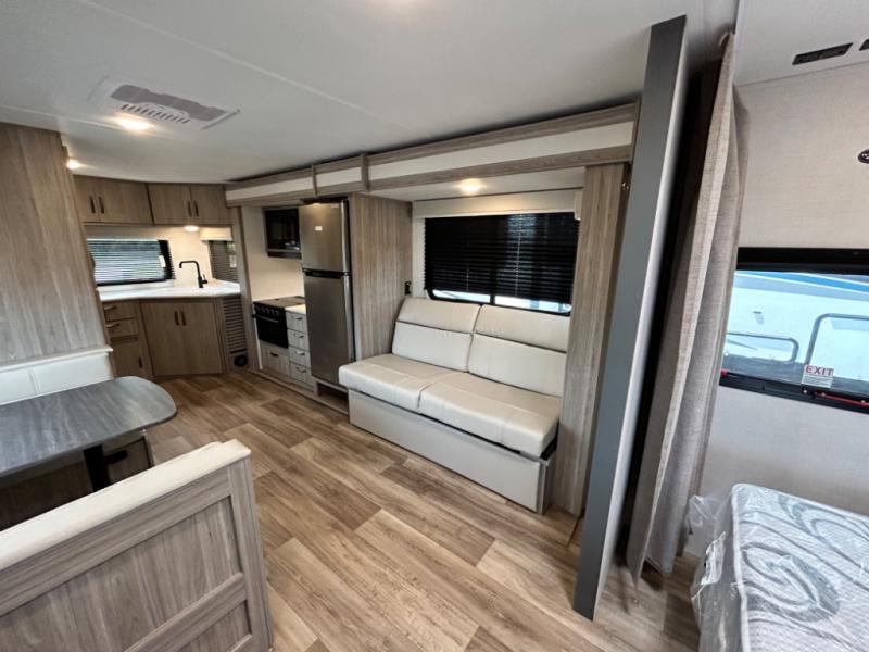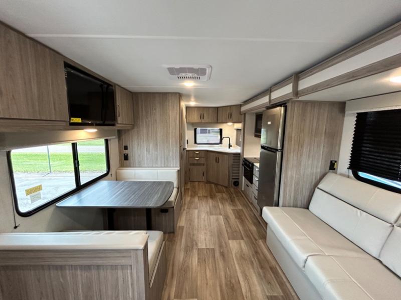 Are you ready to escape the hustle and bustle of the city life? This travel trailer will provide at-home comforts while at the campground! You will have a front queen bed with dual nightstands and wardrobes to keep your space tidy plus a privacy curtain that can be closed off if you have guests staying over on the jack knife sofa and booth dinette. The large slide out will let everyone move about freely, and the full bath onboard is sure to be appreciated. And don't overlook the rear corner kitchen with ample counter space to prep meals!