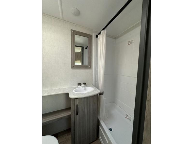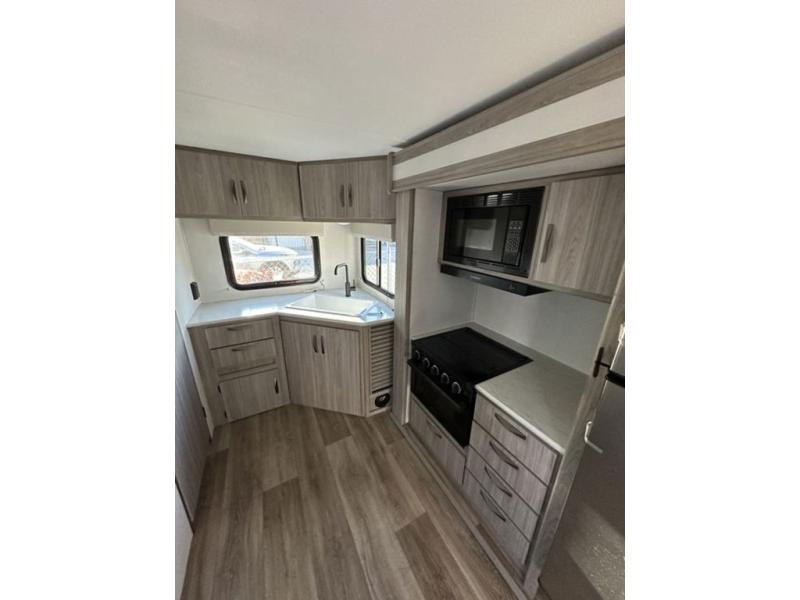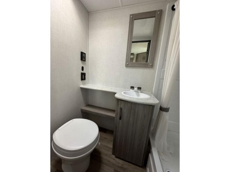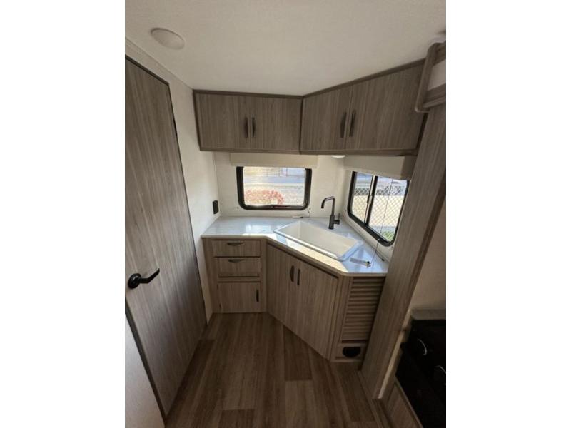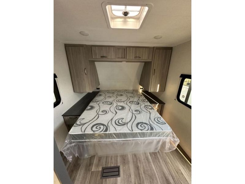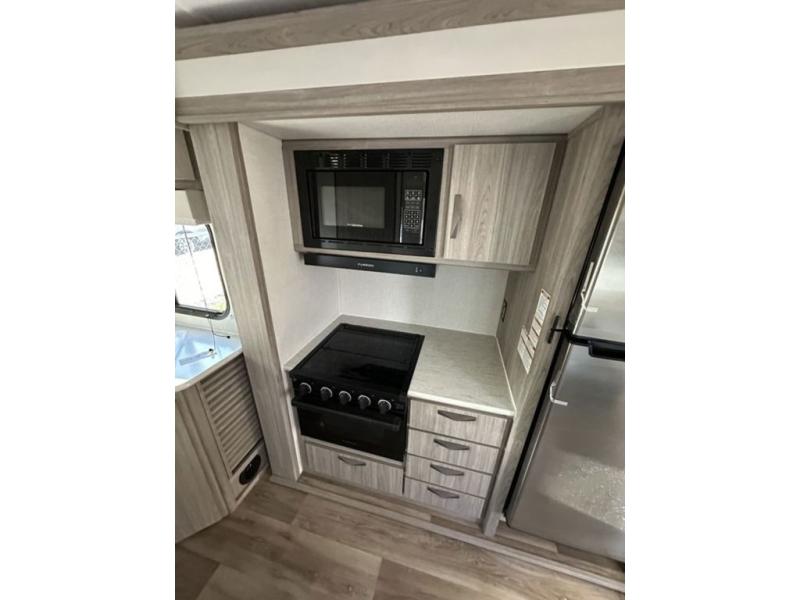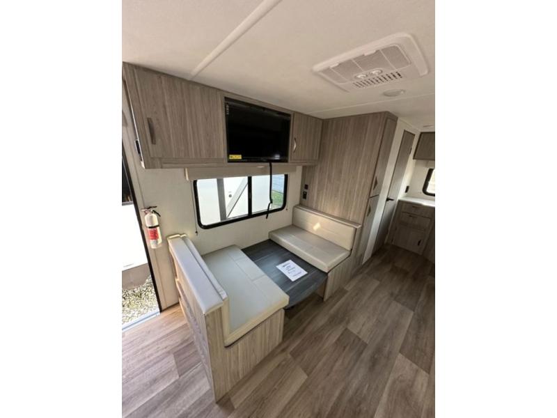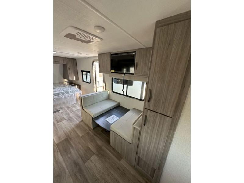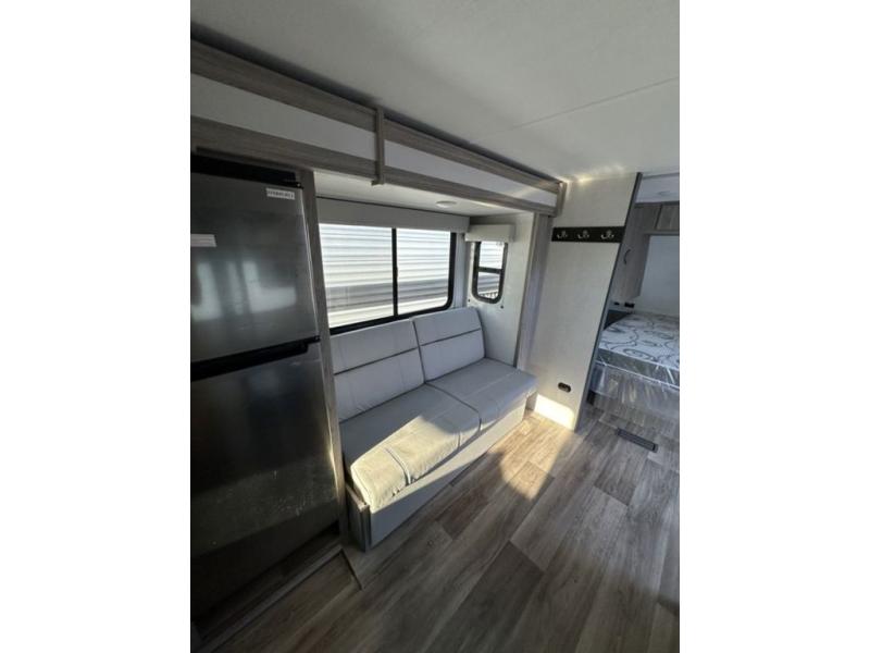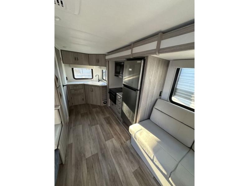 Are you ready to escape the hustle and bustle of the city life? This travel trailer will provide at-home comforts while at the campground! You will have a front queen bed with dual nightstands and wardrobes to keep your space tidy plus a privacy curtain that can be closed off if you have guests staying over on the jack knife sofa and booth dinette. The large slide out will let everyone move about freely, and the full bath onboard is sure to be appreciated. And don't overlook the rear corner kitchen with ample counter space to prep meals!