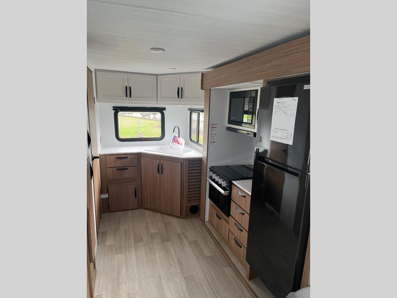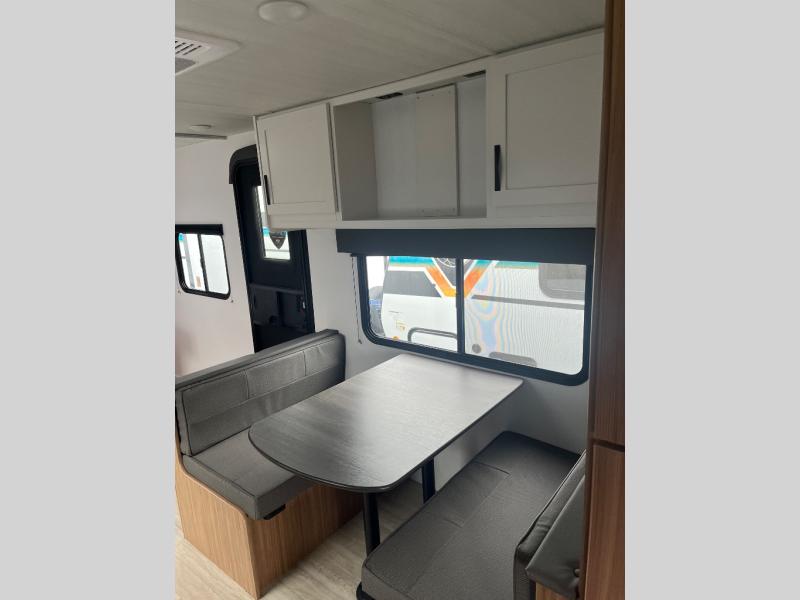 Are you ready to escape the hustle and bustle of the city life? This travel trailer will provide at-home comforts while at the campground! You will have a front queen bed with dual nightstands and wardrobes to keep your space tidy plus a privacy curtain that can be closed off if you have guests staying over on the jack knife sofa and booth dinette. The large slide out will let everyone move about freely, and the full bath onboard is sure to be appreciated. And don't overlook the rear corner kitchen with ample counter space to prep meals!
