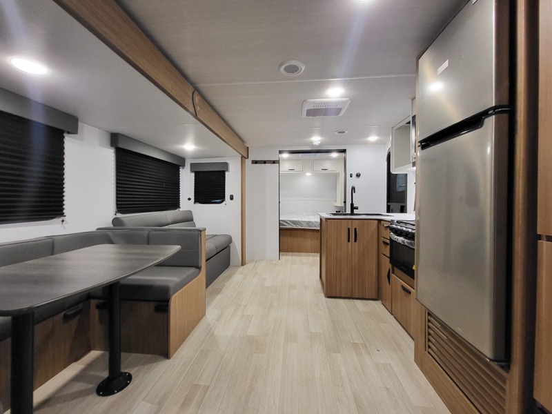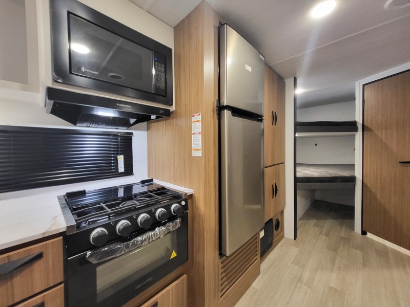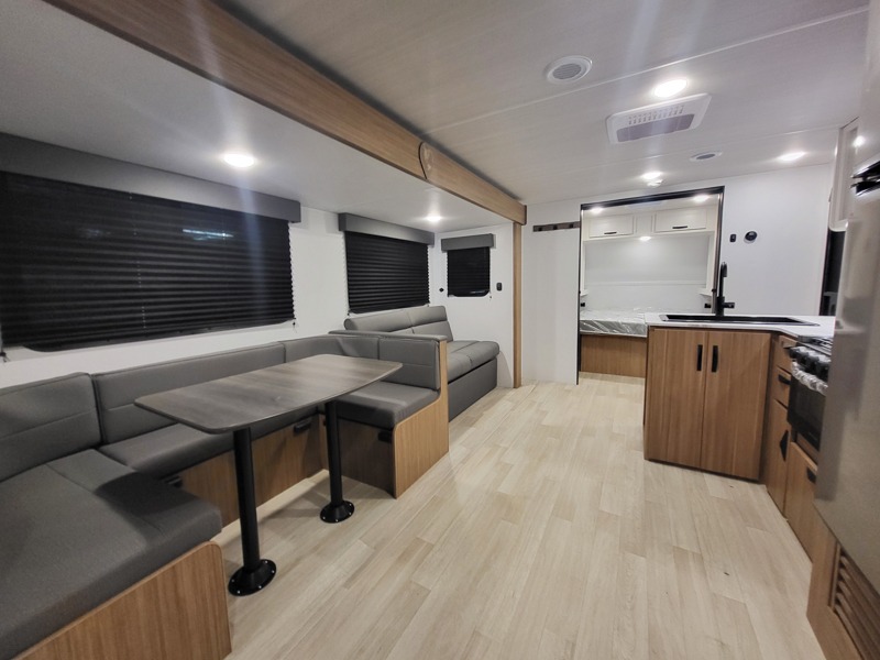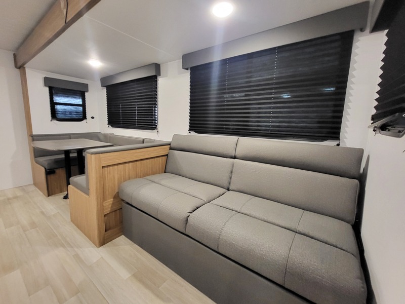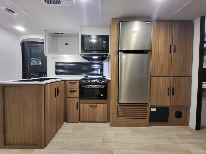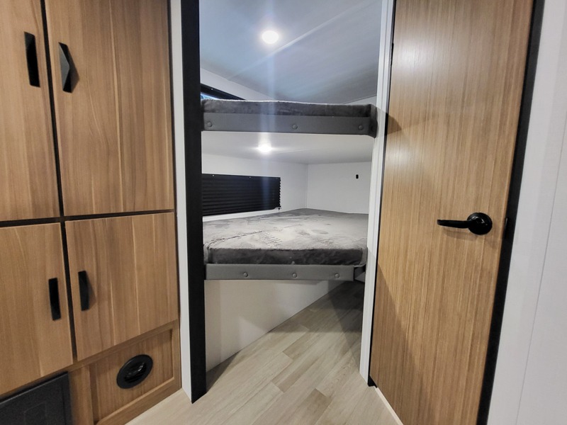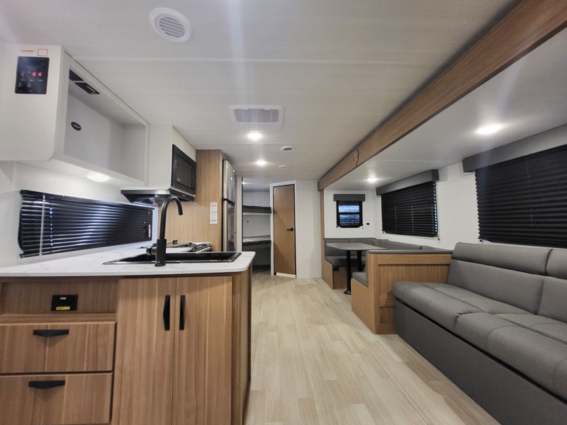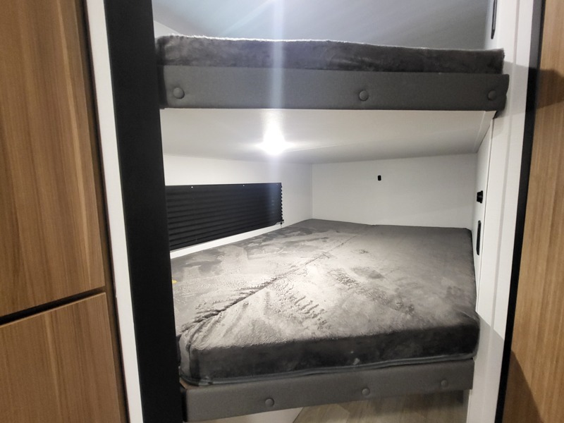 The whole gang will want to join along on camping trips in this spacious travel trailer. There are double-size bunks with a flip-up bunk for added storage plus a pass-thru storage for hiking or fishing gear. The combined living area and kitchen includes a U-shaped dinette and jack knife sofa within a large slide out, which will give the dog more space to nap on the floor. A fully-equipped kitchen includes a two burner cooktop, microwave oven, and large double door 12V refrigerator for perishables. You will also enjoy having your own space up front in the semi-private bedroom with a privacy curtain, queen bed, and dual wardrobes to keep your clothes out of the way!