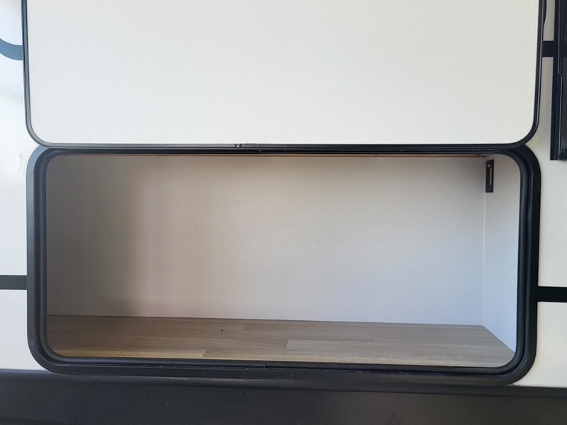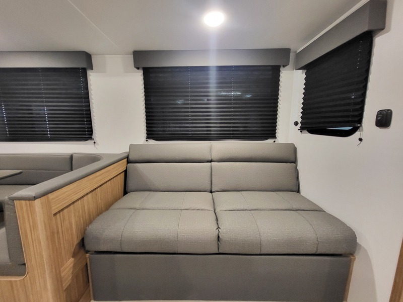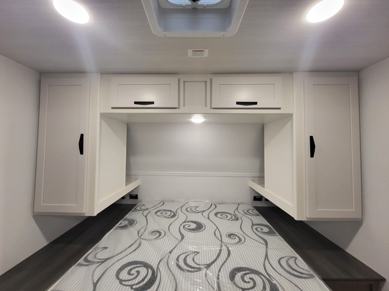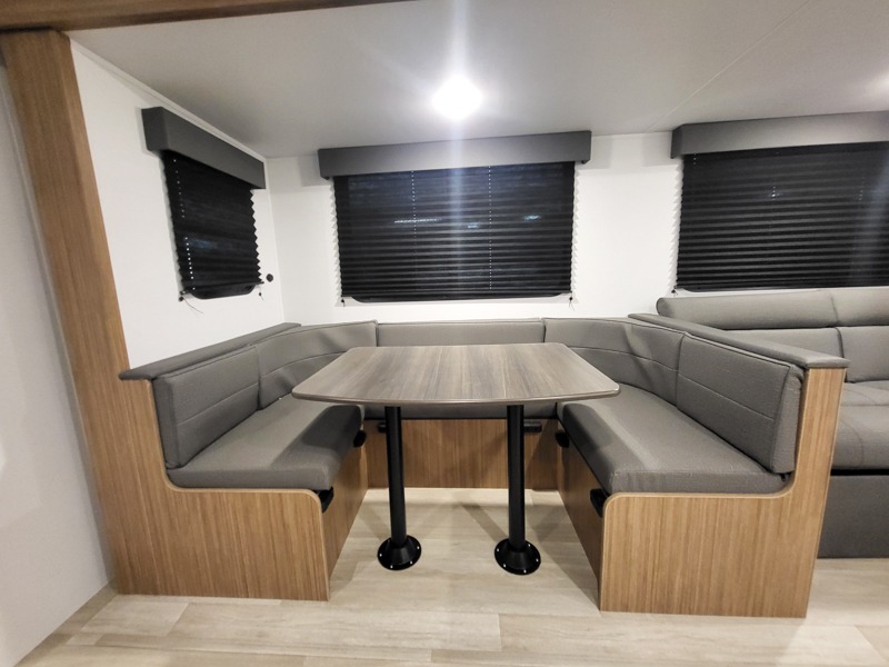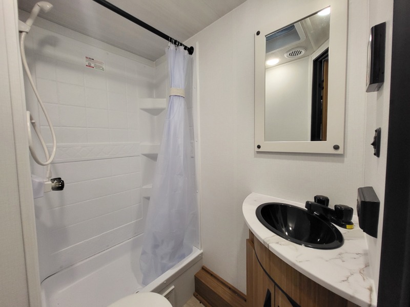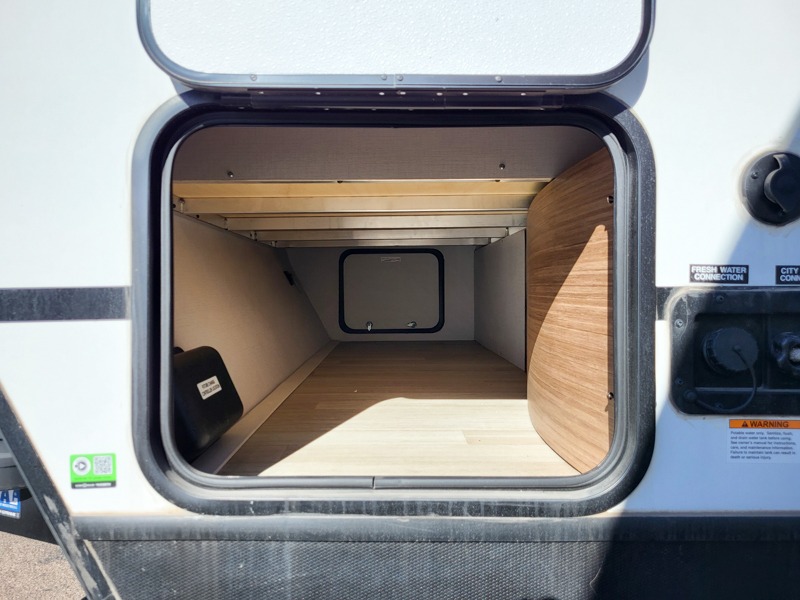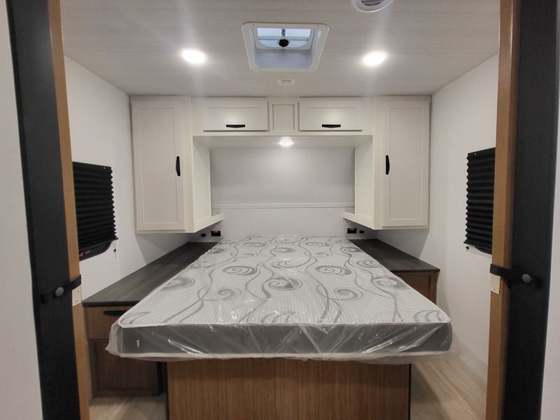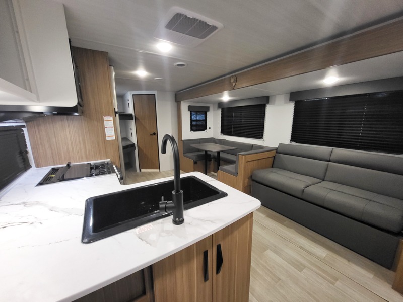 The whole gang will want to join along on camping trips in this spacious travel trailer. There are double-size bunks with a flip-up bunk for added storage plus a pass-thru storage for hiking or fishing gear. The combined living area and kitchen includes a U-shaped dinette and jack knife sofa within a large slide out, which will give the dog more space to nap on the floor. A fully-equipped kitchen includes a two burner cooktop, microwave oven, and large double door 12V refrigerator for perishables. You will also enjoy having your own space up front in the semi-private bedroom with a privacy curtain, queen bed, and dual wardrobes to keep your clothes out of the way!