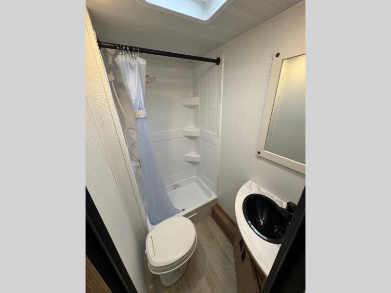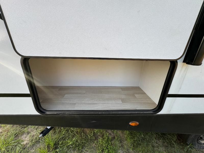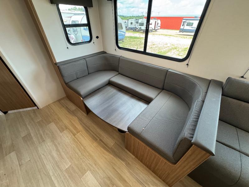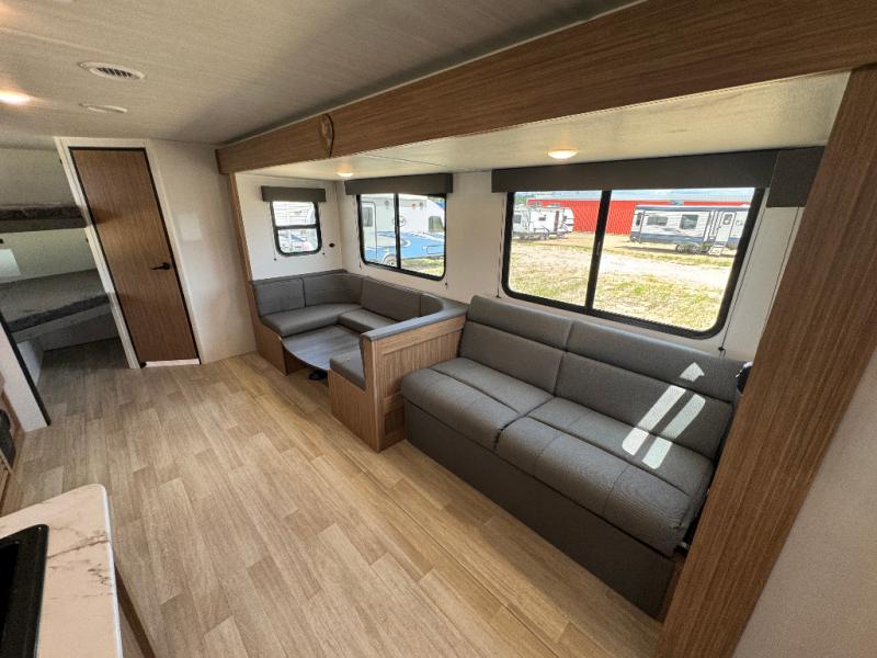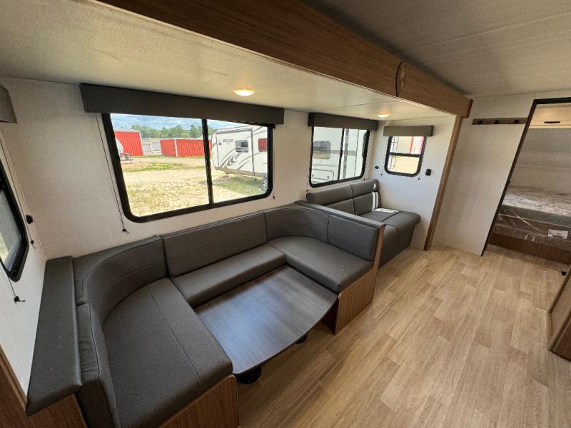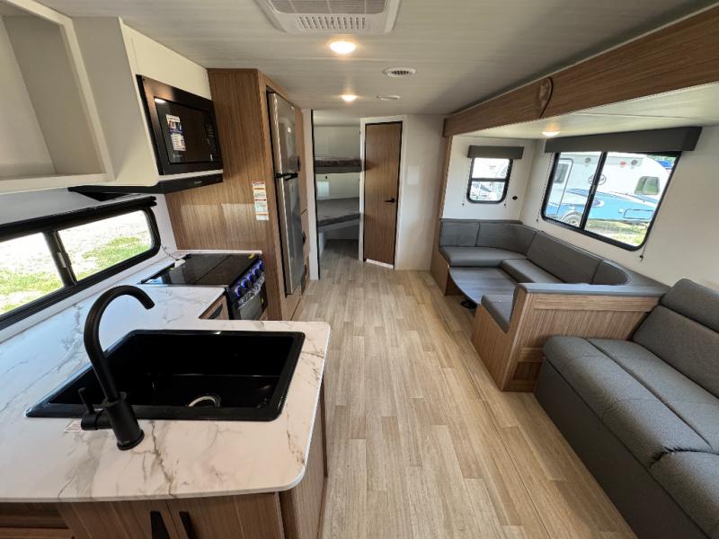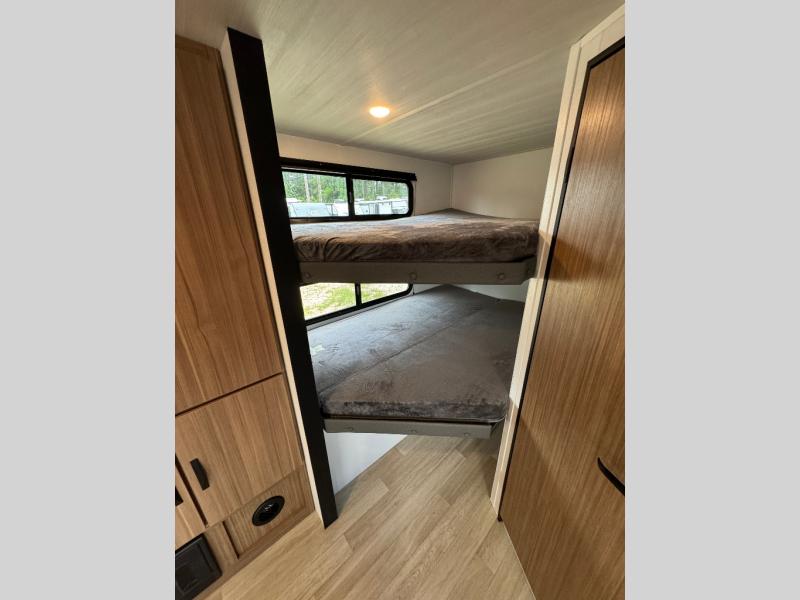 The whole gang will want to join along on camping trips in this spacious travel trailer. There are double-size bunks with a flip-up bunk for added storage plus a pass-thru storage for hiking or fishing gear. The combined living area and kitchen includes a U-shaped dinette and jack knife sofa within a large slide out, which will give the dog more space to nap on the floor. A fully-equipped kitchen includes a two burner cooktop, microwave oven, and large double door 12V refrigerator for perishables. You will also enjoy having your own space up front in the semi-private bedroom with a privacy curtain, queen bed, and dual wardrobes to keep your clothes out of the way!