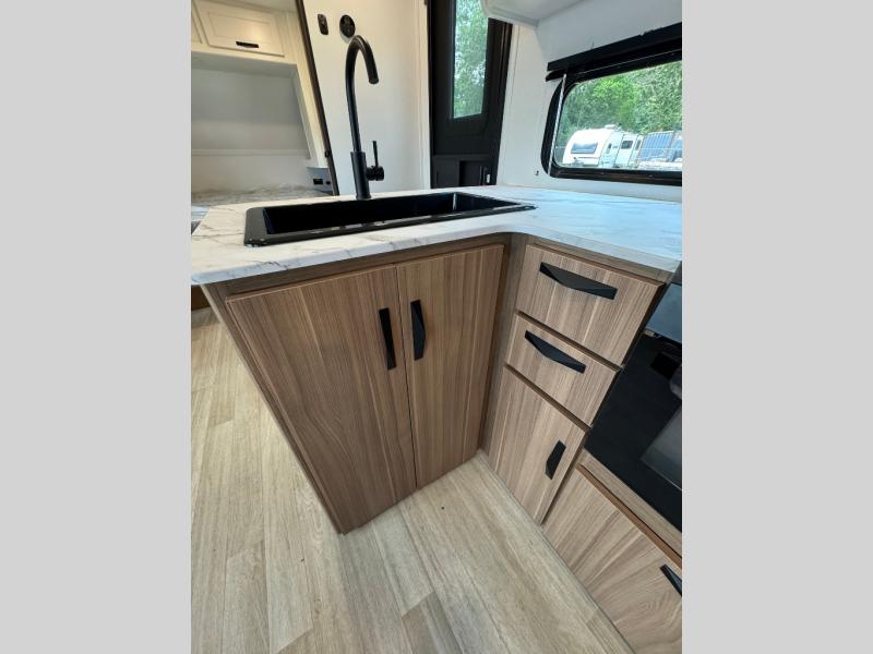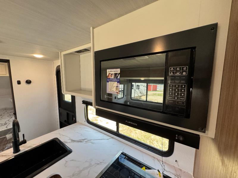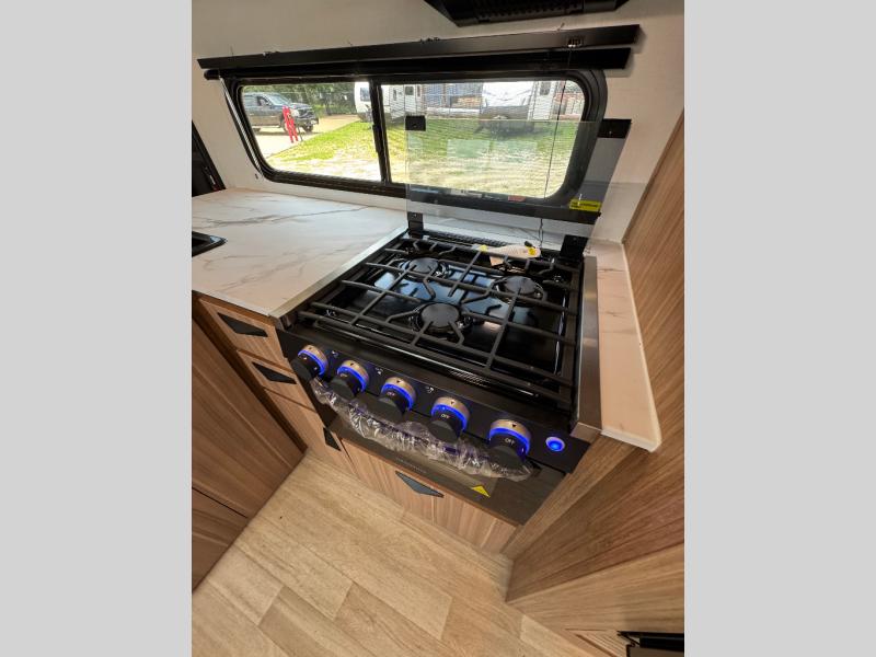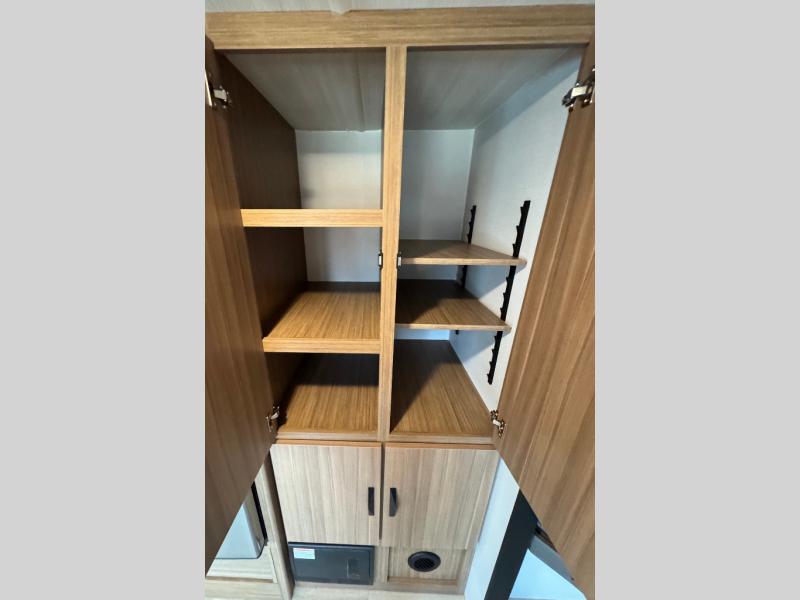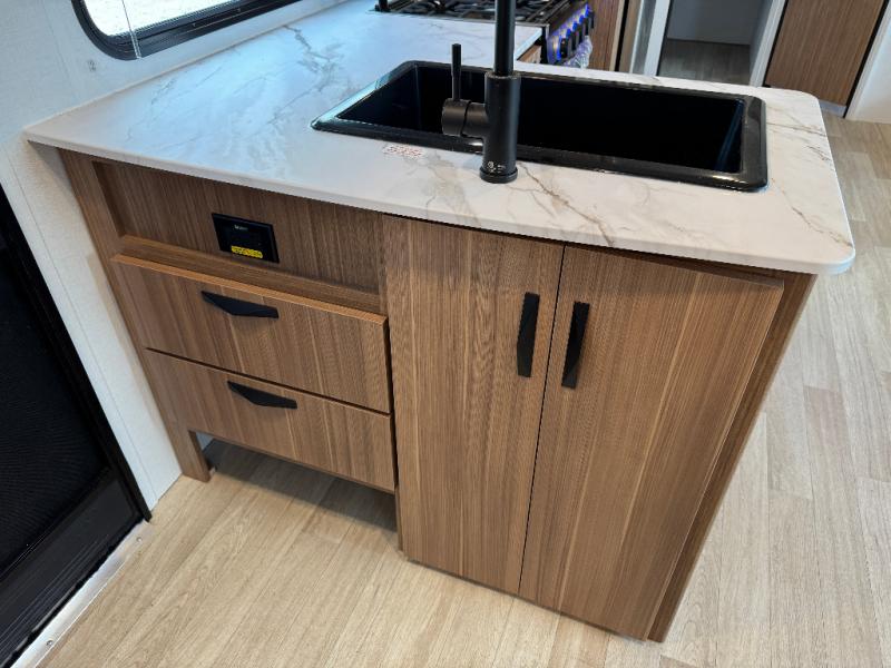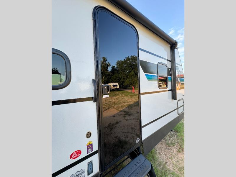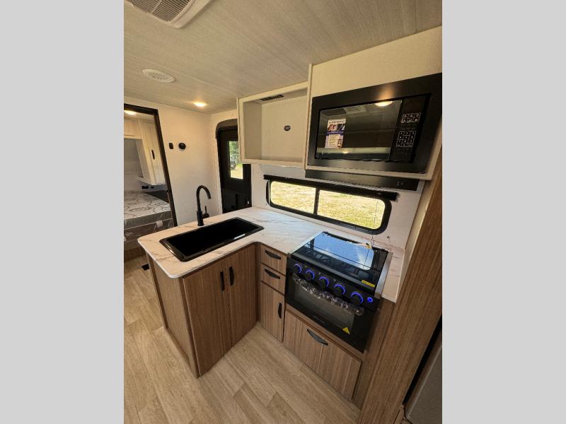 The whole gang will want to join along on camping trips in this spacious travel trailer. There are double-size bunks with a flip-up bunk for added storage plus a pass-thru storage for hiking or fishing gear. The combined living area and kitchen includes a U-shaped dinette and jack knife sofa within a large slide out, which will give the dog more space to nap on the floor. A fully-equipped kitchen includes a two burner cooktop, microwave oven, and large double door 12V refrigerator for perishables. You will also enjoy having your own space up front in the semi-private bedroom with a privacy curtain, queen bed, and dual wardrobes to keep your clothes out of the way!