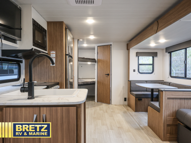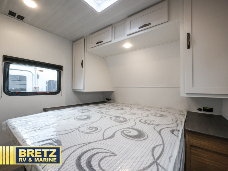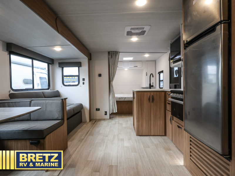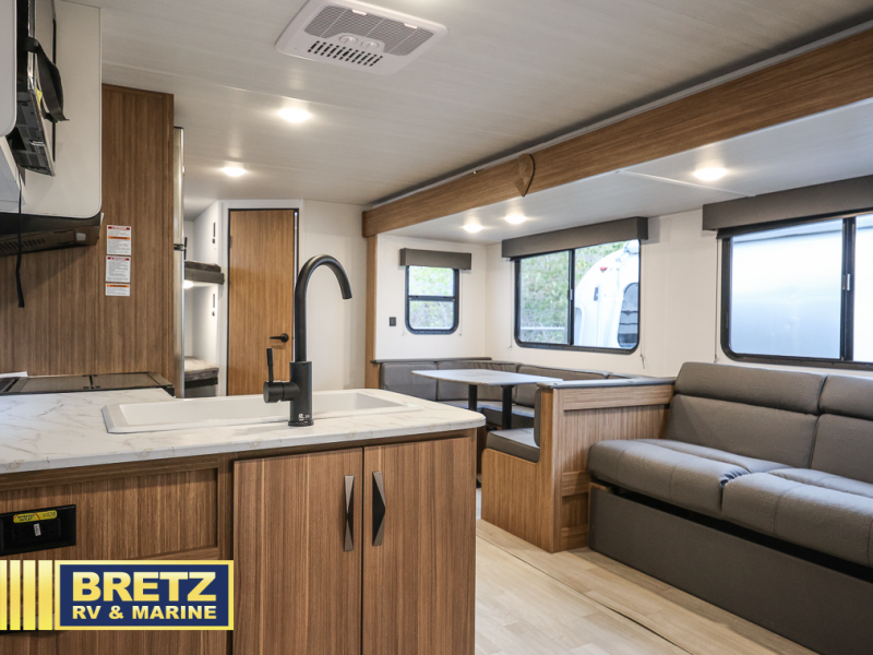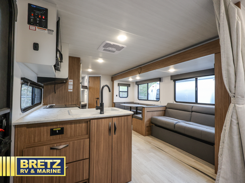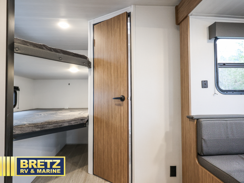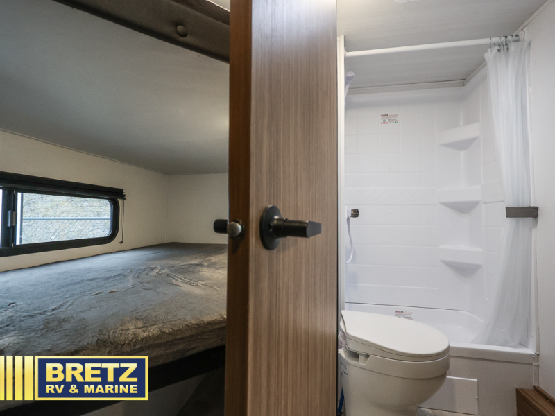 The whole gang will want to join along on camping trips in this spacious travel trailer. There are double-size bunks with a flip-up bunk for added storage plus a pass-thru storage for hiking or fishing gear. The combined living area and kitchen includes a U-shaped dinette and jack knife sofa within a large slide out, which will give the dog more space to nap on the floor. A fully-equipped kitchen includes a two burner cooktop, microwave oven, and large double door 12V refrigerator for perishables. You will also enjoy having your own space up front in the semi-private bedroom with a privacy curtain, queen bed, and dual wardrobes to keep your clothes out of the way!