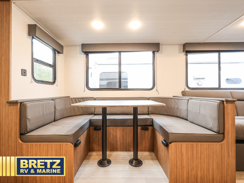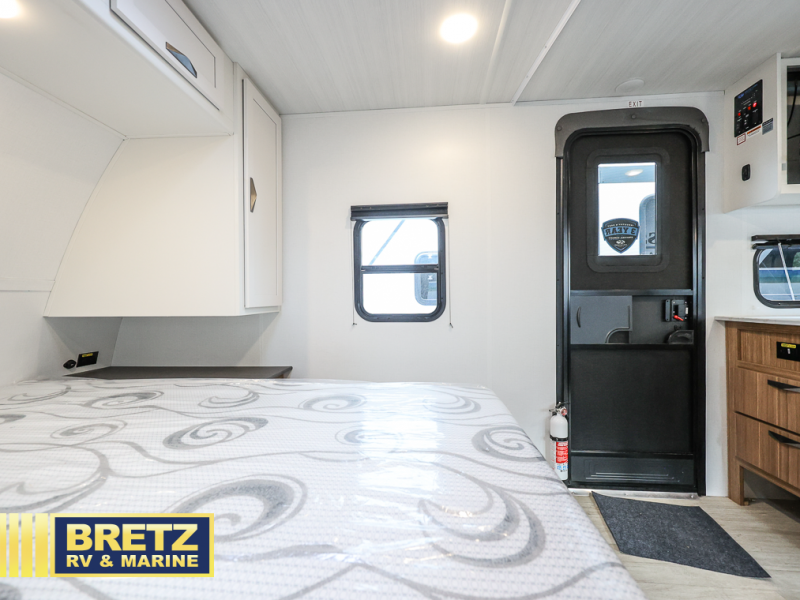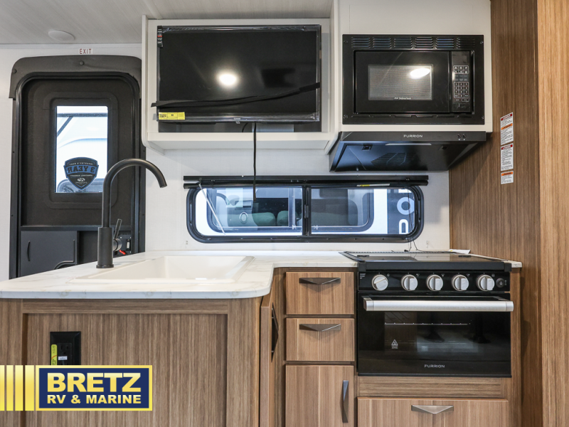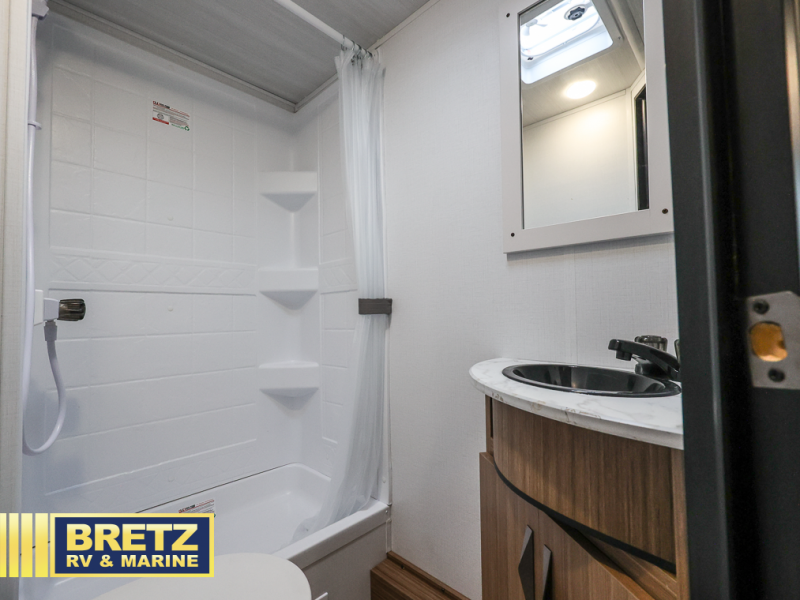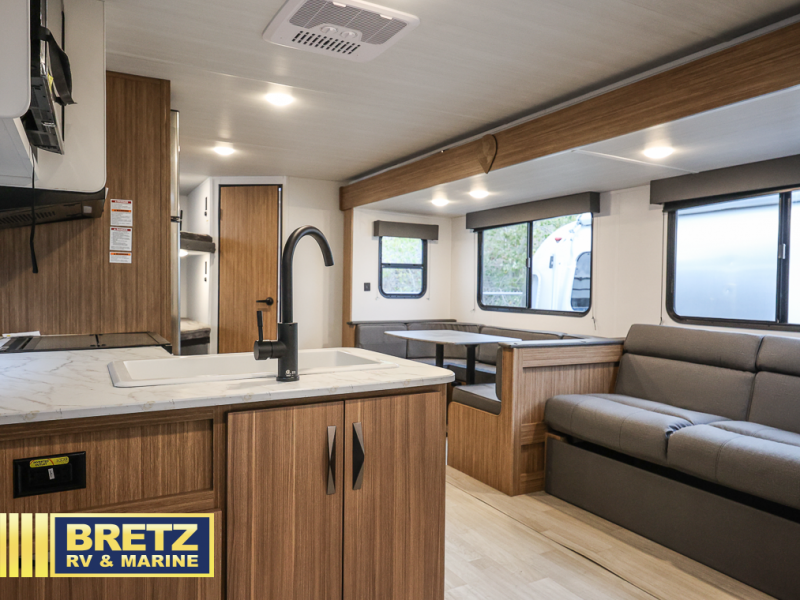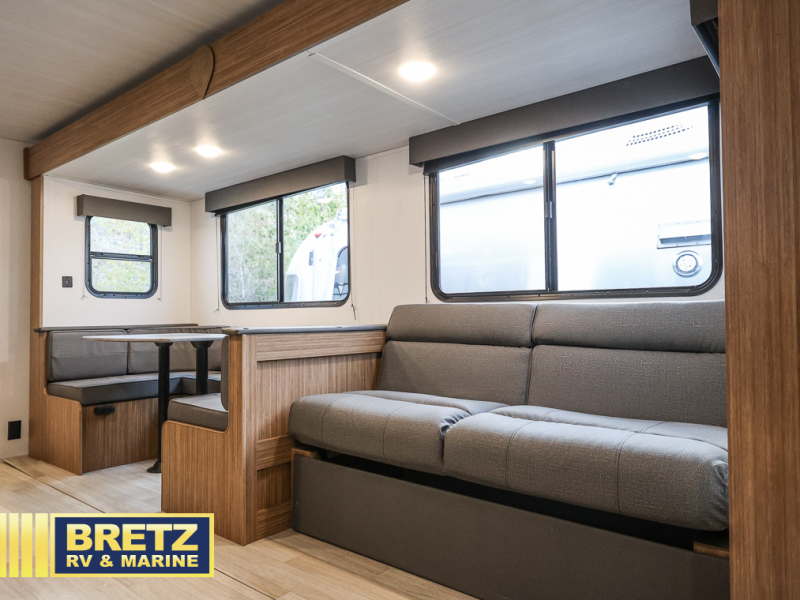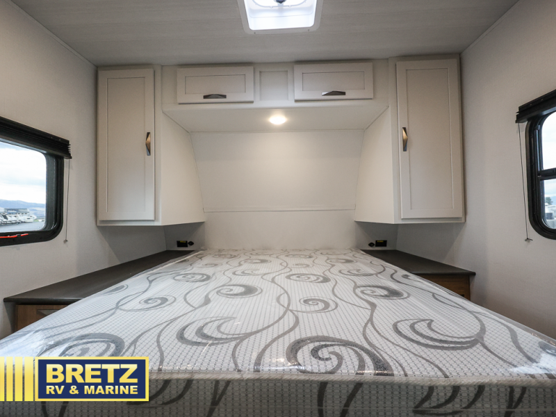 The whole gang will want to join along on camping trips in this spacious travel trailer. There are double-size bunks with a flip-up bunk for added storage plus a pass-thru storage for hiking or fishing gear. The combined living area and kitchen includes a U-shaped dinette and jack knife sofa within a large slide out, which will give the dog more space to nap on the floor. A fully-equipped kitchen includes a two burner cooktop, microwave oven, and large double door 12V refrigerator for perishables. You will also enjoy having your own space up front in the semi-private bedroom with a privacy curtain, queen bed, and dual wardrobes to keep your clothes out of the way!