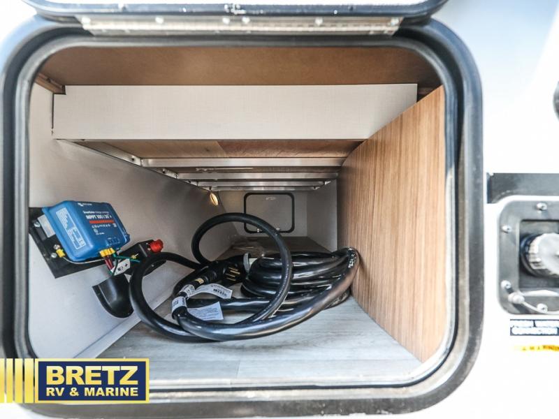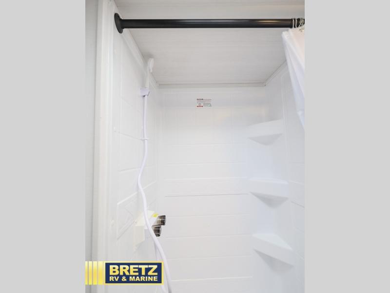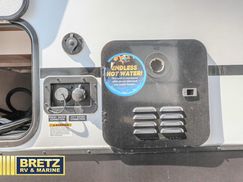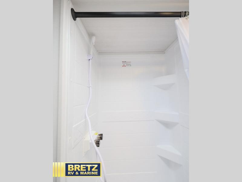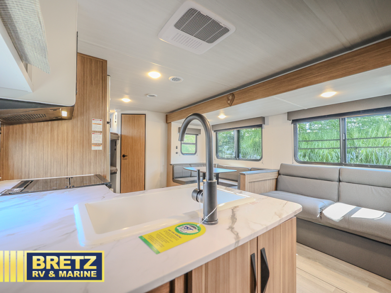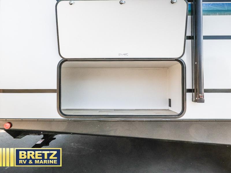 The whole gang will want to join along on camping trips in this spacious travel trailer. There are double-size bunks with a flip-up bunk for added storage plus a pass-thru storage for hiking or fishing gear. The combined living area and kitchen includes a U-shaped dinette and jack knife sofa within a large slide out, which will give the dog more space to nap on the floor. A fully-equipped kitchen includes a two burner cooktop, microwave oven, and large double door 12V refrigerator for perishables. You will also enjoy having your own space up front in the semi-private bedroom with a privacy curtain, queen bed, and dual wardrobes to keep your clothes out of the way!