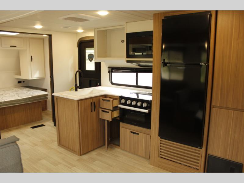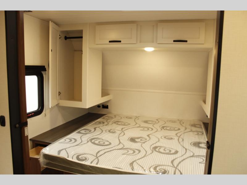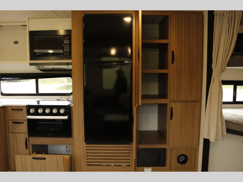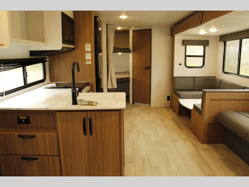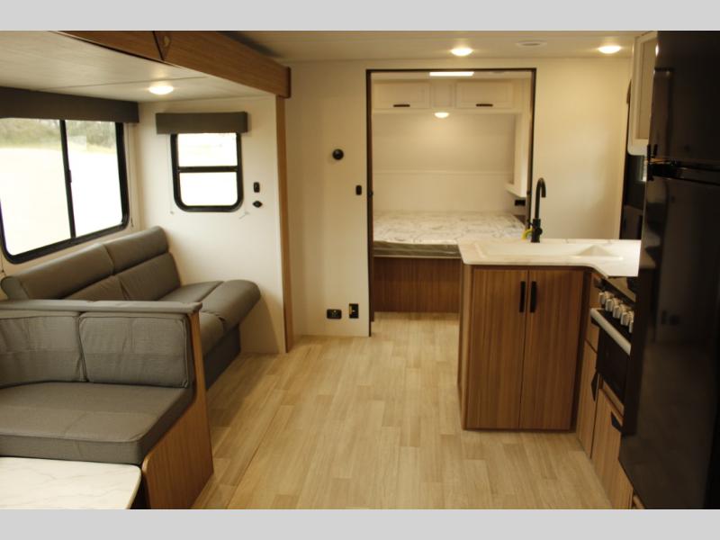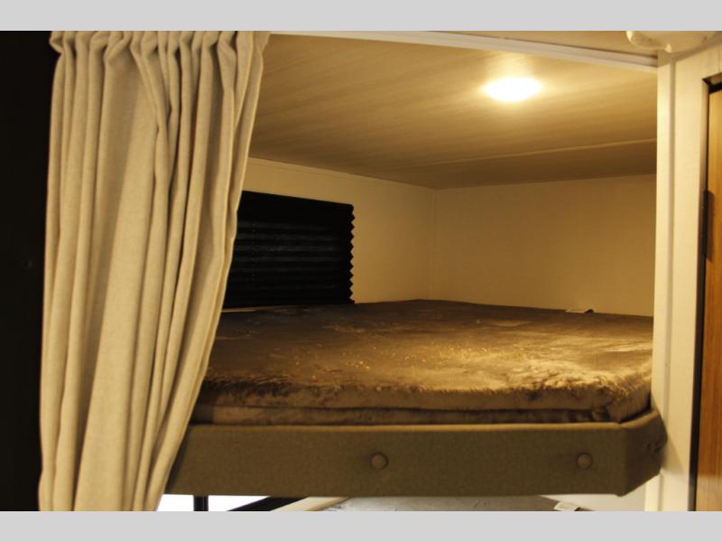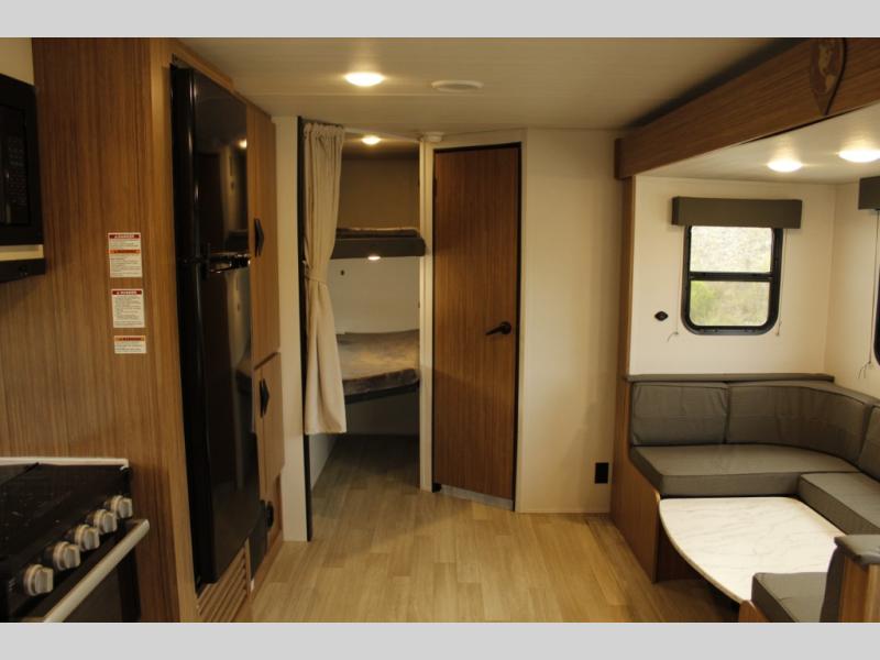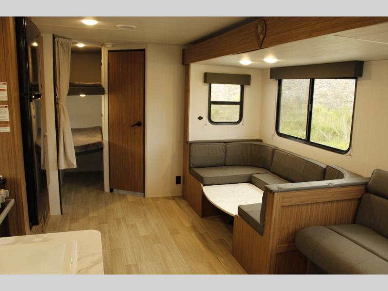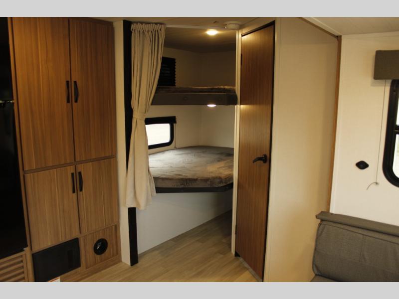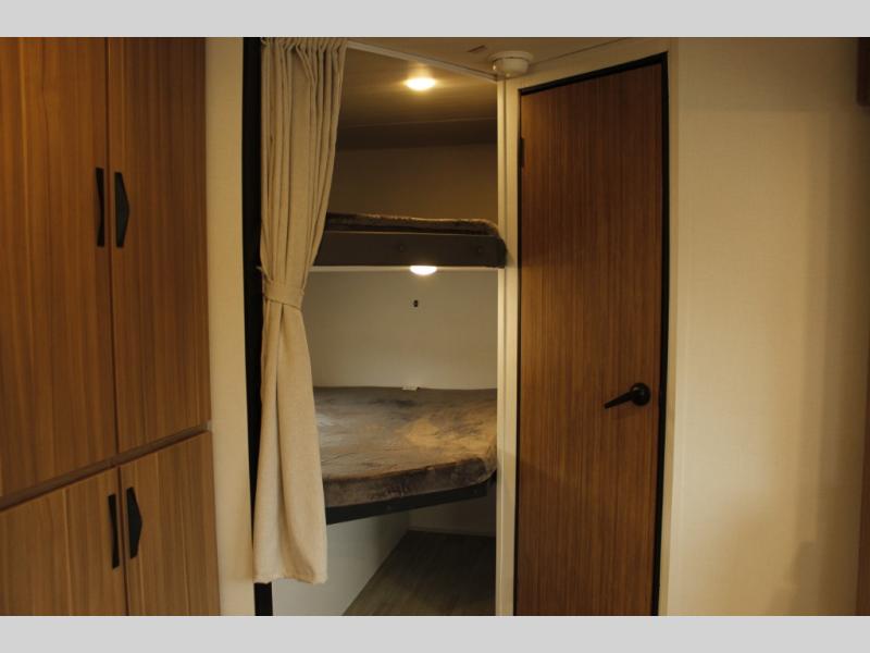 The whole gang will want to join along on camping trips in this spacious travel trailer. There are double-size bunks with a flip-up bunk for added storage plus a pass-thru storage for hiking or fishing gear. The combined living area and kitchen includes a U-shaped dinette and jack knife sofa within a large slide out, which will give the dog more space to nap on the floor. A fully-equipped kitchen includes a two burner cooktop, microwave oven, and large double door 12V refrigerator for perishables. You will also enjoy having your own space up front in the semi-private bedroom with a privacy curtain, queen bed, and dual wardrobes to keep your clothes out of the way!