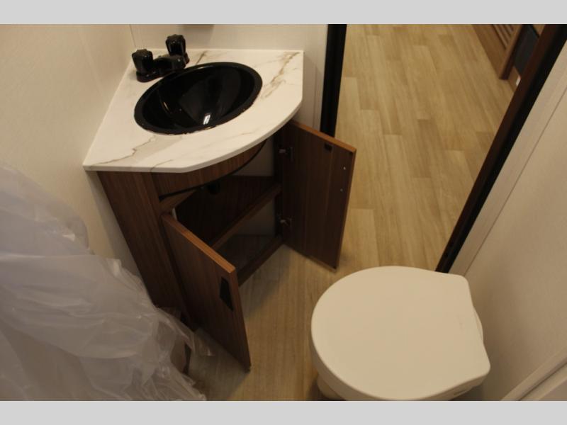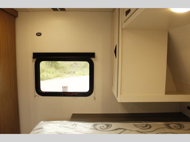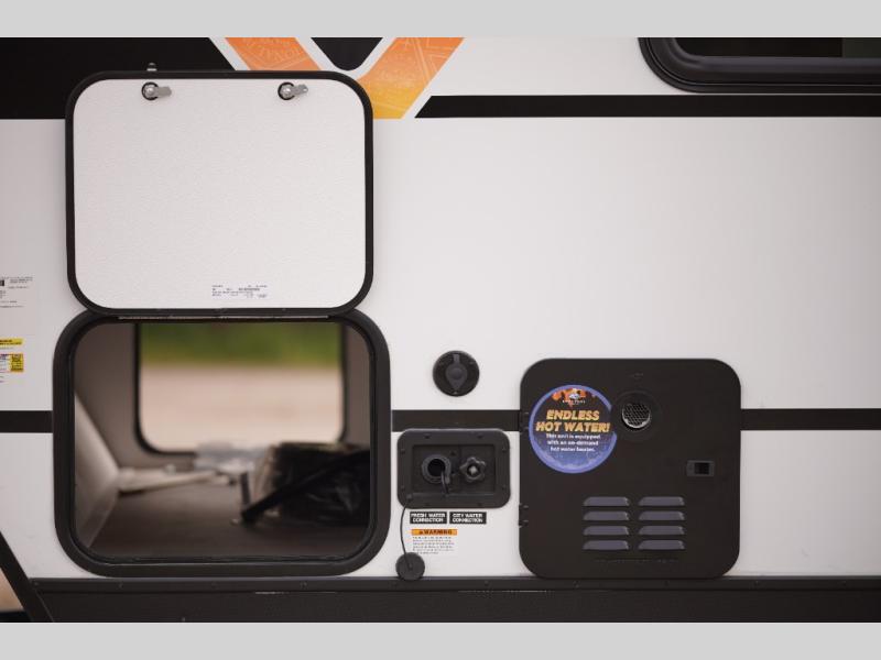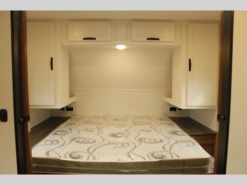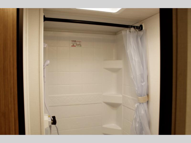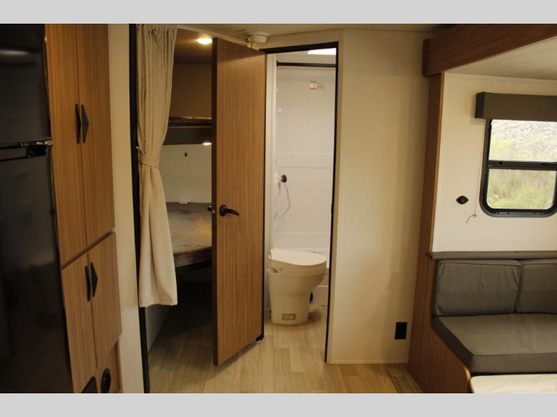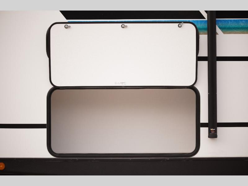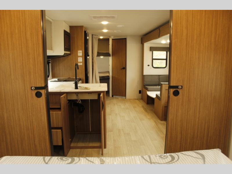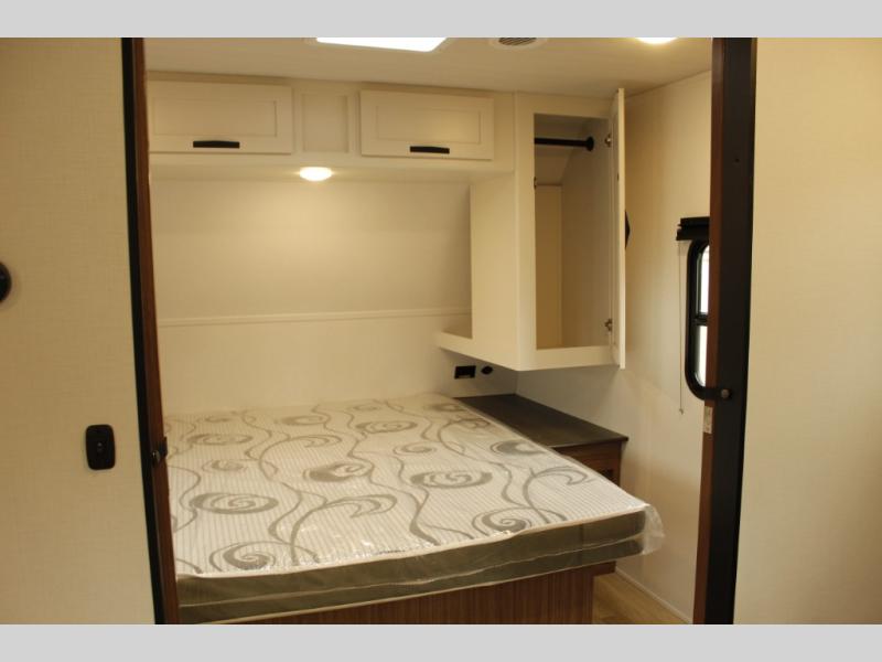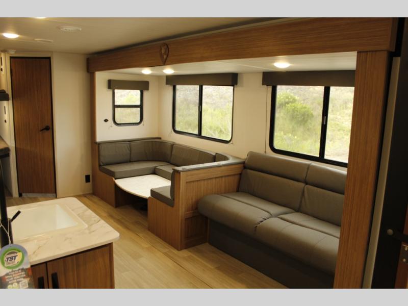 The whole gang will want to join along on camping trips in this spacious travel trailer. There are double-size bunks with a flip-up bunk for added storage plus a pass-thru storage for hiking or fishing gear. The combined living area and kitchen includes a U-shaped dinette and jack knife sofa within a large slide out, which will give the dog more space to nap on the floor. A fully-equipped kitchen includes a two burner cooktop, microwave oven, and large double door 12V refrigerator for perishables. You will also enjoy having your own space up front in the semi-private bedroom with a privacy curtain, queen bed, and dual wardrobes to keep your clothes out of the way!