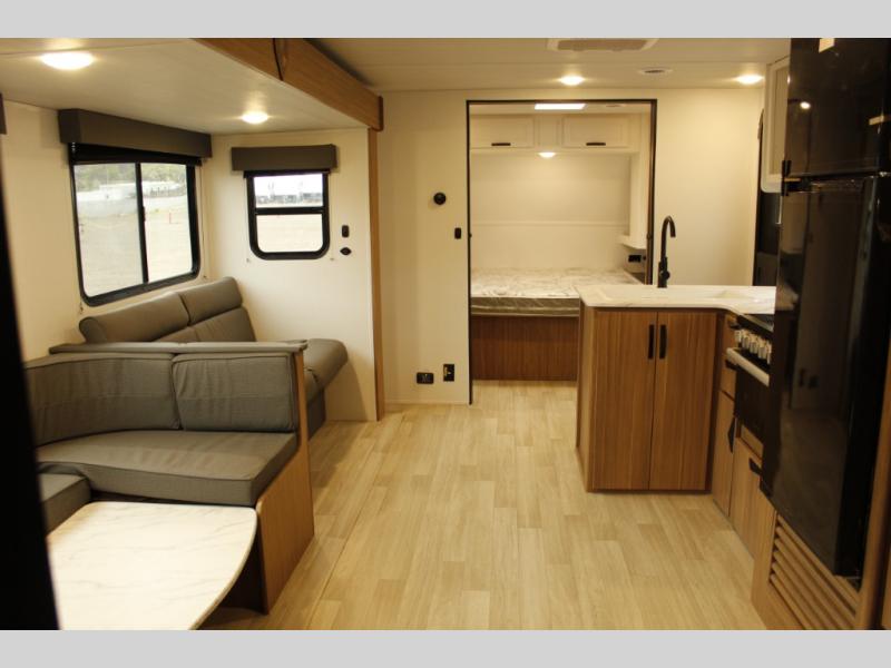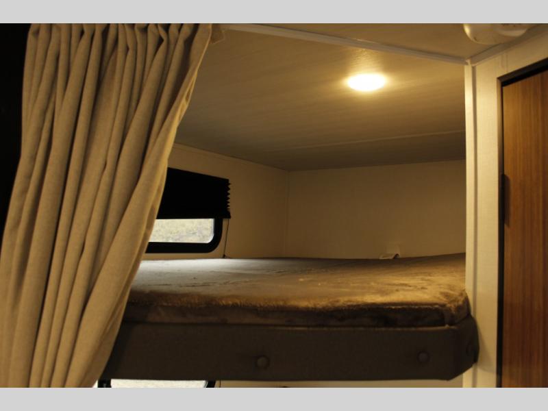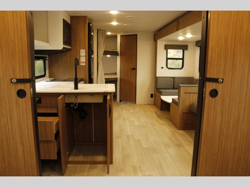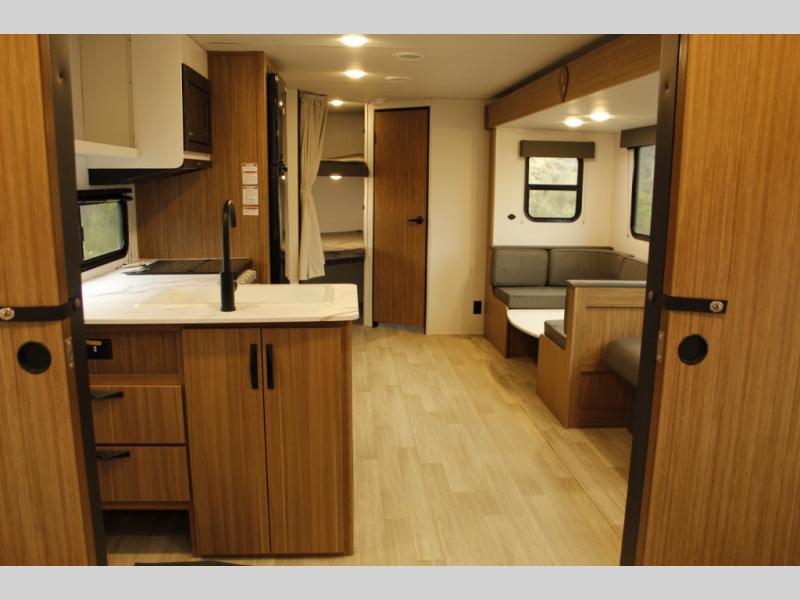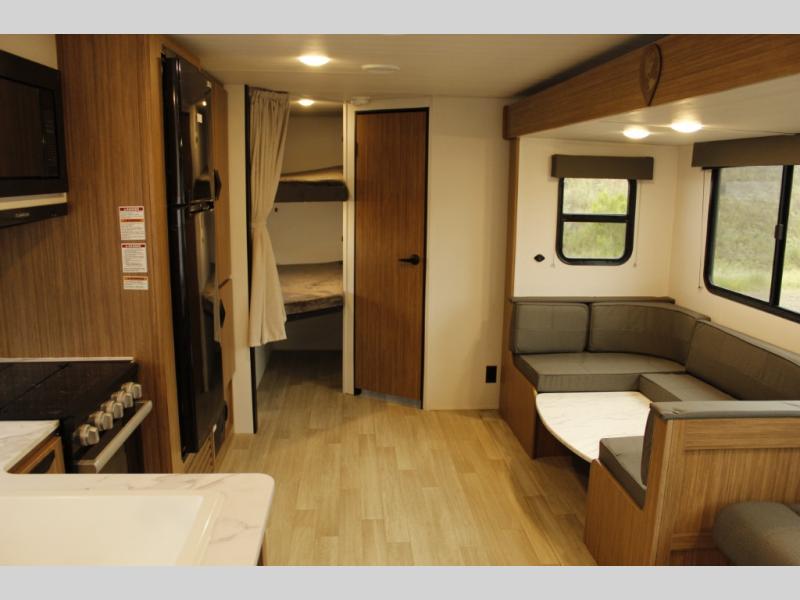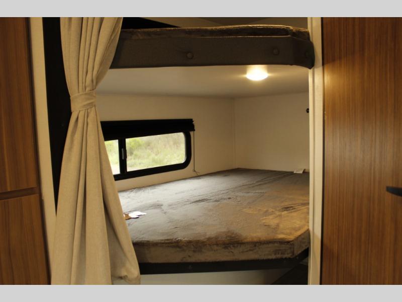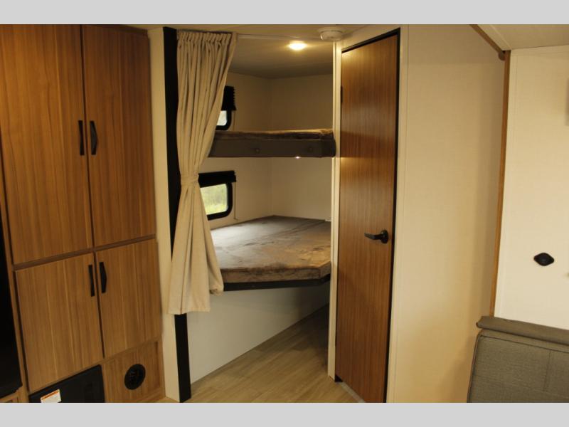 The whole gang will want to join along on camping trips in this spacious travel trailer. There are double-size bunks with a flip-up bunk for added storage plus a pass-thru storage for hiking or fishing gear. The combined living area and kitchen includes a U-shaped dinette and jack knife sofa within a large slide out, which will give the dog more space to nap on the floor. A fully-equipped kitchen includes a two burner cooktop, microwave oven, and large double door 12V refrigerator for perishables. You will also enjoy having your own space up front in the semi-private bedroom with a privacy curtain, queen bed, and dual wardrobes to keep your clothes out of the way!