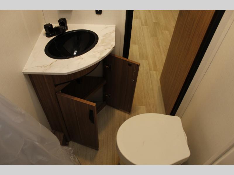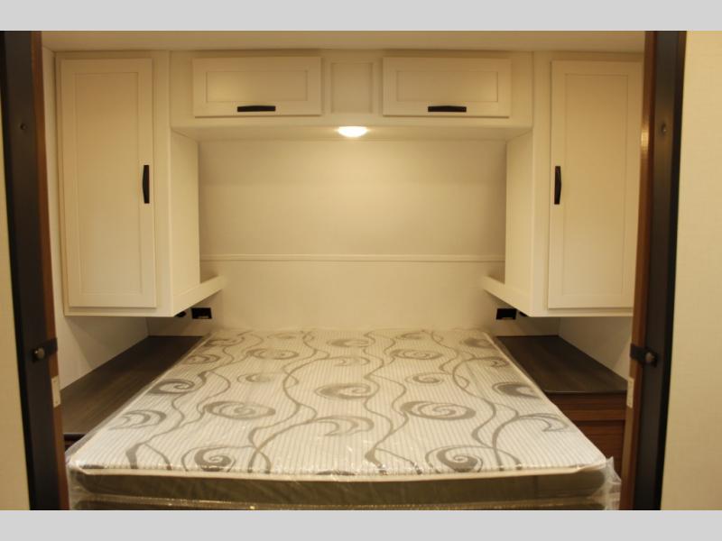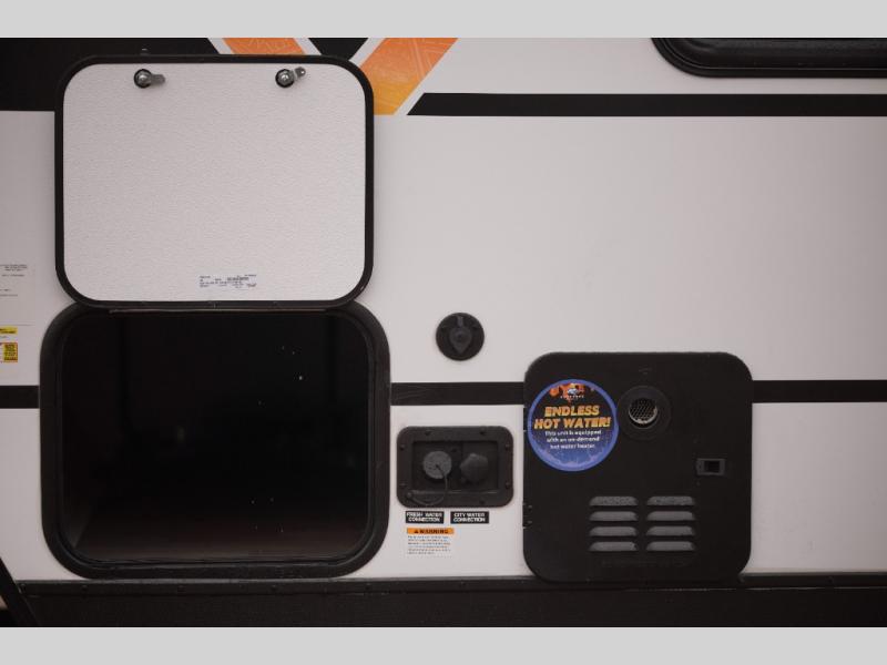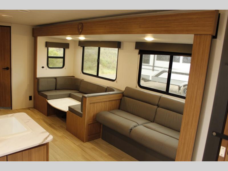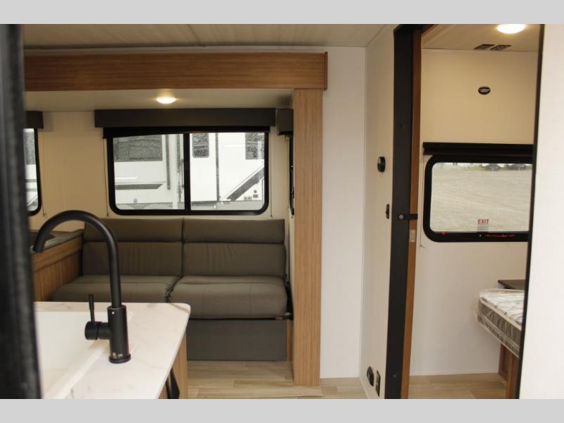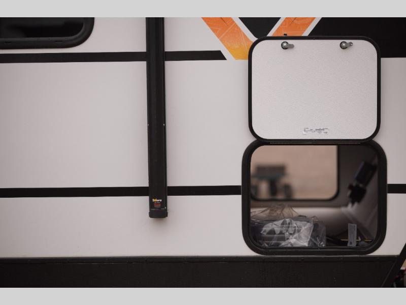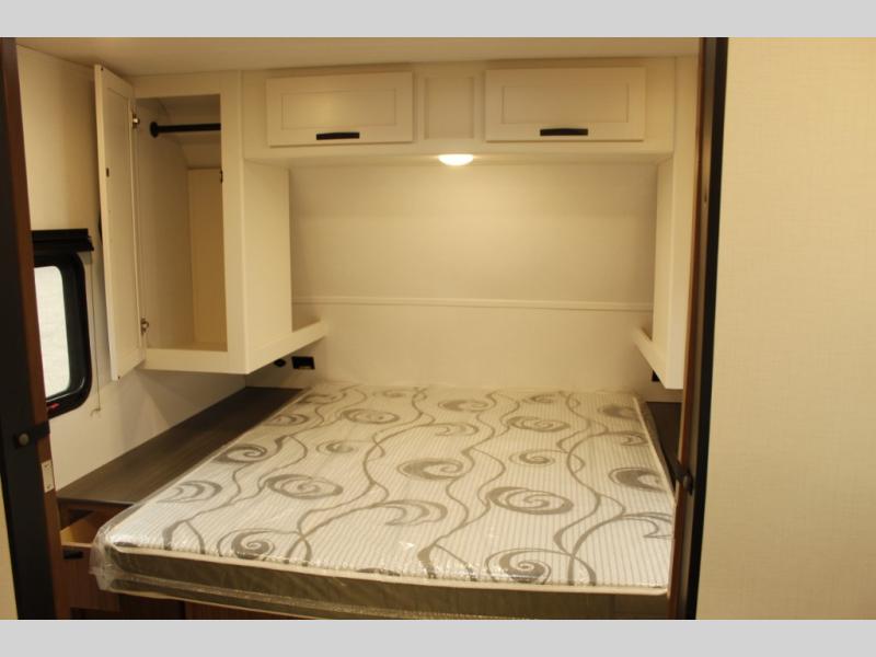 The whole gang will want to join along on camping trips in this spacious travel trailer. There are double-size bunks with a flip-up bunk for added storage plus a pass-thru storage for hiking or fishing gear. The combined living area and kitchen includes a U-shaped dinette and jack knife sofa within a large slide out, which will give the dog more space to nap on the floor. A fully-equipped kitchen includes a two burner cooktop, microwave oven, and large double door 12V refrigerator for perishables. You will also enjoy having your own space up front in the semi-private bedroom with a privacy curtain, queen bed, and dual wardrobes to keep your clothes out of the way!