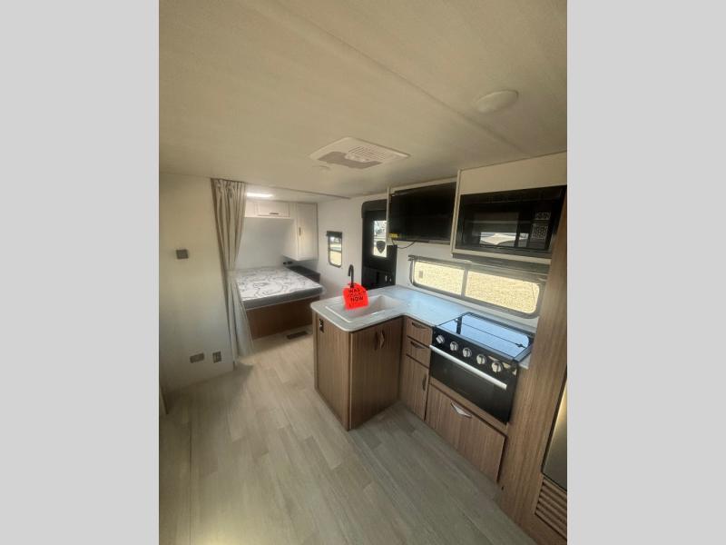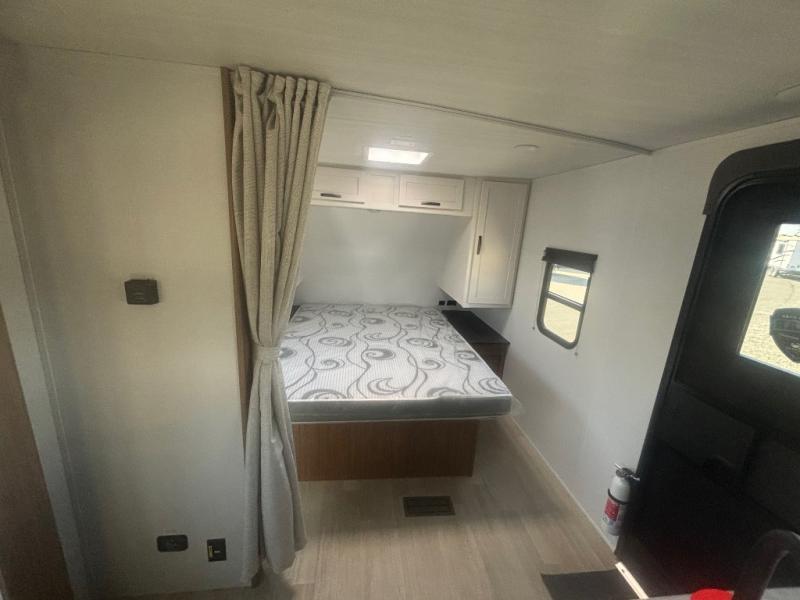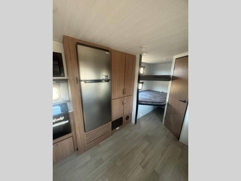 The whole gang will want to join along on camping trips in this spacious travel trailer. There are double-size bunks with a flip-up bunk for added storage plus a pass-thru storage for hiking or fishing gear. The combined living area and kitchen includes a U-shaped dinette and jack knife sofa within a large slide out, which will give the dog more space to nap on the floor. A fully-equipped kitchen includes a two burner cooktop, microwave oven, and large double door 12V refrigerator for perishables. You will also enjoy having your own space up front in the semi-private bedroom with a privacy curtain, queen bed, and dual wardrobes to keep your clothes out of the way!