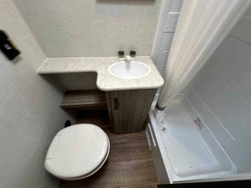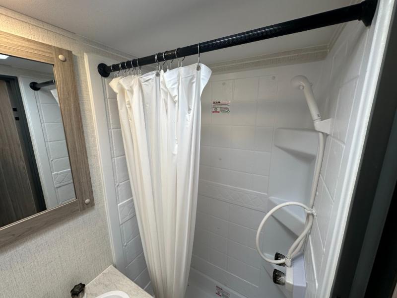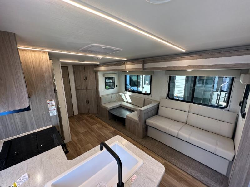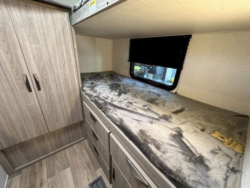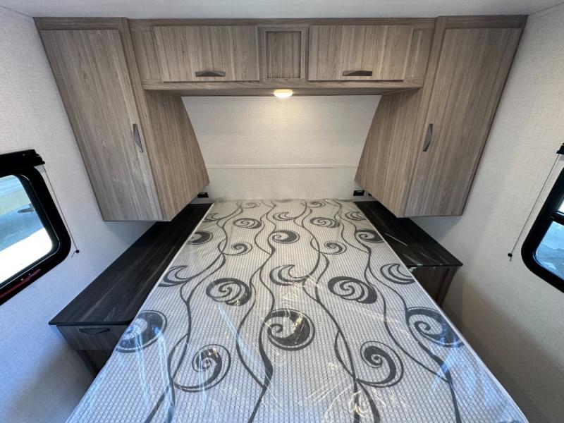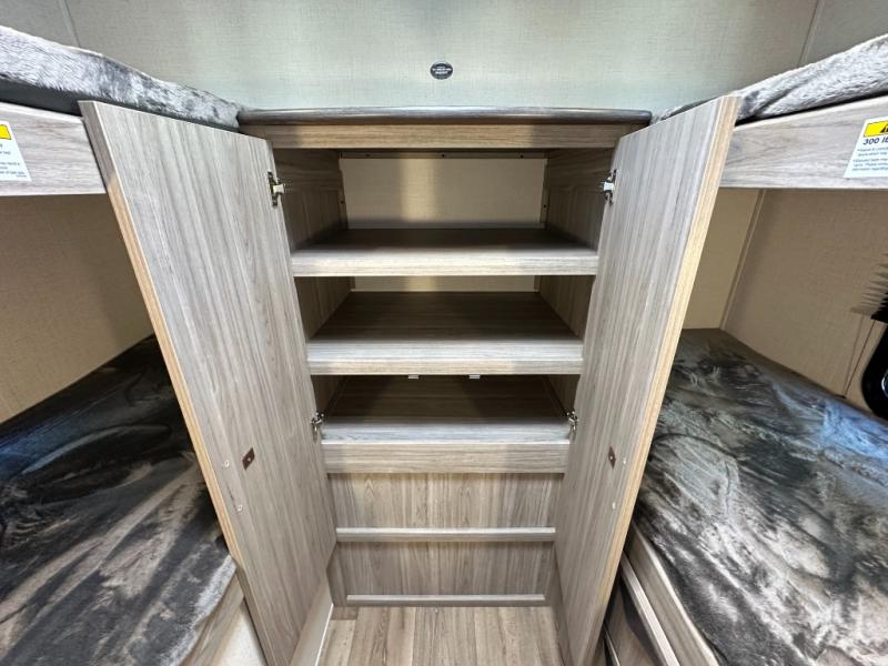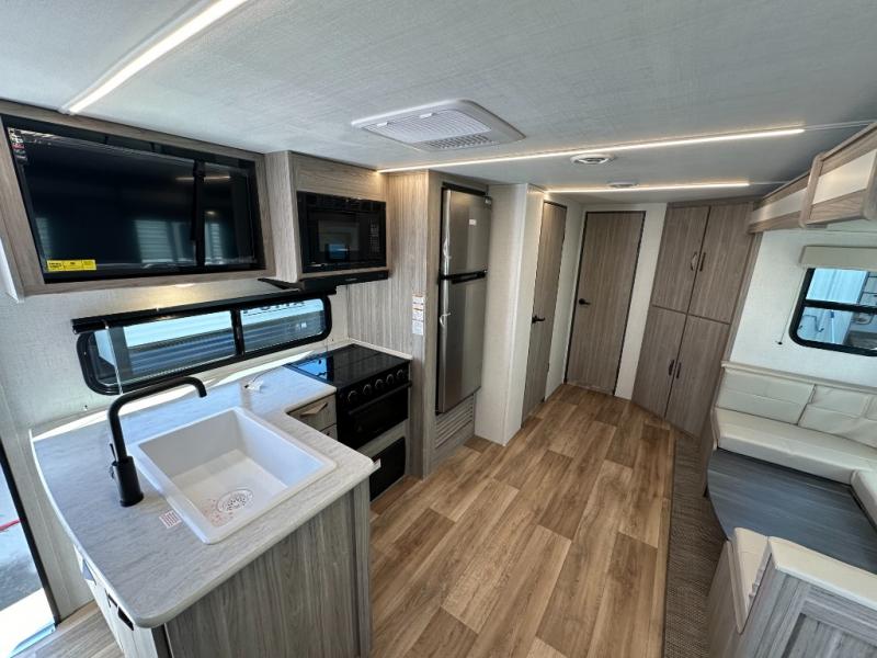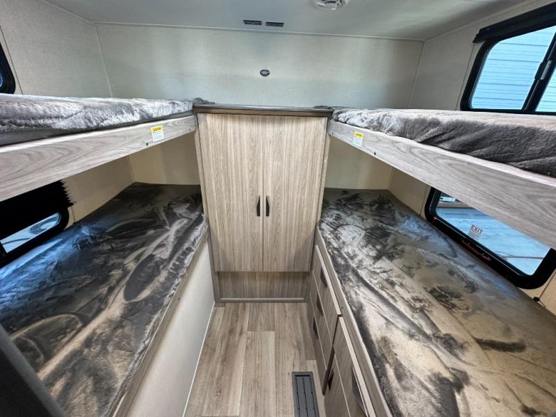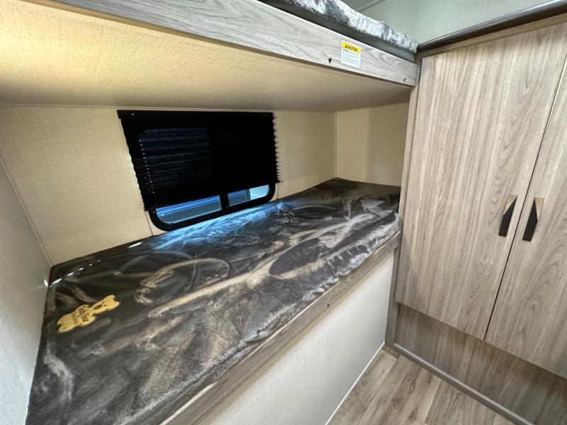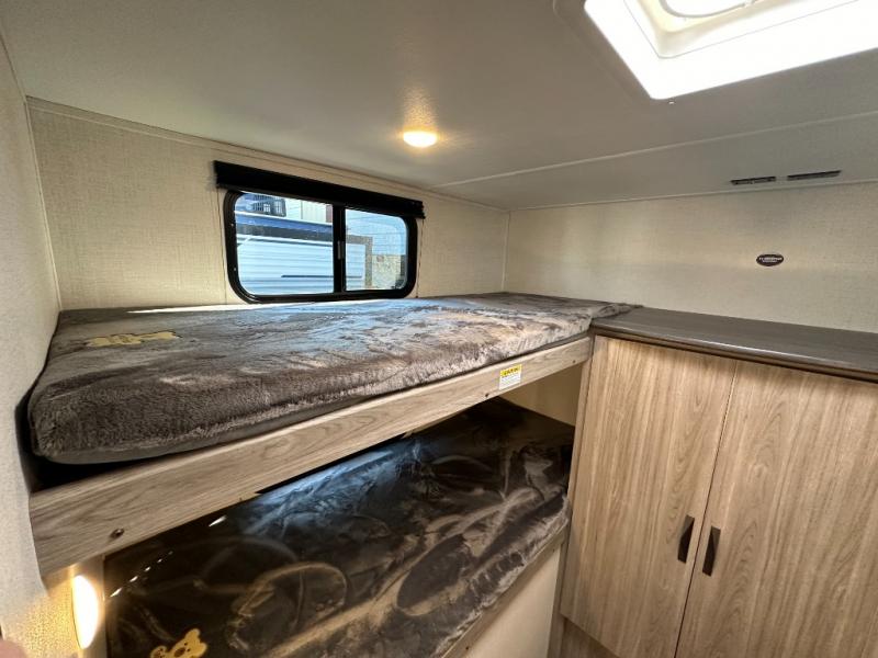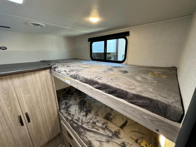 This spacious travel trailer is perfect for a large group or family since it can sleep eight to ten people each night. The bunkhouse will be a favorite spot for the littles ones to enjoy, especially with four bunk beds and a wardrobe with storage. You'll have a queen bed up front in the private bedroom, and if you have any other guests, they can sleep on the jack knife sofa and booth dinette! The two burner range and microwave oven allow you to make meals each day, and the large double door 12V refrigerator will keep leftovers fresh.