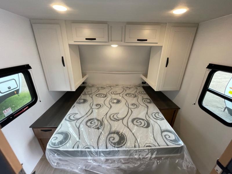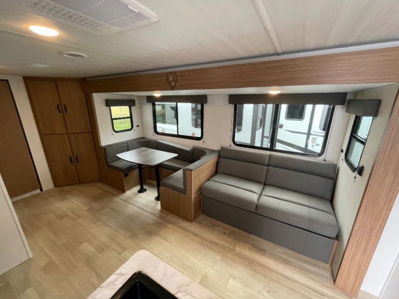 This spacious travel trailer is perfect for a large group or family since it can sleep eight to ten people each night. The bunkhouse will be a favorite spot for the littles ones to enjoy, especially with four bunk beds and a wardrobe with storage. You'll have a queen bed up front in the private bedroom, and if you have any other guests, they can sleep on the jack knife sofa and booth dinette! The two burner range and microwave oven allow you to make meals each day, and the large double door 12V refrigerator will keep leftovers fresh.