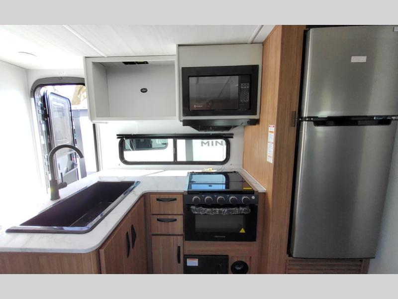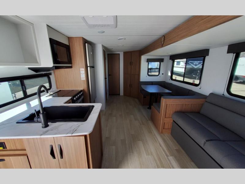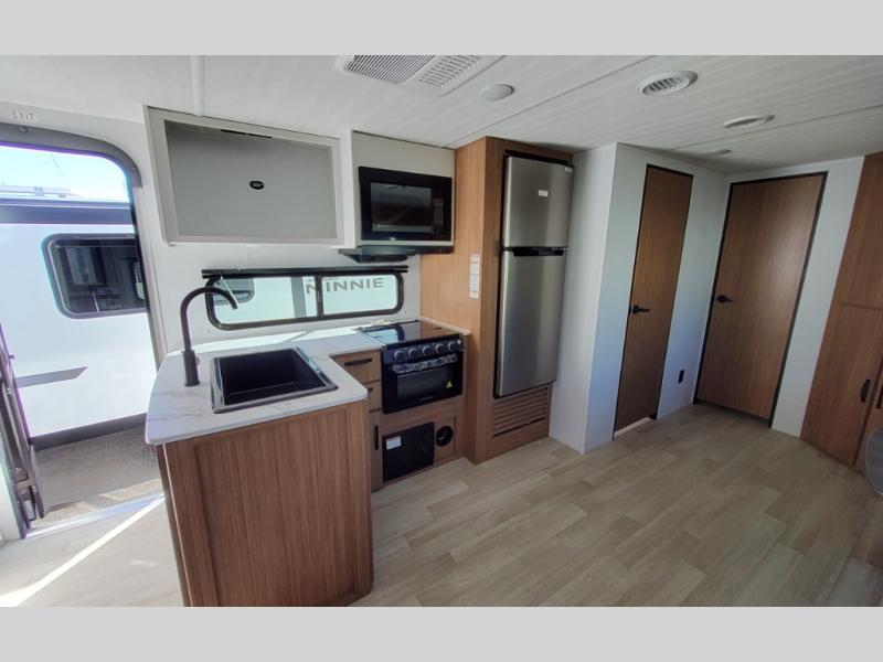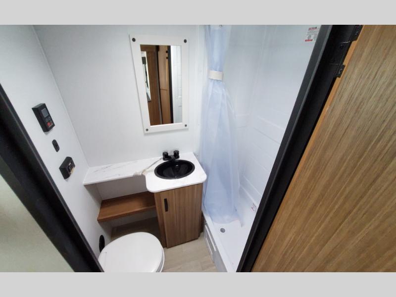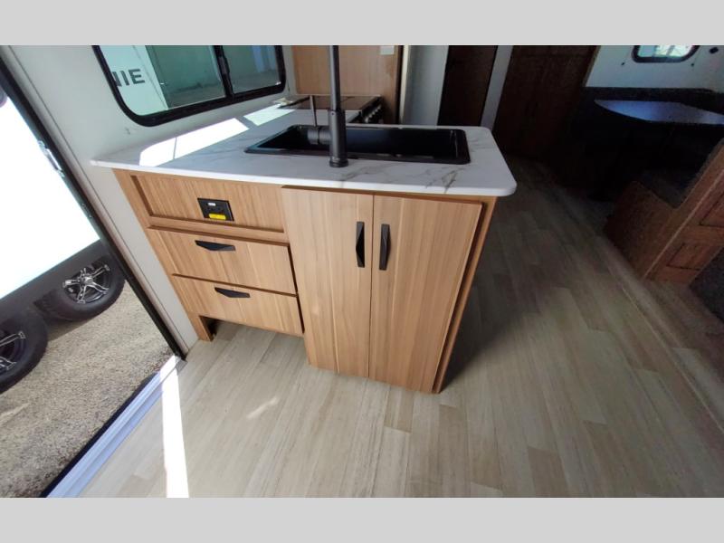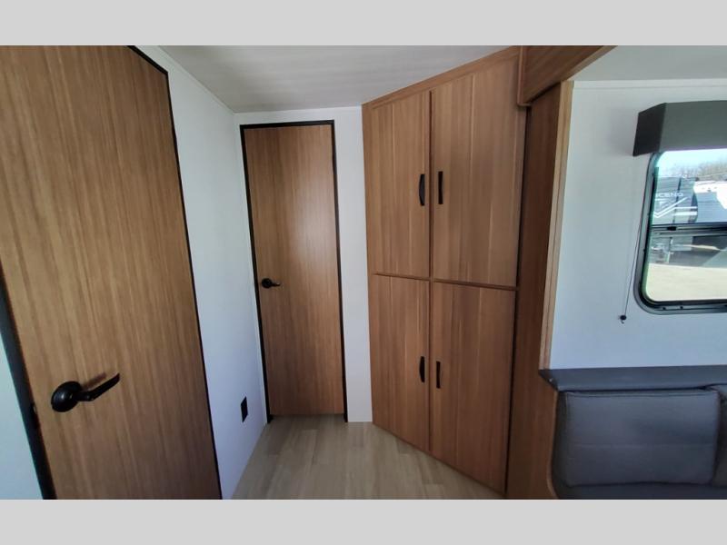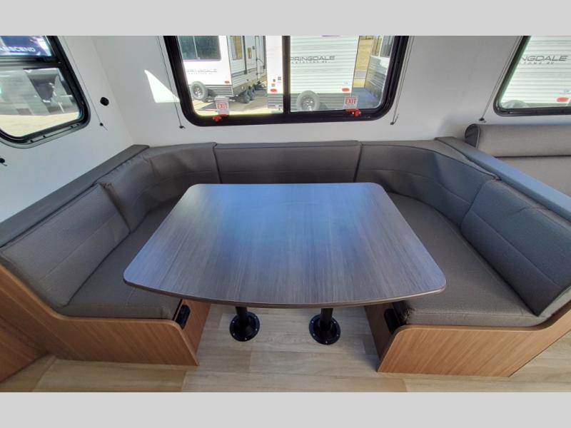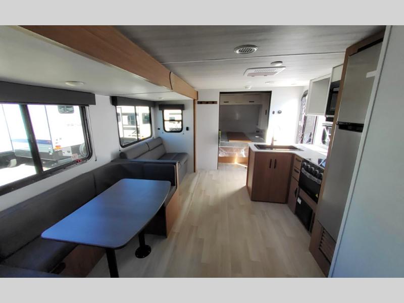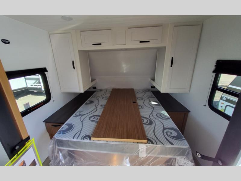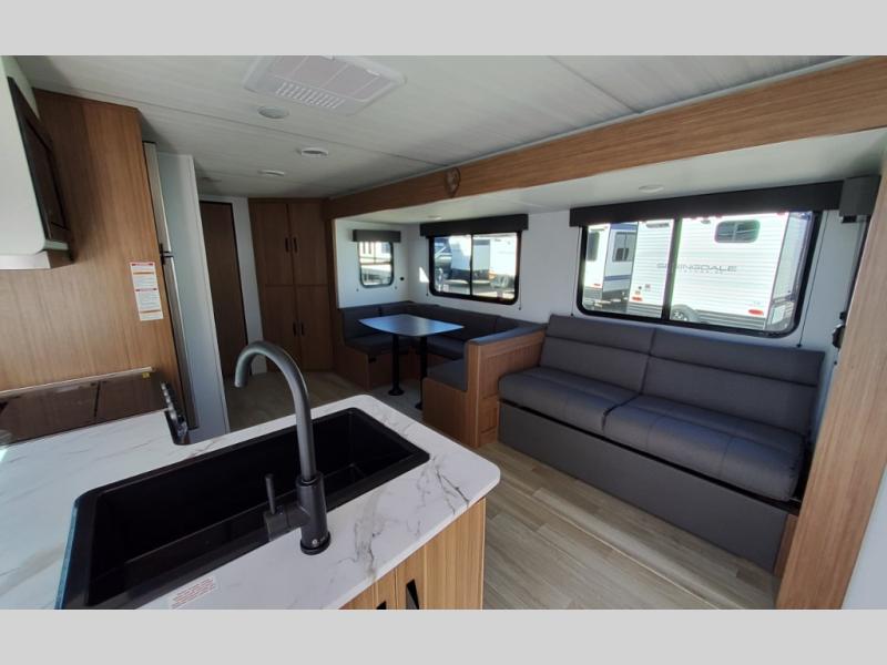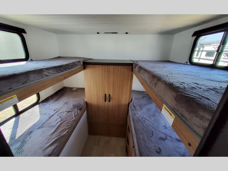 This spacious travel trailer is perfect for a large group or family since it can sleep eight to ten people each night. The bunkhouse will be a favorite spot for the littles ones to enjoy, especially with four bunk beds and a wardrobe with storage. You'll have a queen bed up front in the private bedroom, and if you have any other guests, they can sleep on the jack knife sofa and booth dinette! The two burner range and microwave oven allow you to make meals each day, and the large double door 12V refrigerator will keep leftovers fresh.