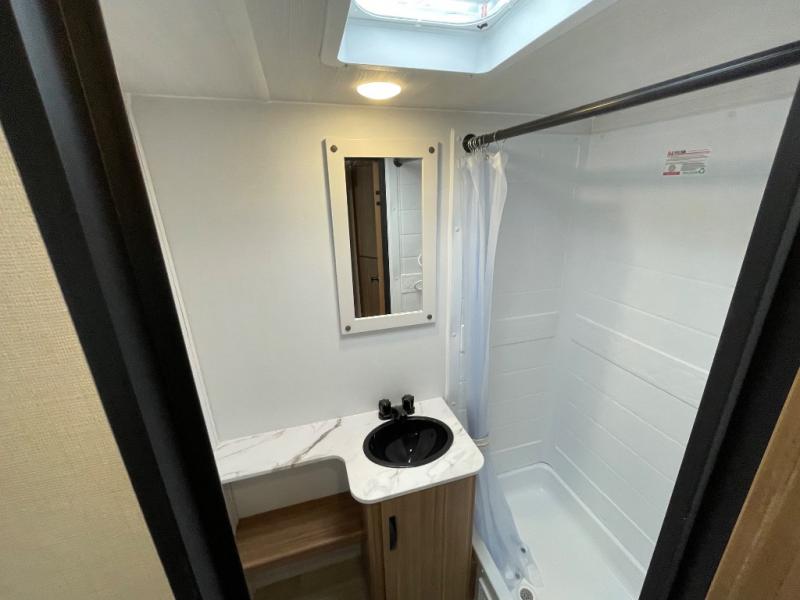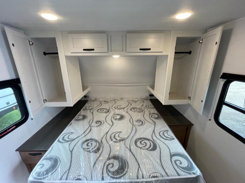 This spacious travel trailer is perfect for a large group or family since it can sleep eight to ten people each night. The bunkhouse will be a favorite spot for the littles ones to enjoy, especially with four bunk beds and a wardrobe with storage. You'll have a queen bed up front in the private bedroom, and if you have any other guests, they can sleep on the jack knife sofa and booth dinette! The two burner range and microwave oven allow you to make meals each day, and the large double door 12V refrigerator will keep leftovers fresh.