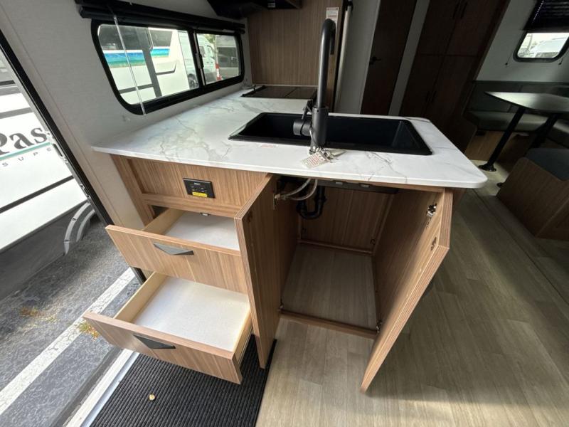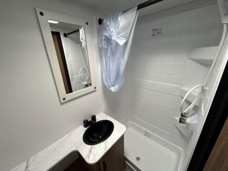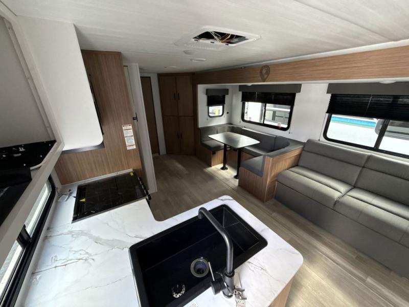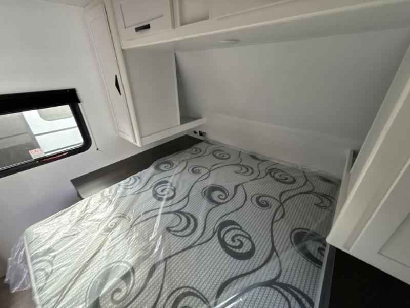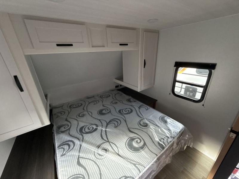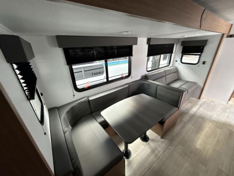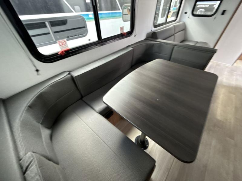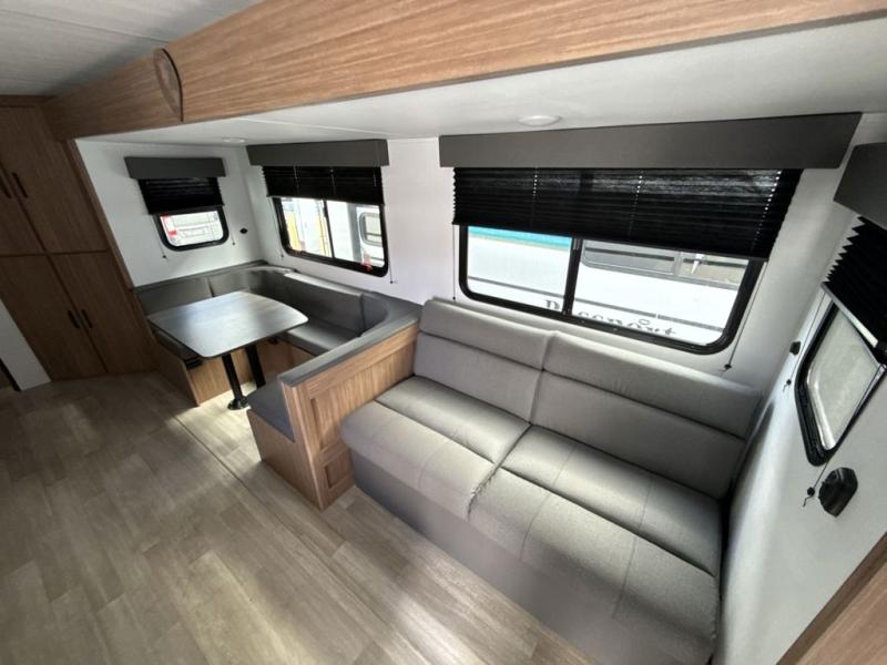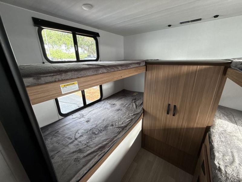 This spacious travel trailer is perfect for a large group or family since it can sleep eight to ten people each night. The bunkhouse will be a favorite spot for the littles ones to enjoy, especially with four bunk beds and a wardrobe with storage. You'll have a queen bed up front in the private bedroom, and if you have any other guests, they can sleep on the jack knife sofa and booth dinette! The two burner range and microwave oven allow you to make meals each day, and the large double door 12V refrigerator will keep leftovers fresh.