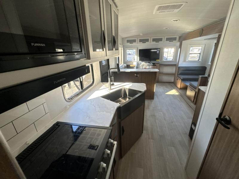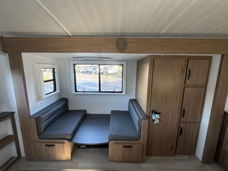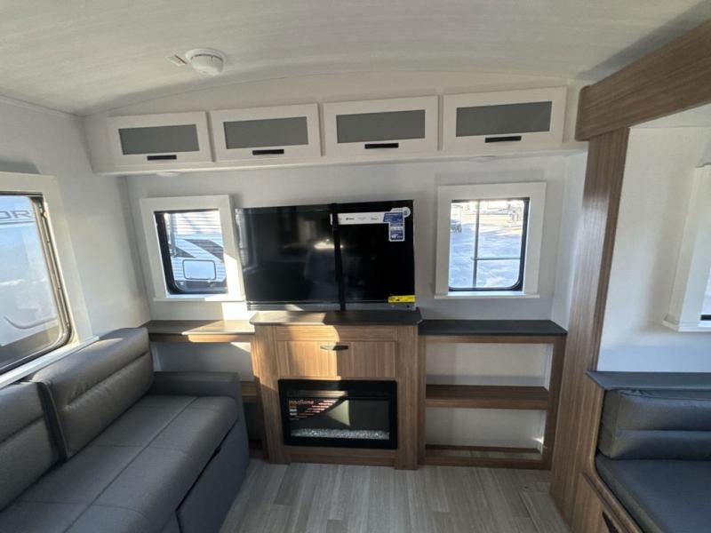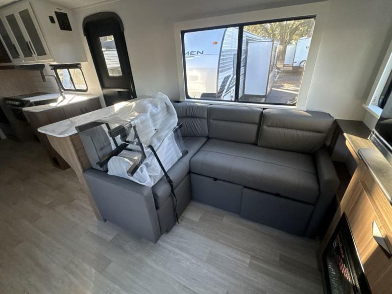 Step right into this rear living travel trailer for fun trips at the lake! There is an L-shaped sectional sofa in the back, along with an entertainment center and a fireplace to enjoy cozy evenings indoors. The booth dinette will provide a place to dine, play games, and even let a guest or two littles ones sleep. This unit also includes a spacious pantry and a coffee station where you can set up your own Keurig machine. A full kitchen will let you prepare meals each day, and the mid-coach full bath will be easily accessible for everyone to use. You will also love the front private bedroom with its queen bed, plus dual wardrobes and dual nightstands so everything has its own place!