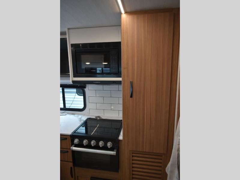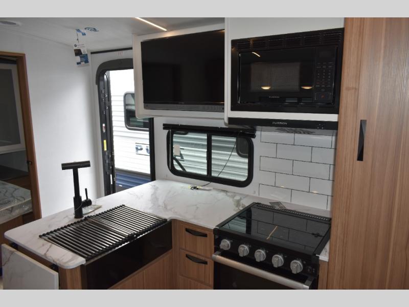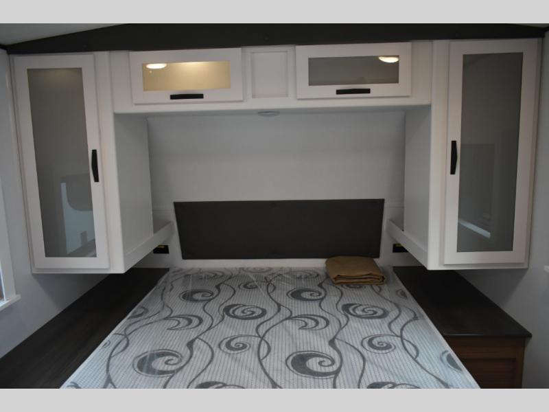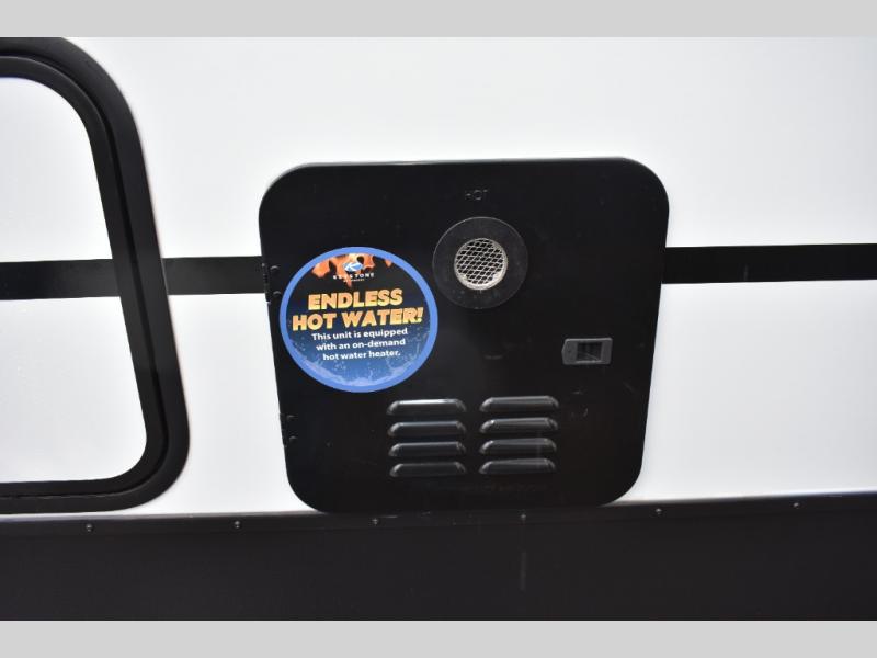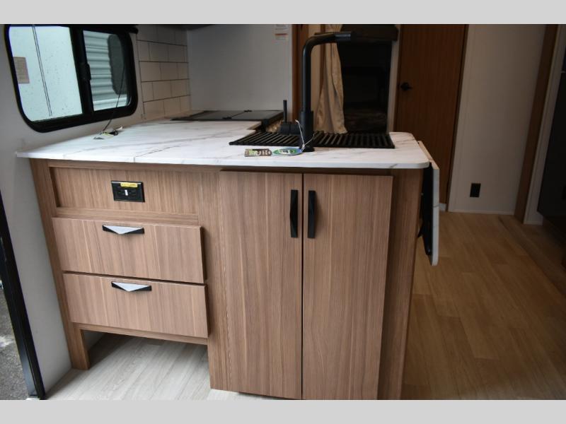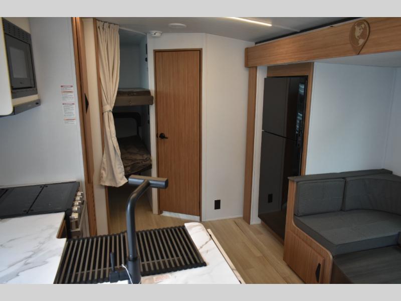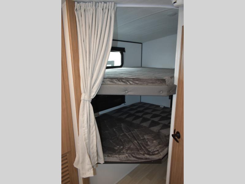 Trips to the lake with a larger group are made easy in this spacious travel trailer! The double-size bunks include a flip-up bunk for added storage, and there is a rear cargo door here so you can easily load gear from outside. The full bath is conveniently located right by the bunks for easy nighttime use, and the pantry is also close by if anyone needs a midnight snack! You will sleep like a baby in the front bedroom that includes a queen bed and dual wardrobes to keep your clothes tidy. In the morning, everyone can meet in the combined living area and kitchen while the chef makes breakfast on the three burner cooktop, and there is a U-shaped do-more dinette table to dine at. If the weather is nice, the chef just may want to cook on the outside kitchen with a griddle, and everyone can sit at the picnic table under the 15' awning!