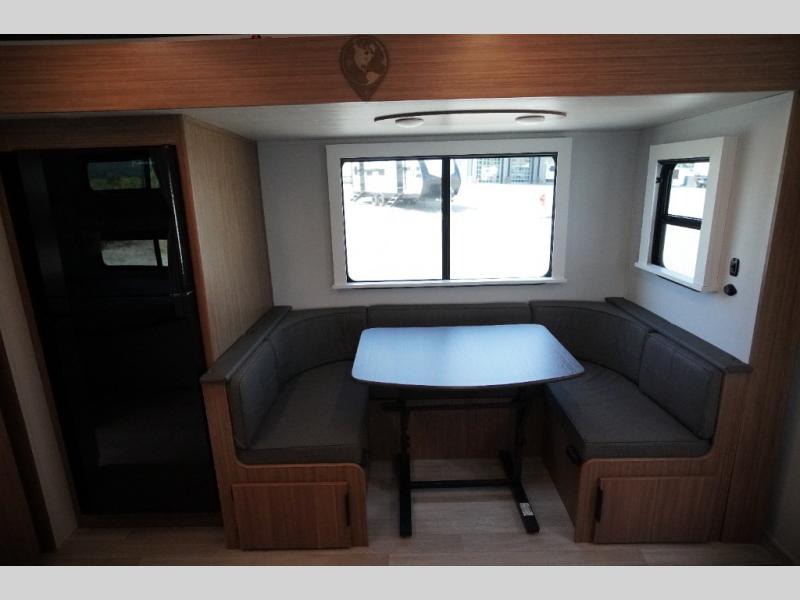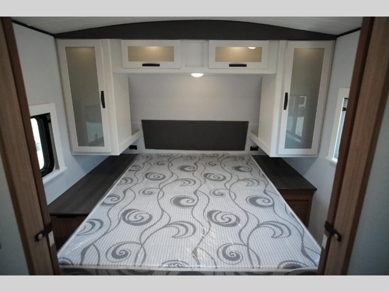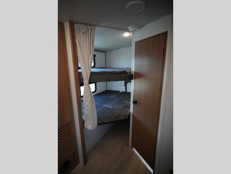 Trips to the lake with a larger group are made easy in this spacious travel trailer! The double-size bunks include a flip-up bunk for added storage, and there is a rear cargo door here so you can easily load gear from outside. The full bath is conveniently located right by the bunks for easy nighttime use, and the pantry is also close by if anyone needs a midnight snack! You will sleep like a baby in the front bedroom that includes a queen bed and dual wardrobes to keep your clothes tidy. In the morning, everyone can meet in the combined living area and kitchen while the chef makes breakfast on the three burner cooktop, and there is a U-shaped do-more dinette table to dine at. If the weather is nice, the chef just may want to cook on the outside kitchen with a griddle, and everyone can sit at the picnic table under the 15' awning!