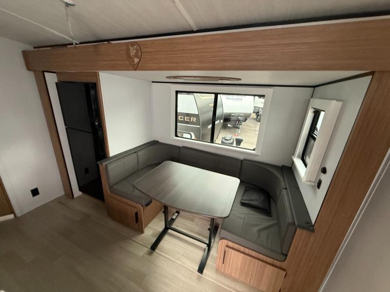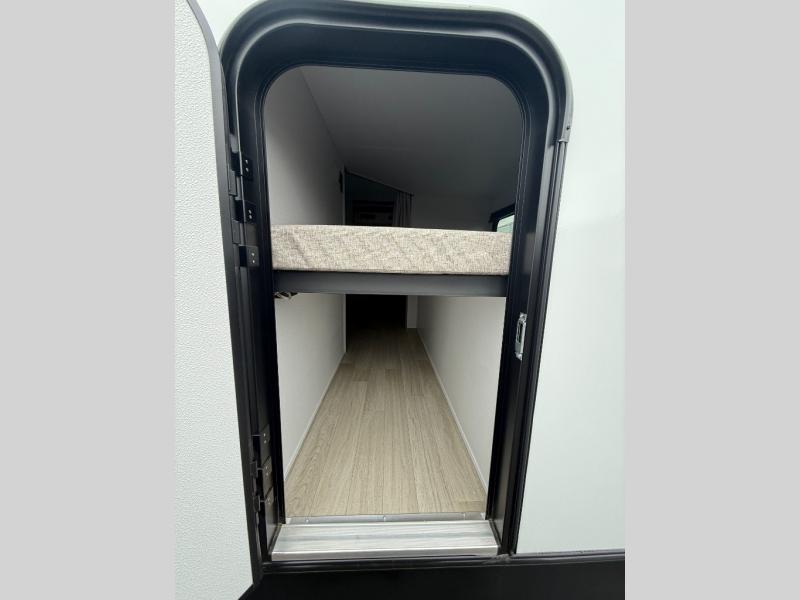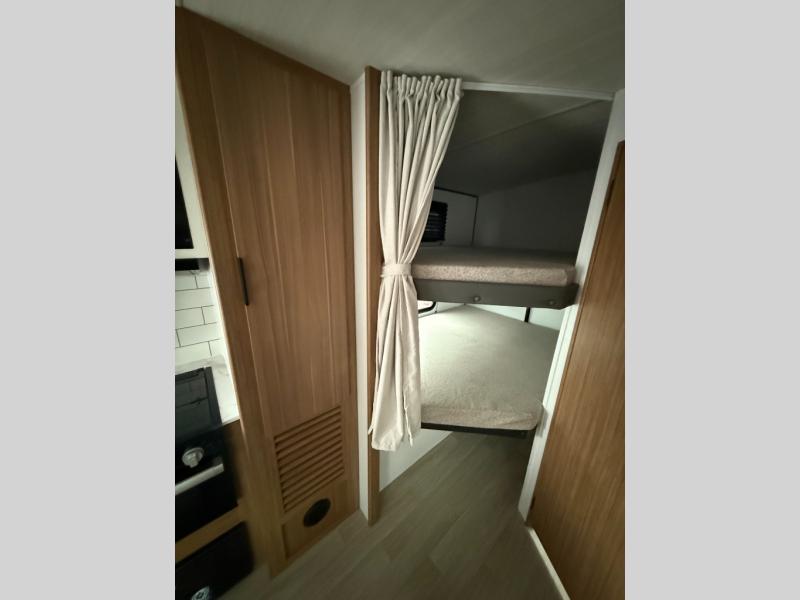 Trips to the lake with a larger group are made easy in this spacious travel trailer! The double-size bunks include a flip-up bunk for added storage, and there is a rear cargo door here so you can easily load gear from outside. The full bath is conveniently located right by the bunks for easy nighttime use, and the pantry is also close by if anyone needs a midnight snack! You will sleep like a baby in the front bedroom that includes a queen bed and dual wardrobes to keep your clothes tidy. In the morning, everyone can meet in the combined living area and kitchen while the chef makes breakfast on the three burner cooktop, and there is a U-shaped do-more dinette table to dine at. If the weather is nice, the chef just may want to cook on the outside kitchen with a griddle, and everyone can sit at the picnic table under the 15' awning!