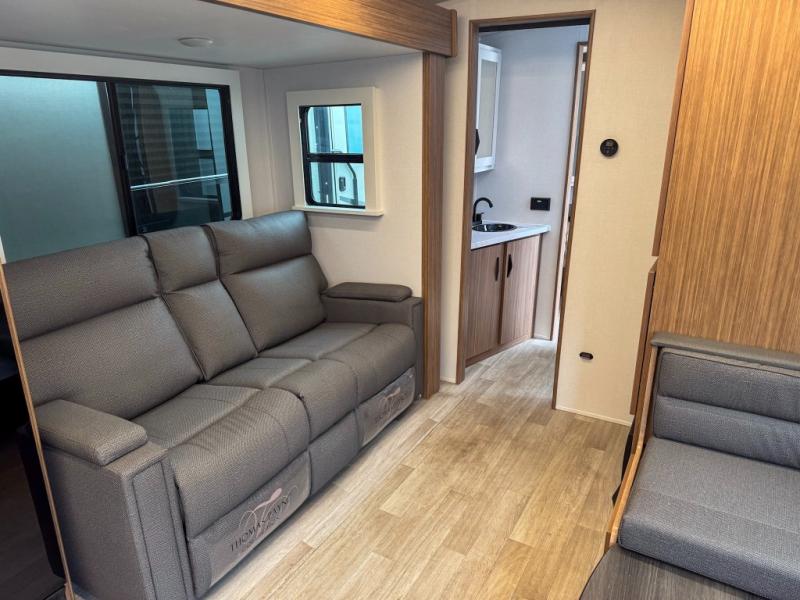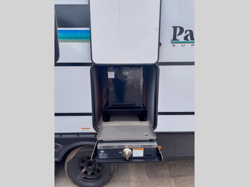 Are you looking to upgrade from a tent to a travel trailer? This dual axle unit may be the one! Since there are dual entry doors, you can enter in through the front master bedroom with a queen bed or the rear kitchen with ample counter space. Your crew can relax on the tri-fold sofa, play a game at the booth dinette, or visit outdoors under the 19' awning. There is also an outdoor kitchen here for a sunrise breakfast! The walk-thru bath is easily accessible for everyone to use, and you'll find plenty of storage space throughout, including a large pantry, overhead compartments, and dual bedroom wardrobes.