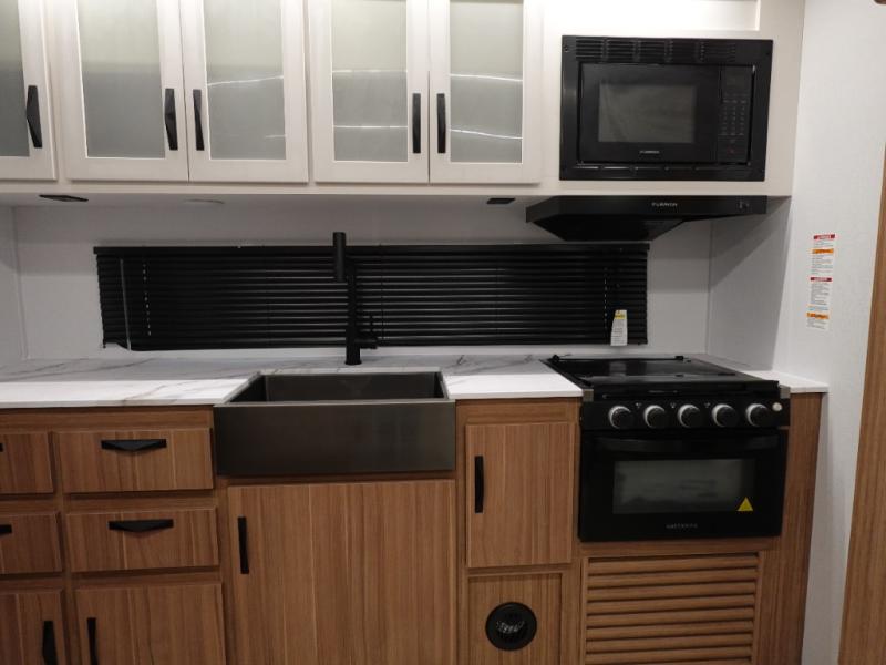 Are you looking to upgrade from a tent to a travel trailer? This dual axle unit may be the one! Since there are dual entry doors, you can enter in through the front master bedroom with a queen bed or the rear kitchen with ample counter space. Your crew can relax on the tri-fold sofa, play a game at the booth dinette, or visit outdoors under the 19' awning. There is also an outdoor kitchen here for a sunrise breakfast! The walk-thru bath is easily accessible for everyone to use, and you'll find plenty of storage space throughout, including a large pantry, overhead compartments, and dual bedroom wardrobes.
