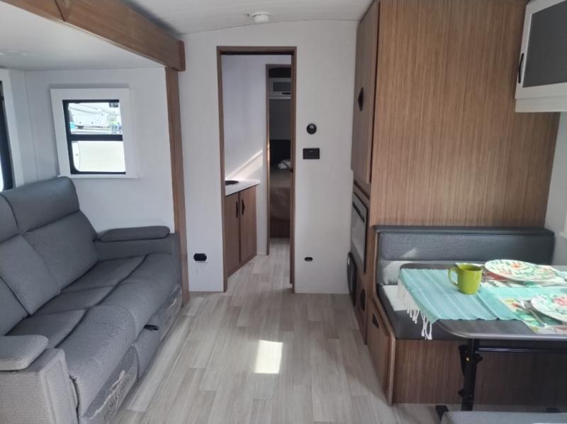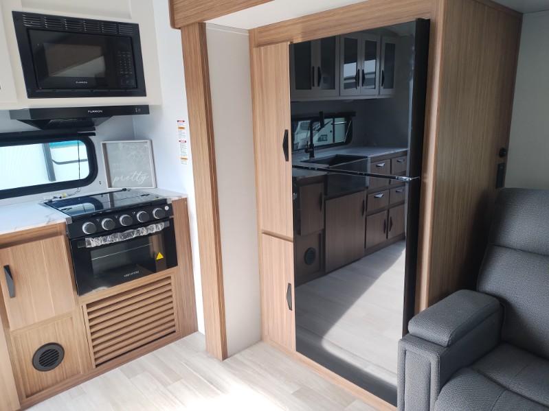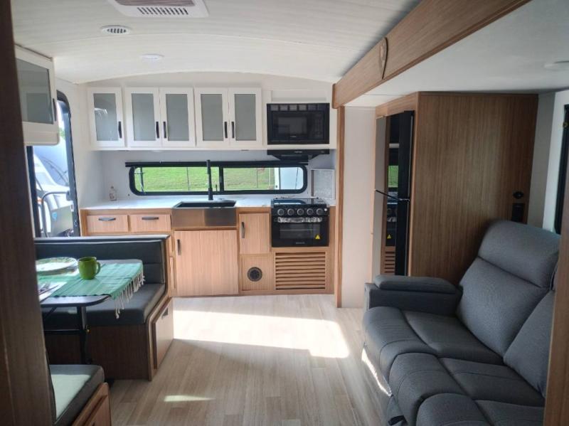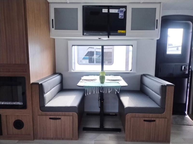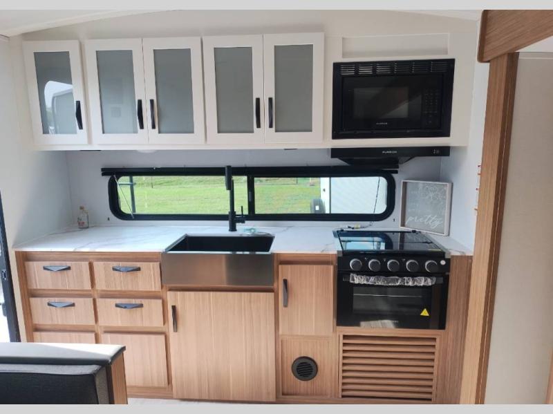 Are you looking to upgrade from a tent to a travel trailer? This dual axle unit may be the one! Since there are dual entry doors, you can enter in through the front master bedroom with a queen bed or the rear kitchen with ample counter space. Your crew can relax on the tri-fold sofa, play a game at the booth dinette, or visit outdoors under the 19' awning. There is also an outdoor kitchen here for a sunrise breakfast! The walk-thru bath is easily accessible for everyone to use, and you'll find plenty of storage space throughout, including a large pantry, overhead compartments, and dual bedroom wardrobes and nightstands.