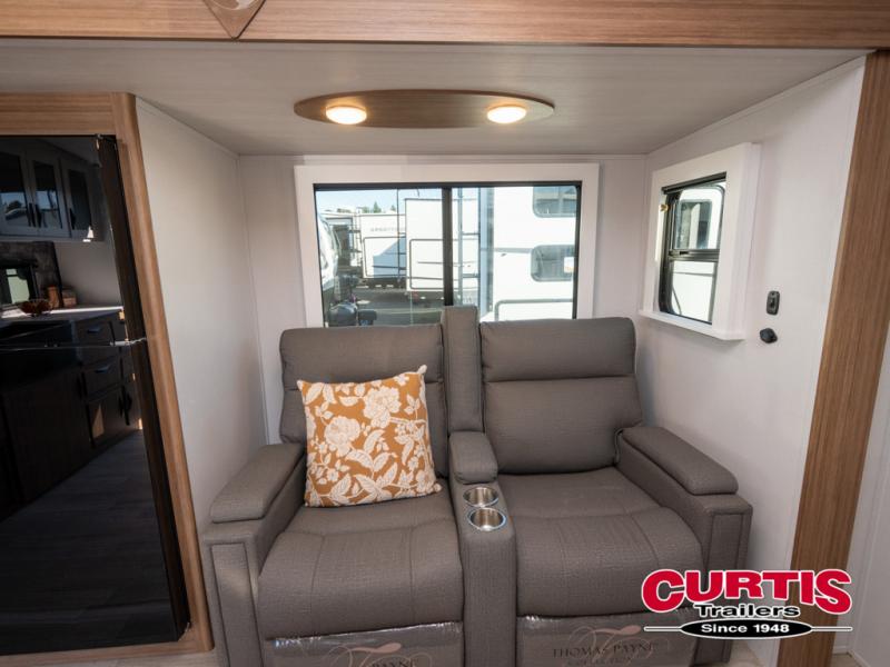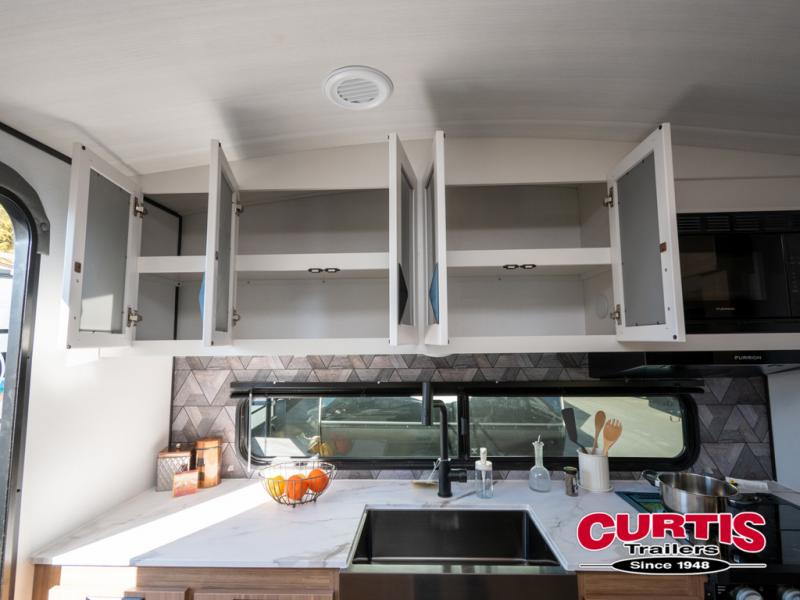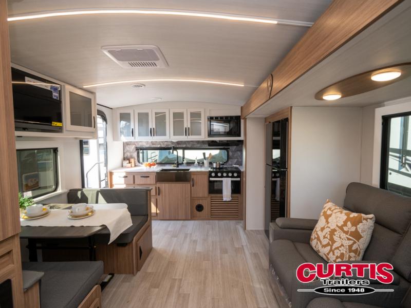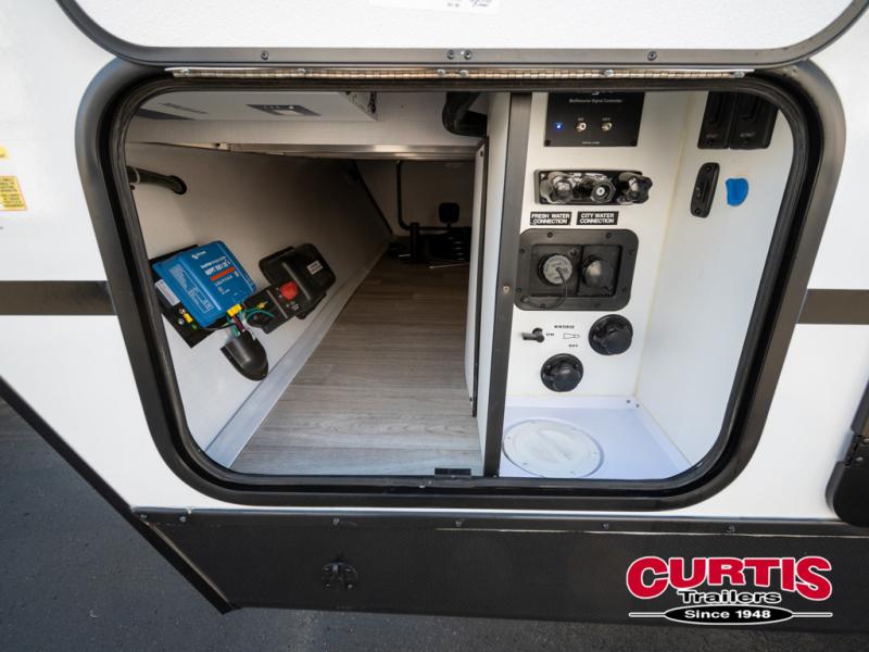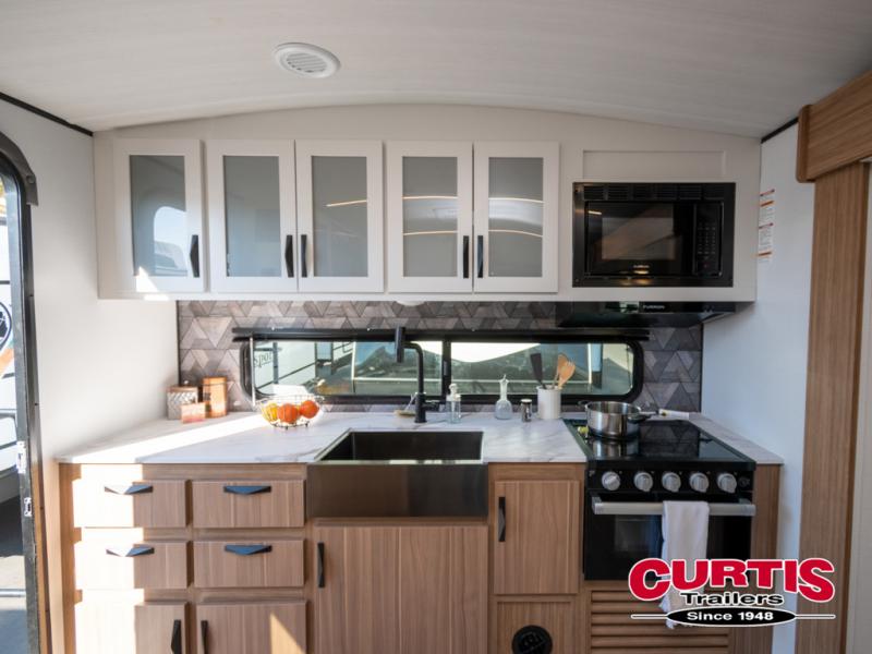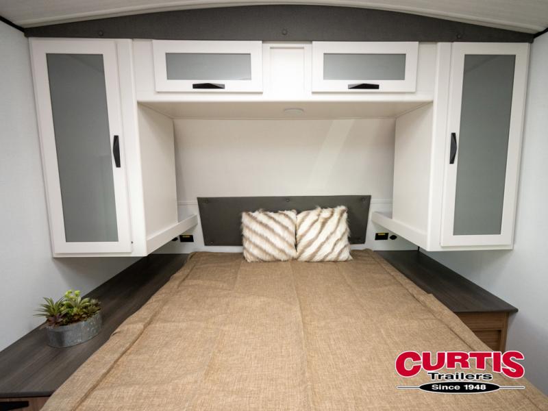 Are you looking to upgrade from a tent to a travel trailer? This dual axle unit may be the one! Since there are dual entry doors, you can enter in through the front master bedroom with a queen bed or the rear kitchen with ample counter space. Your crew can relax on the tri-fold sofa, play a game at the booth dinette, or visit outdoors under the 19' awning. There is also an outdoor kitchen here for a sunrise breakfast! The walk-thru bath is easily accessible for everyone to use, and you'll find plenty of storage space throughout, including a large pantry, overhead compartments, and dual bedroom wardrobes.