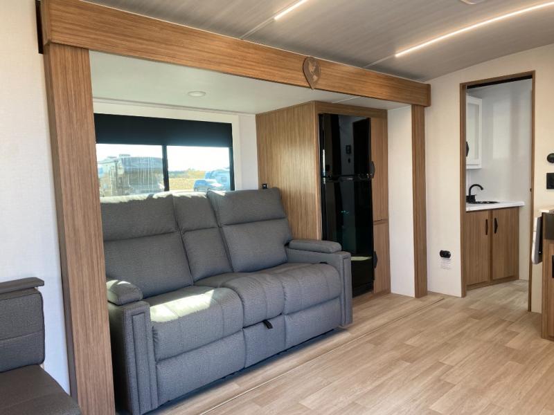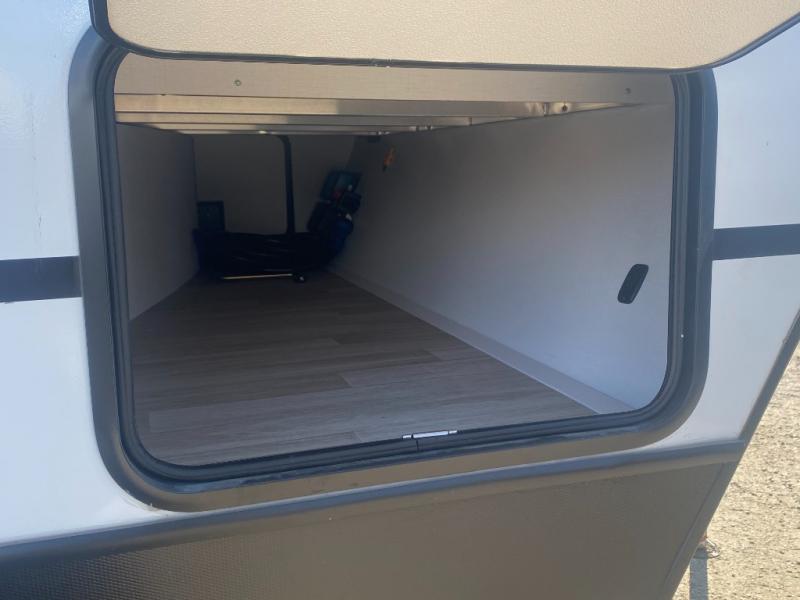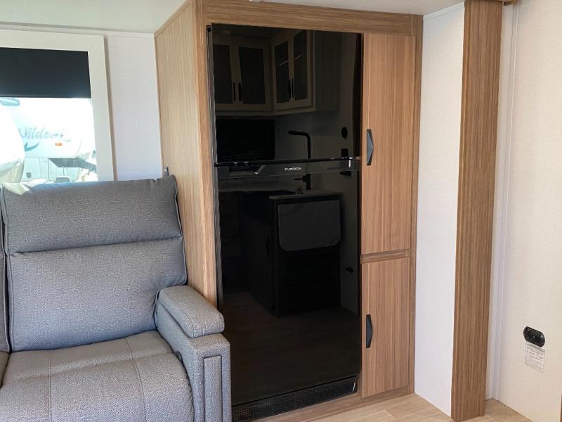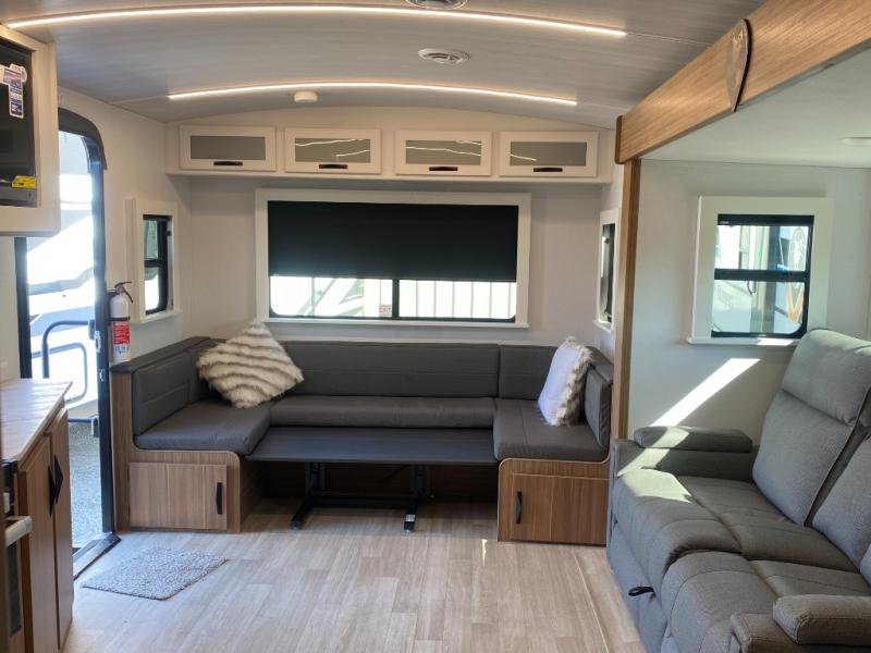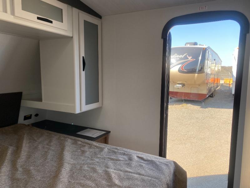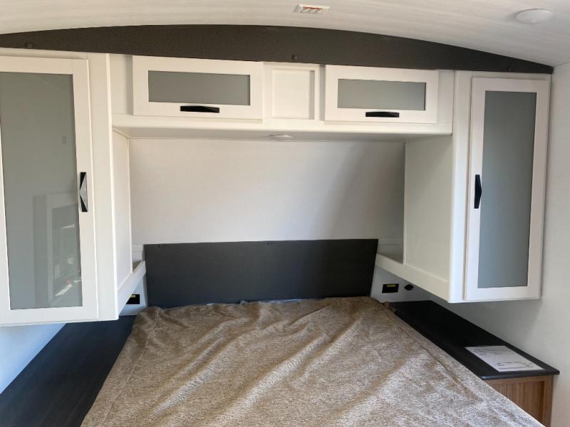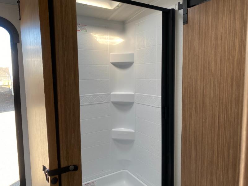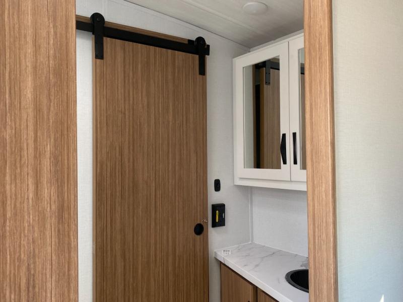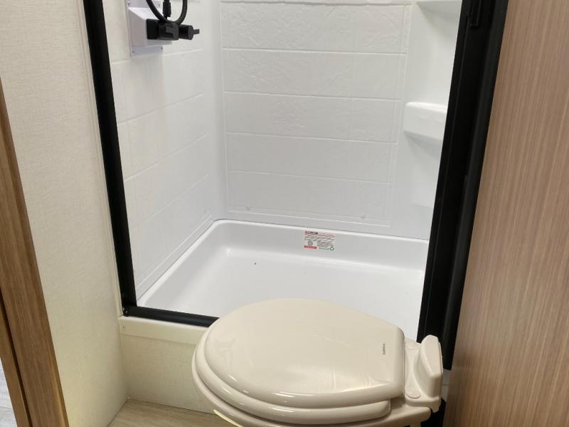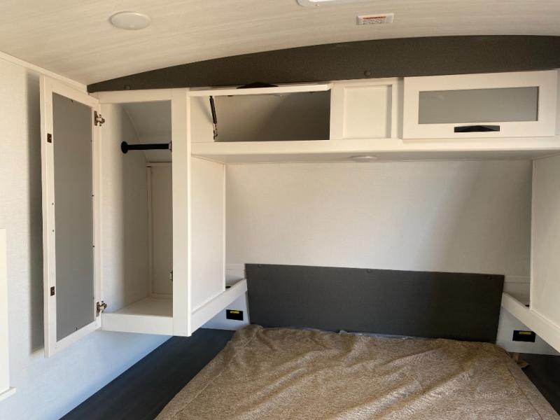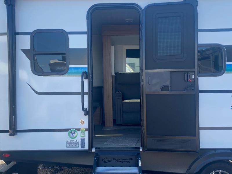 If you're looking to upgrade from a tent to a travel trailer, the time is now with this model! You will love having your own master bedroom up front with a queen bed, dual bedroom wardrobes and your own exterior entry door. The second entry door leads right into the combined kitchen and living area for added convenience. Your crew can dine or play a game around the do-more dinette table or relax on the tri-fold sofa across from the entertainment center. These pieces of furniture will also double as your guests' sleeping space at night, and you have the option to choose luxury cinema recliners in place of the sofa if you don't need that much sleeping room. There is also a full walk-through bath to clean up in each day plus a fully-equipped kitchen to make meals!