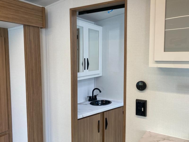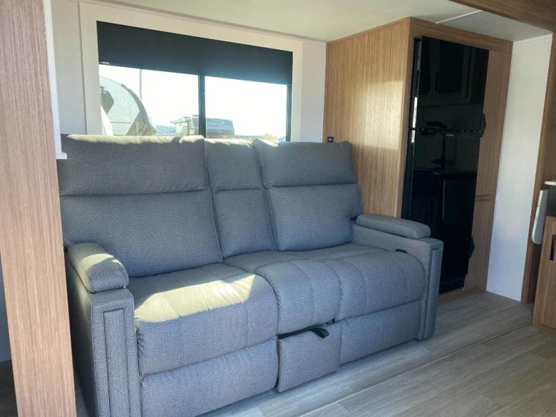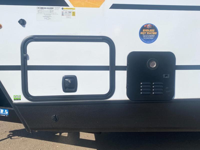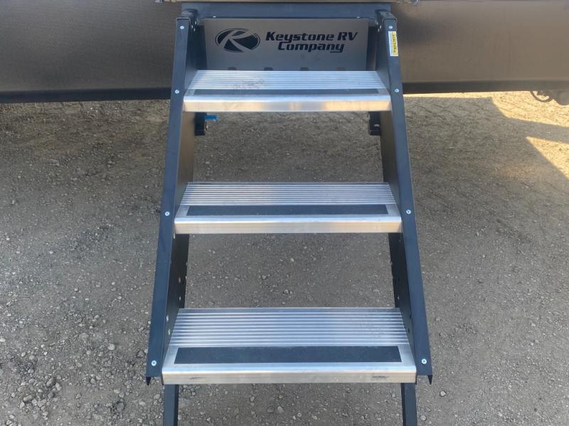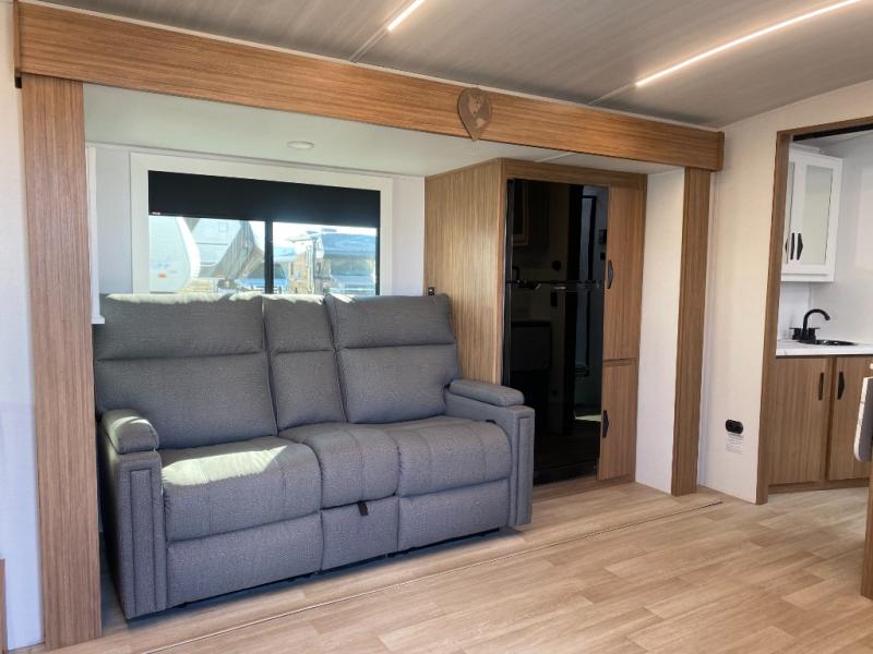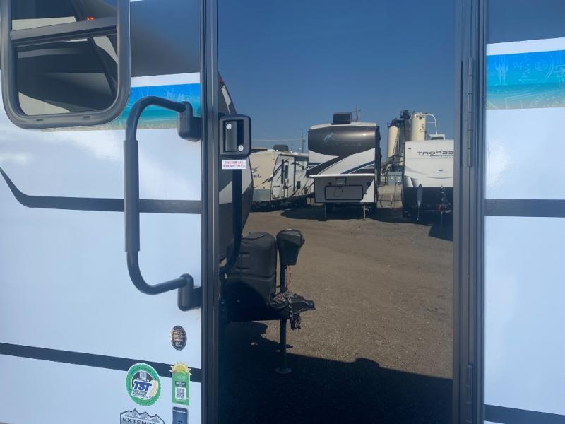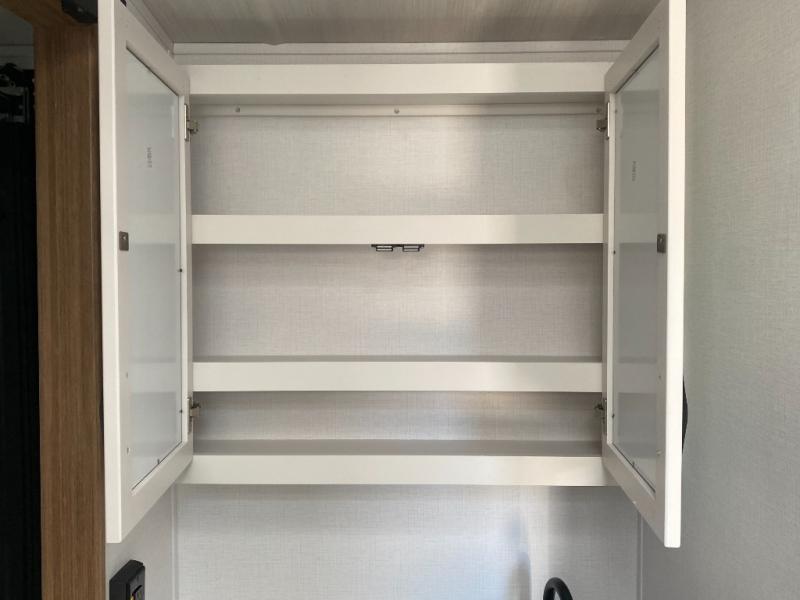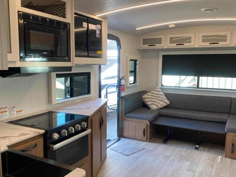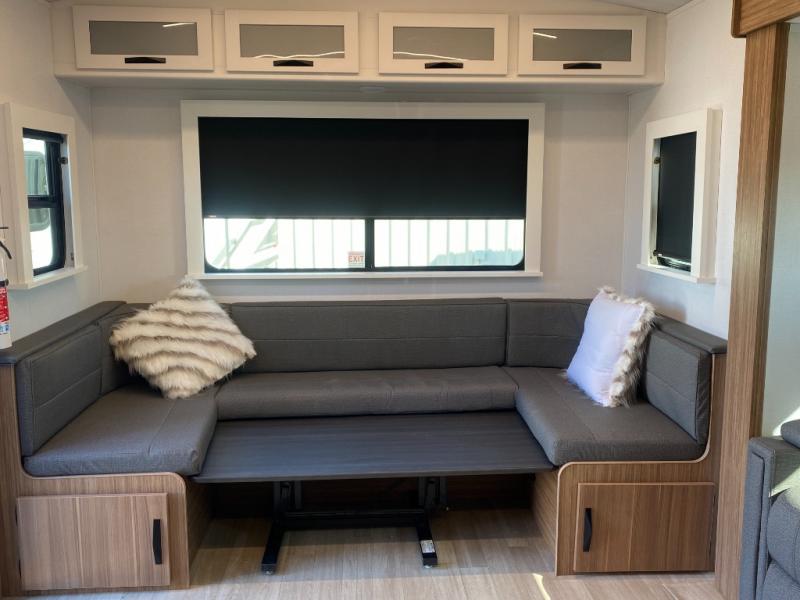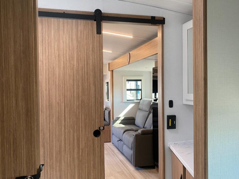 If you're looking to upgrade from a tent to a travel trailer, the time is now with this model! You will love having your own master bedroom up front with a queen bed, dual bedroom wardrobes and your own exterior entry door. The second entry door leads right into the combined kitchen and living area for added convenience. Your crew can dine or play a game around the do-more dinette table or relax on the tri-fold sofa across from the entertainment center. These pieces of furniture will also double as your guests' sleeping space at night, and you have the option to choose luxury cinema recliners in place of the sofa if you don't need that much sleeping room. There is also a full walk-through bath to clean up in each day plus a fully-equipped kitchen to make meals!