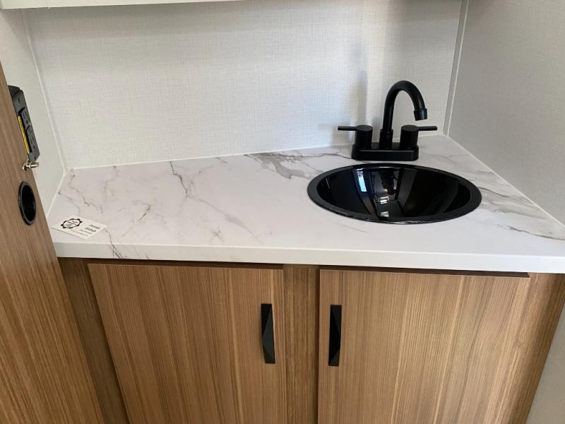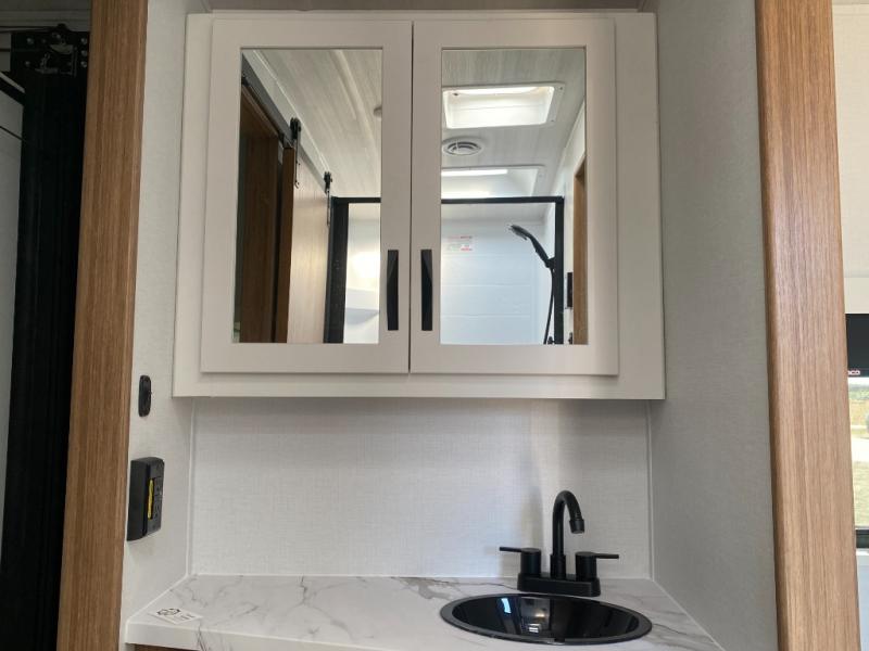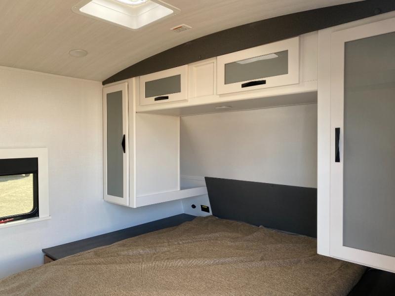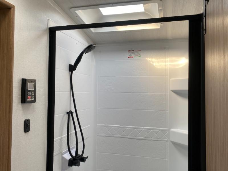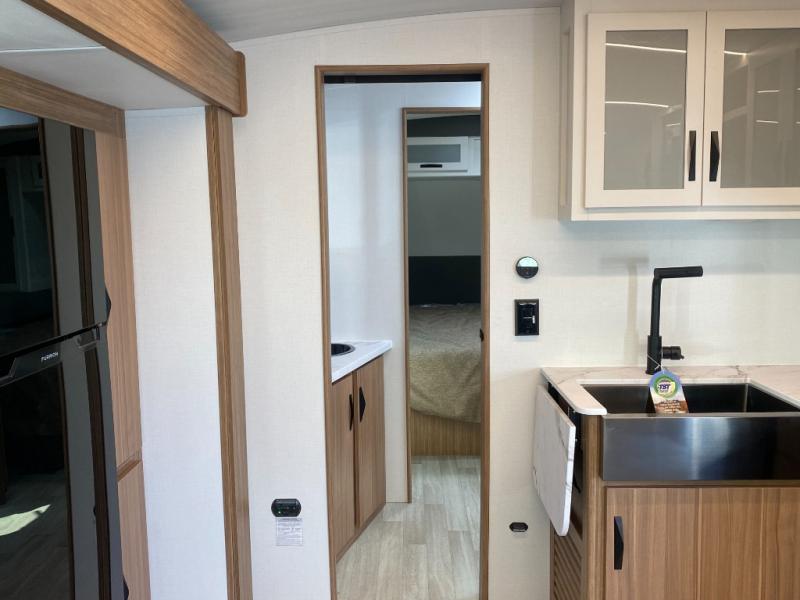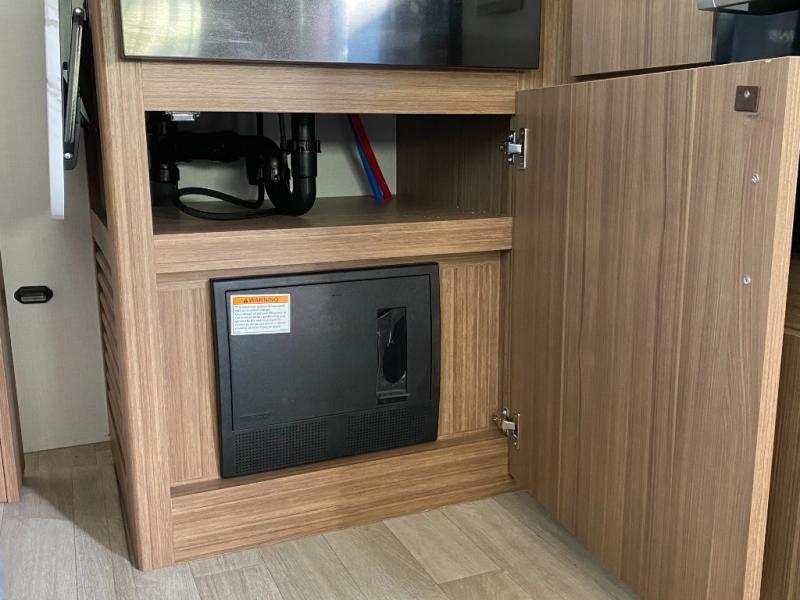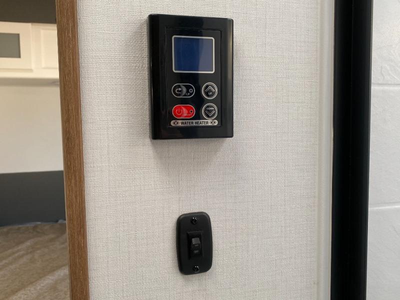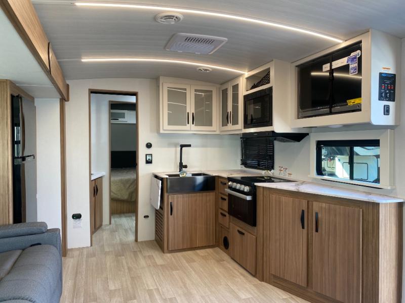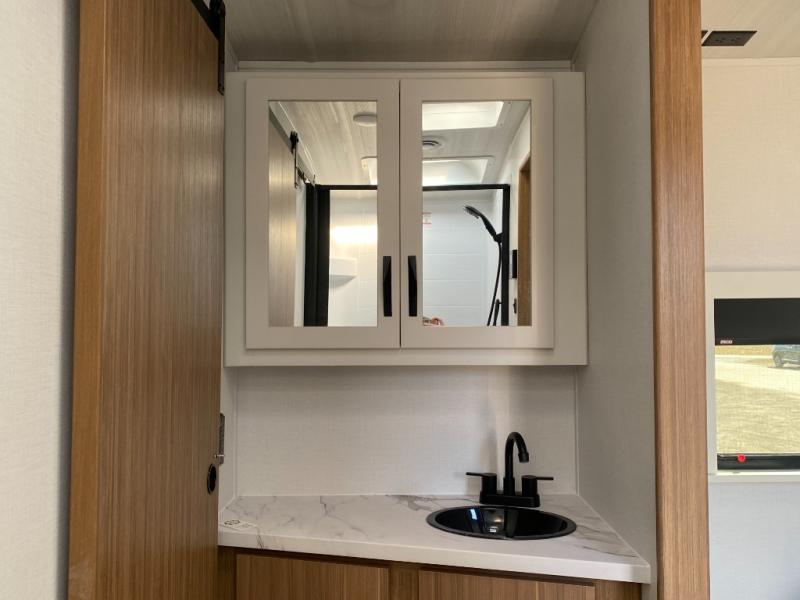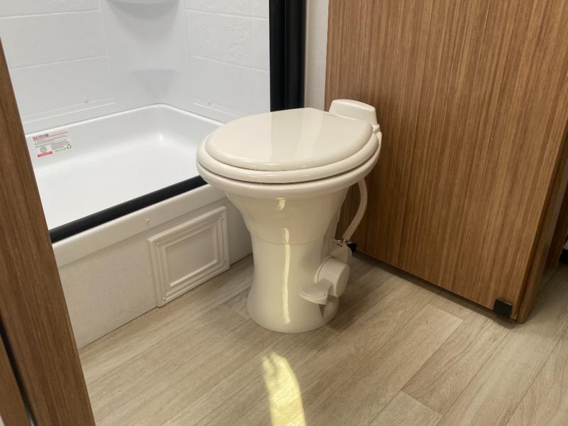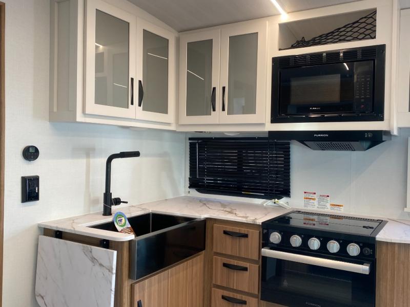 If you're looking to upgrade from a tent to a travel trailer, the time is now with this model! You will love having your own master bedroom up front with a queen bed, dual bedroom wardrobes and your own exterior entry door. The second entry door leads right into the combined kitchen and living area for added convenience. Your crew can dine or play a game around the do-more dinette table or relax on the tri-fold sofa across from the entertainment center. These pieces of furniture will also double as your guests' sleeping space at night, and you have the option to choose luxury cinema recliners in place of the sofa if you don't need that much sleeping room. There is also a full walk-through bath to clean up in each day plus a fully-equipped kitchen to make meals!