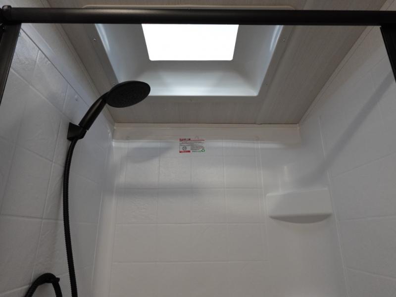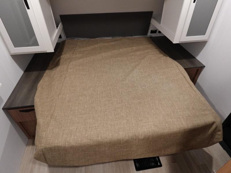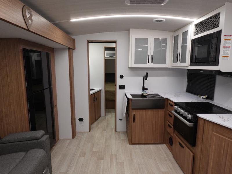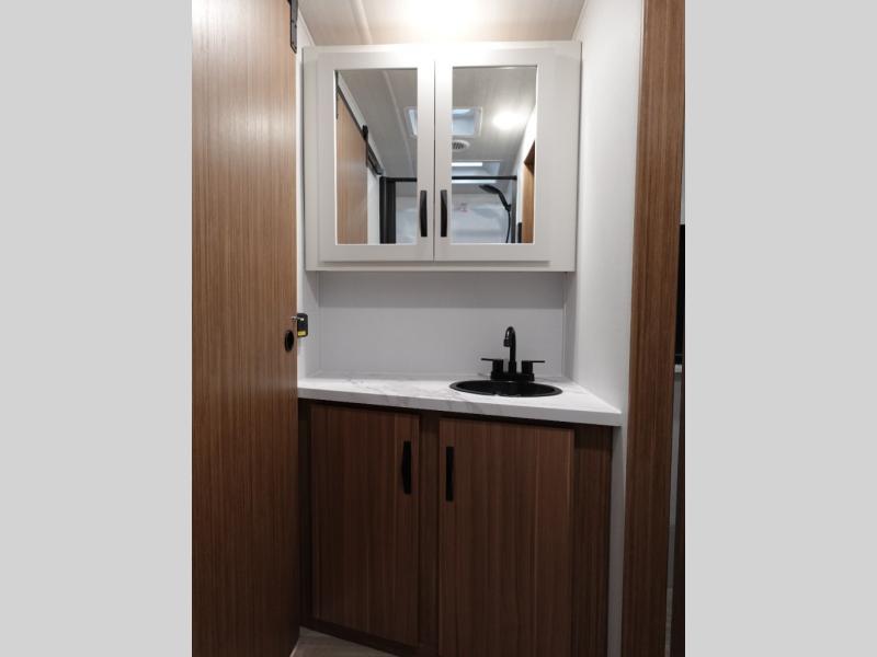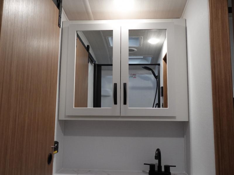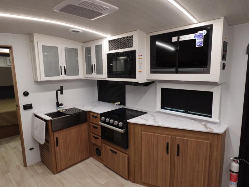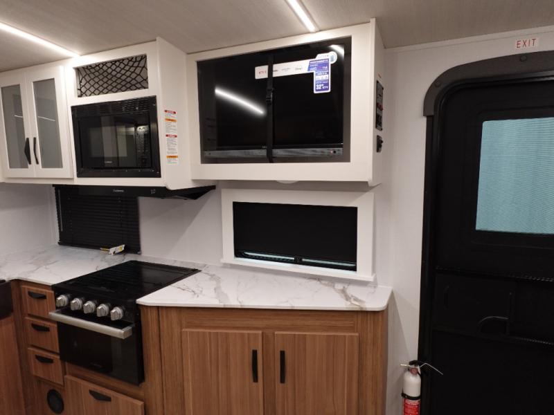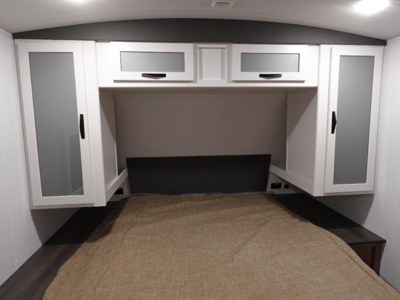 If you're looking to upgrade from a tent to a travel trailer, the time is now with this model! You will love having your own master bedroom up front with a queen bed, dual bedroom wardrobes and your own exterior entry door. The second entry door leads right into the combined kitchen and living area for added convenience. Your crew can dine or play a game around the do-more dinette table or relax on the tri-fold sofa across from the entertainment center. These pieces of furniture will also double as your guests' sleeping space at night, and you have the option to choose luxury cinema recliners in place of the sofa if you don't need that much sleeping room. There is also a full walk-through bath to clean up in each day plus a fully-equipped kitchen to make meals!