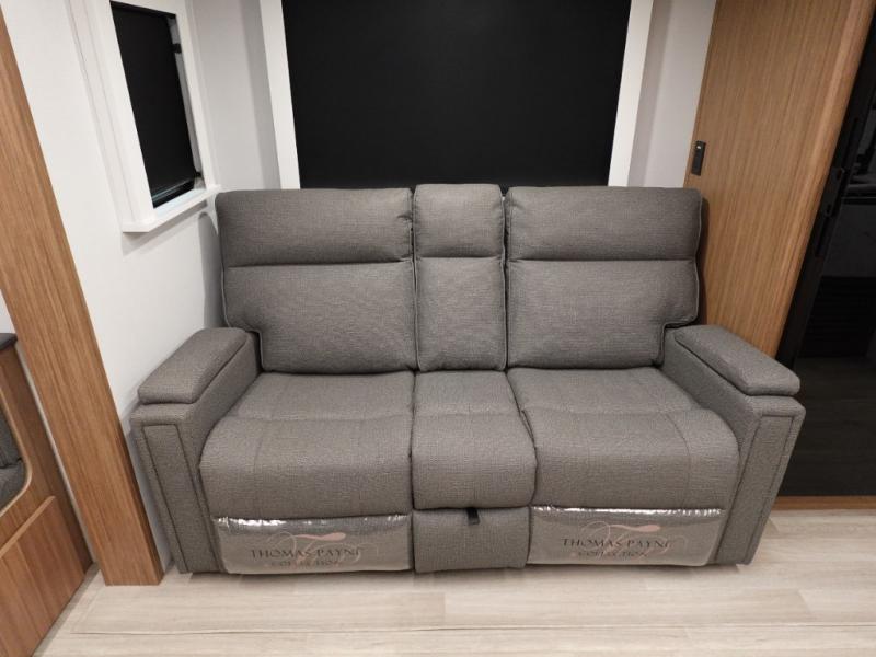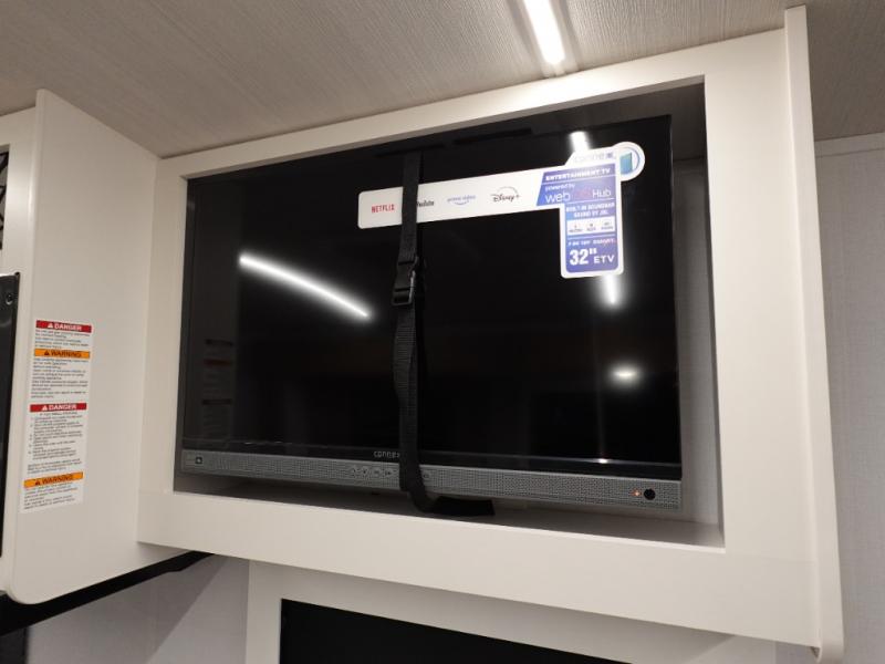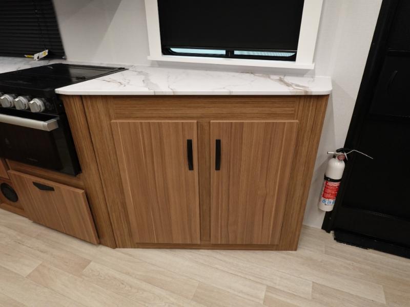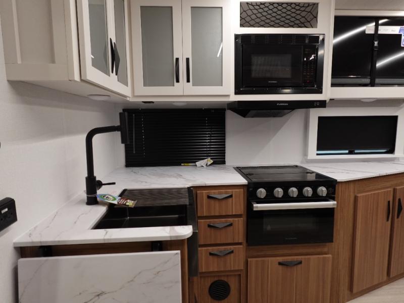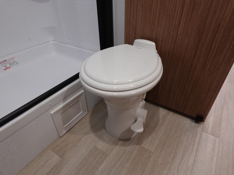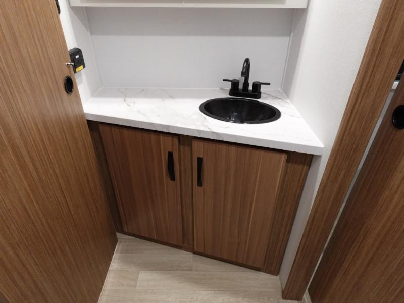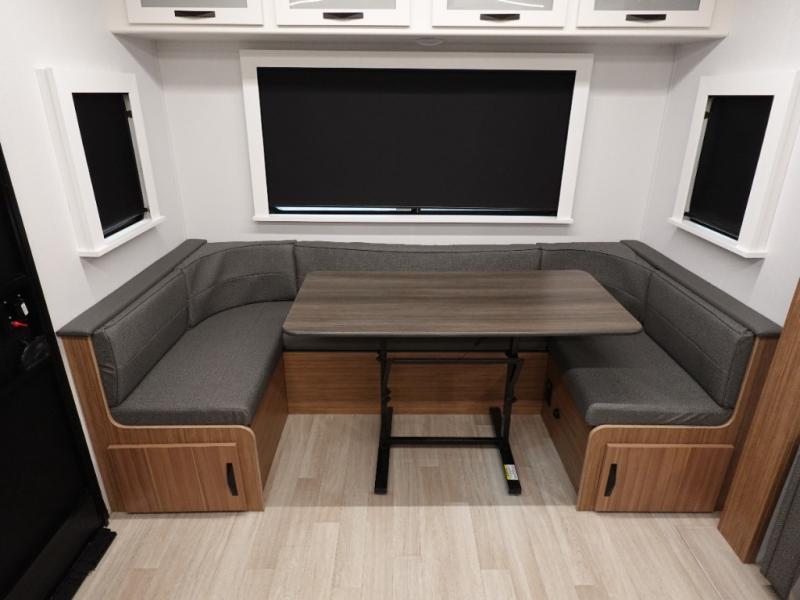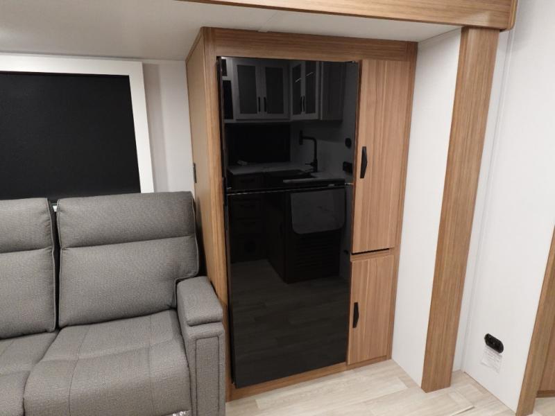If you're looking to upgrade from a tent to a travel trailer, the time is now with this model! You will love having your own master bedroom up front with a queen bed, dual bedroom wardrobes and your own exterior entry door. The second entry door leads right into the combined kitchen and living area for added convenience. Your crew can dine or play a game around the do-more dinette table or relax on the tri-fold sofa across from the entertainment center. These pieces of furniture will also double as your guests' sleeping space at night, and you have the option to choose luxury cinema recliners in place of the sofa if you don't need that much sleeping room. There is also a full walk-through bath to clean up in each day plus a fully-equipped kitchen to make meals!