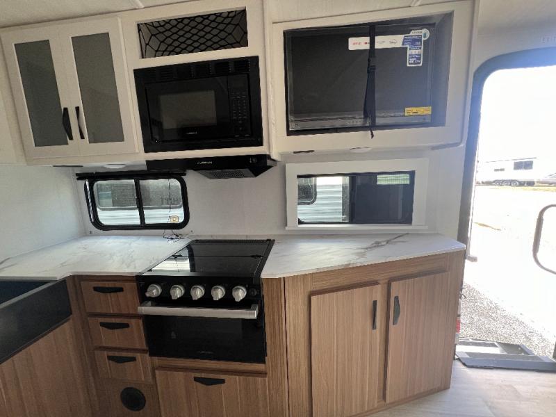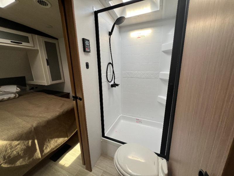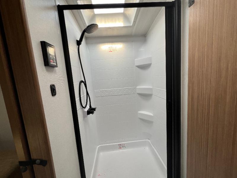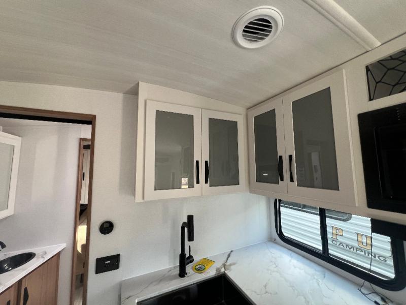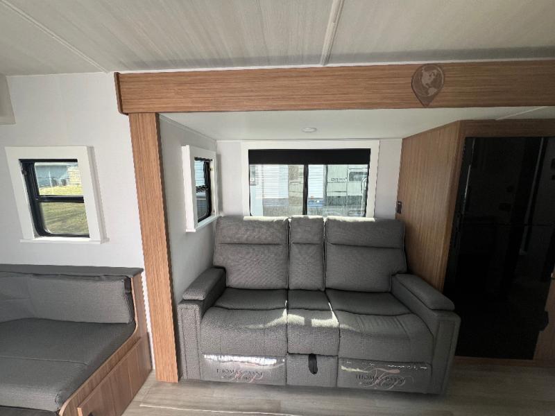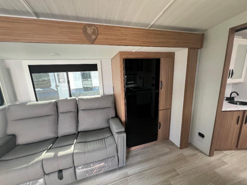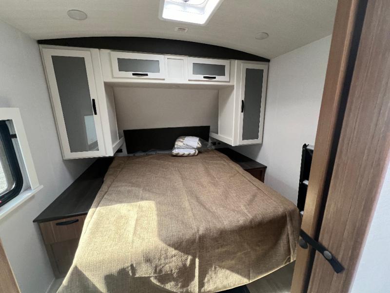 If you're looking to upgrade from a tent to a travel trailer, the time is now with this model! You will love having your own master bedroom up front with a queen bed, dual bedroom wardrobes and your own exterior entry door. The second entry door leads right into the combined kitchen and living area for added convenience. Your crew can dine or play a game around the do-more dinette table or relax on the tri-fold sofa across from the entertainment center. These pieces of furniture will also double as your guests' sleeping space at night, and you have the option to choose luxury cinema recliners in place of the sofa if you don't need that much sleeping room. There is also a full walk-through bath to clean up in each day plus a fully-equipped kitchen to make meals!