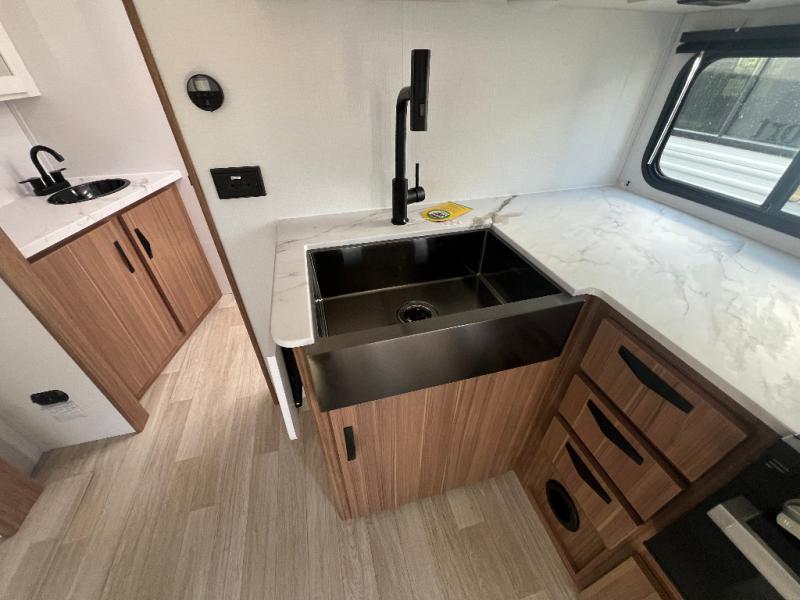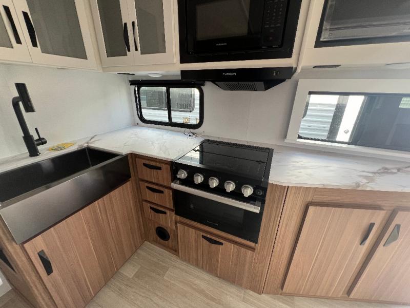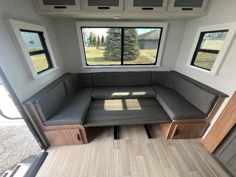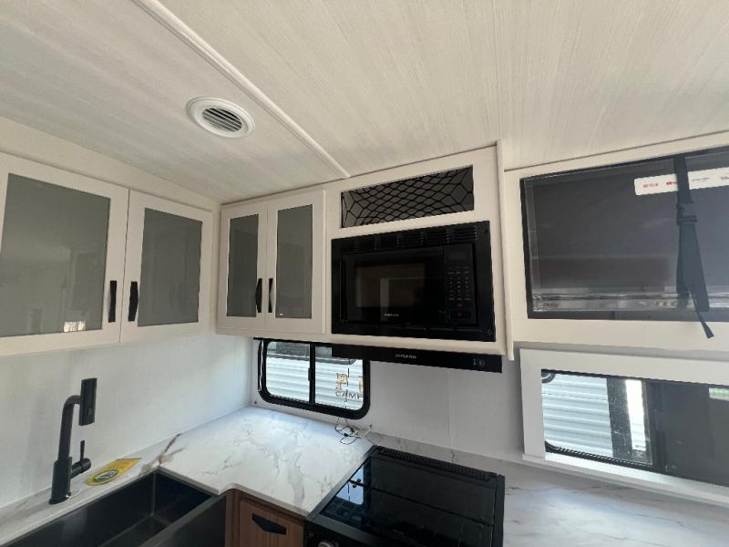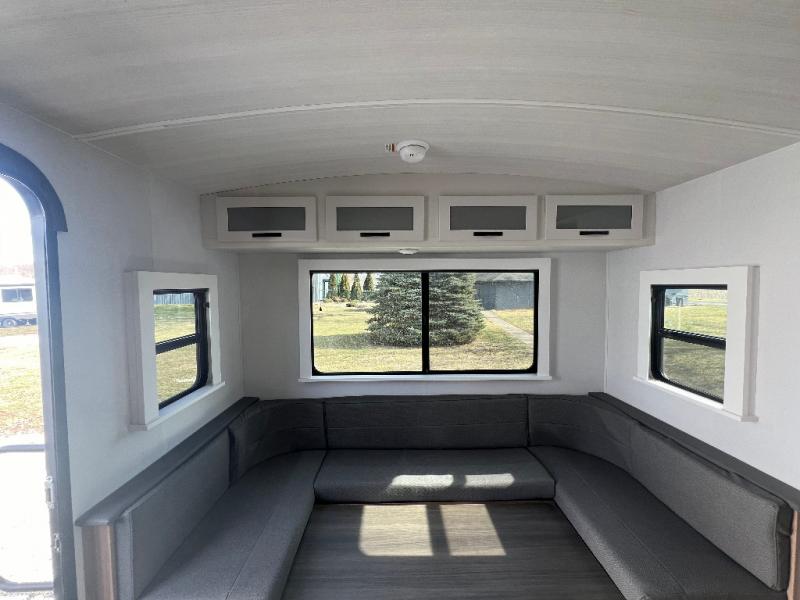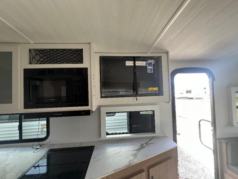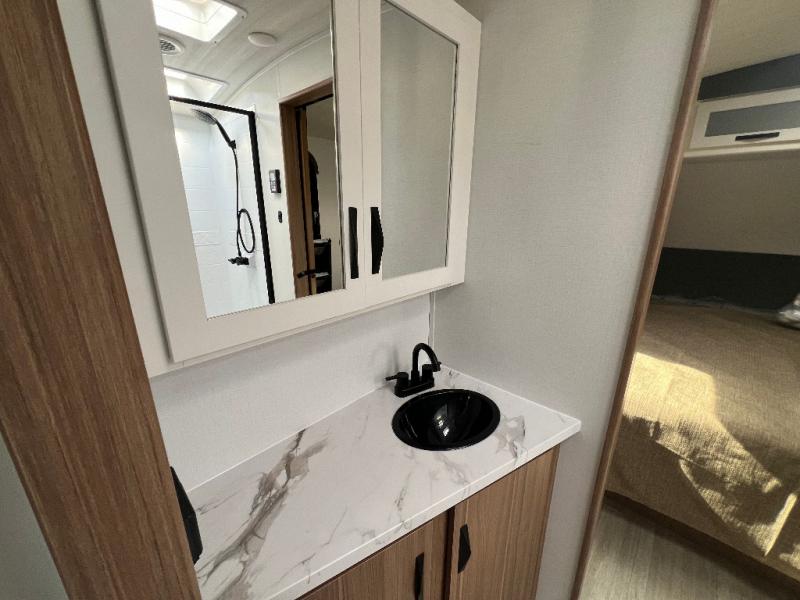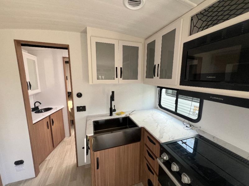 If you're looking to upgrade from a tent to a travel trailer, the time is now with this model! You will love having your own master bedroom up front with a queen bed, dual bedroom wardrobes and your own exterior entry door. The second entry door leads right into the combined kitchen and living area for added convenience. Your crew can dine or play a game around the do-more dinette table or relax on the tri-fold sofa across from the entertainment center. These pieces of furniture will also double as your guests' sleeping space at night, and you have the option to choose luxury cinema recliners in place of the sofa if you don't need that much sleeping room. There is also a full walk-through bath to clean up in each day plus a fully-equipped kitchen to make meals!