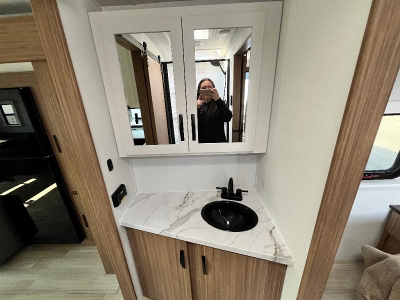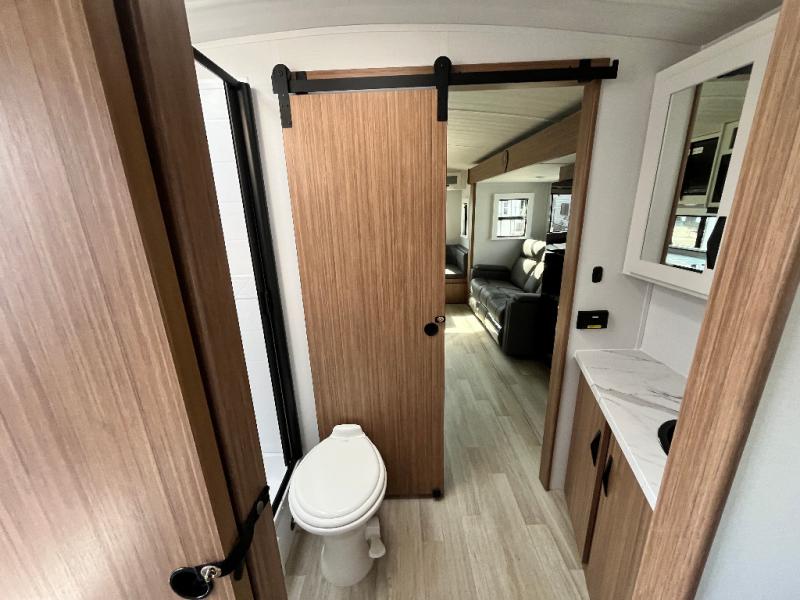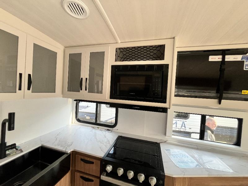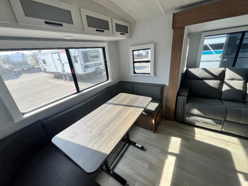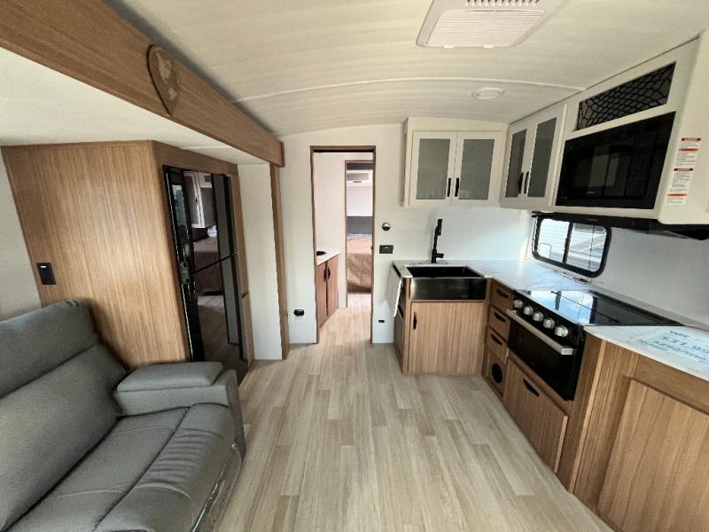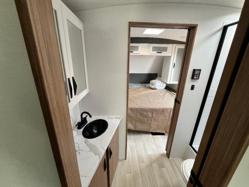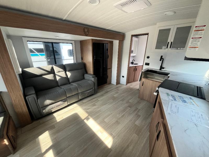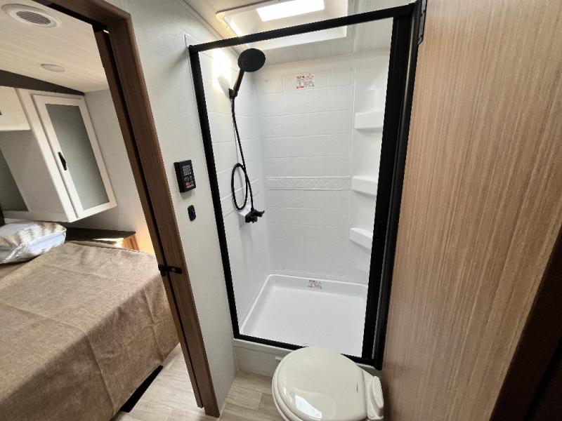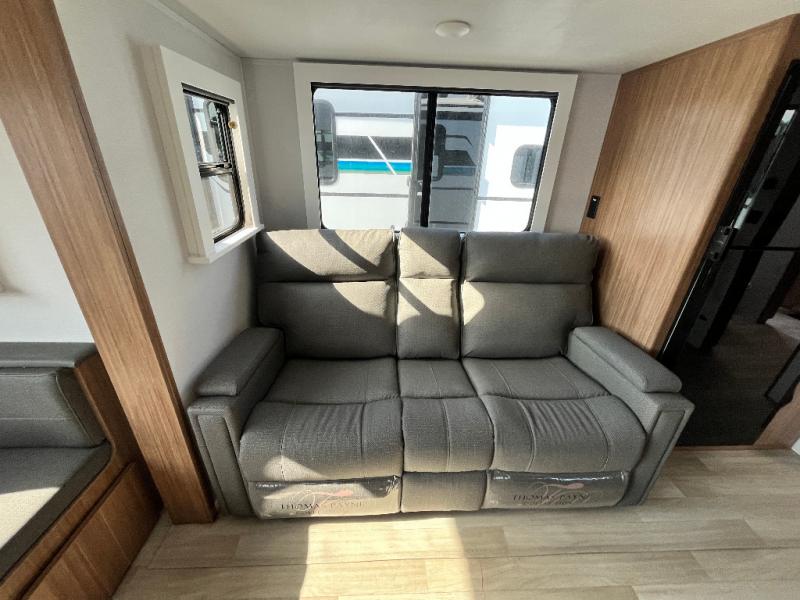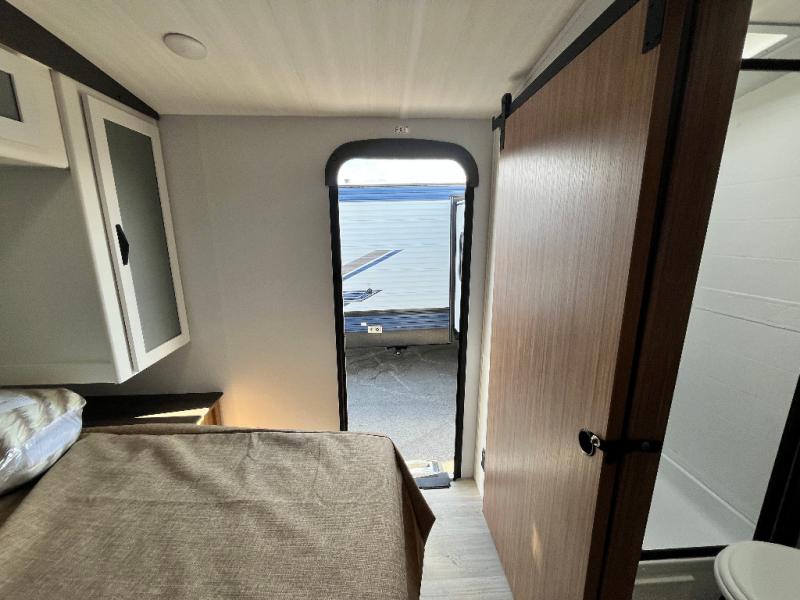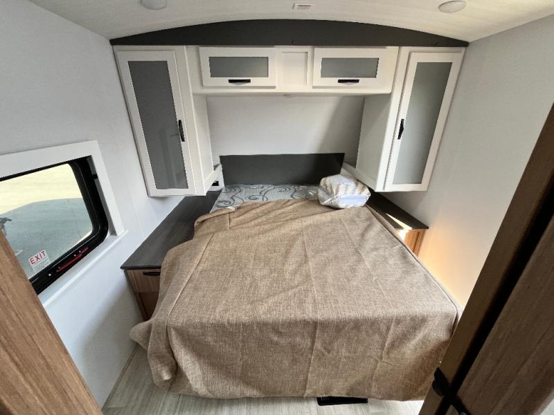 If you're looking to upgrade from a tent to a travel trailer, the time is now with this model! You will love having your own master bedroom up front with a queen bed, dual bedroom wardrobes and your own exterior entry door. The second entry door leads right into the combined kitchen and living area for added convenience. Your crew can dine or play a game around the U-shaped do-more dinette table or relax on the tri-fold sofa across from the entertainment center. These pieces of furniture will also double as your guests' sleeping space at night, and you have the option to choose luxury cinema recliners in place of the sofa if you don't need that much sleeping room. There is also a full walk-through bath to clean up in each day plus a fully-equipped kitchen to make meals!
