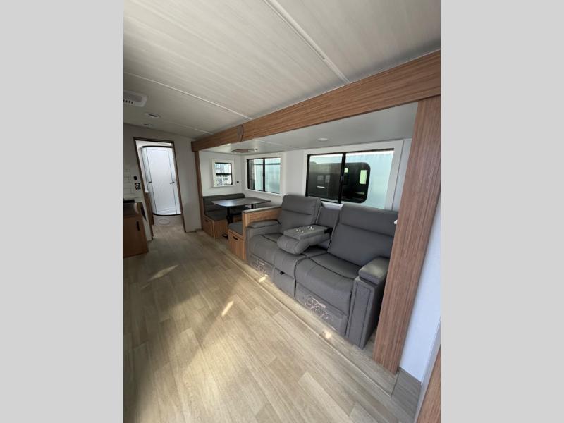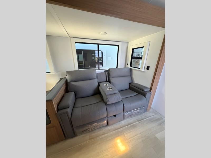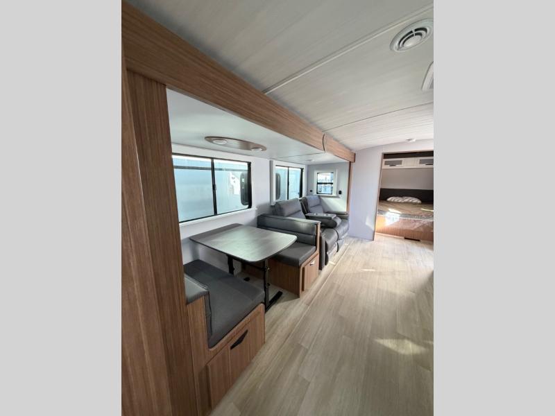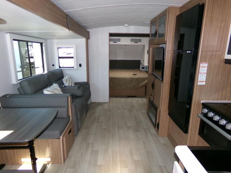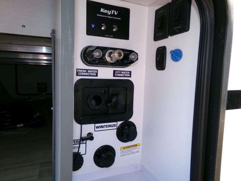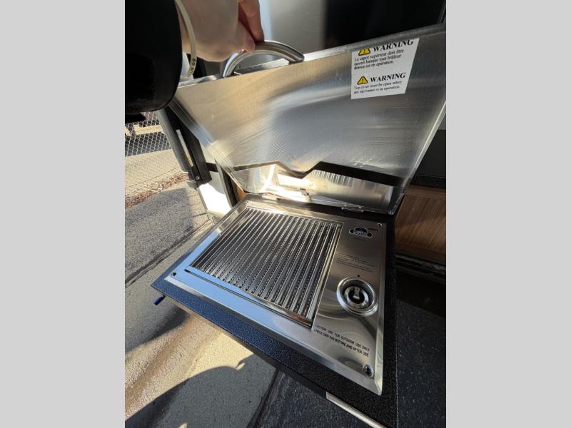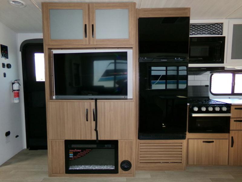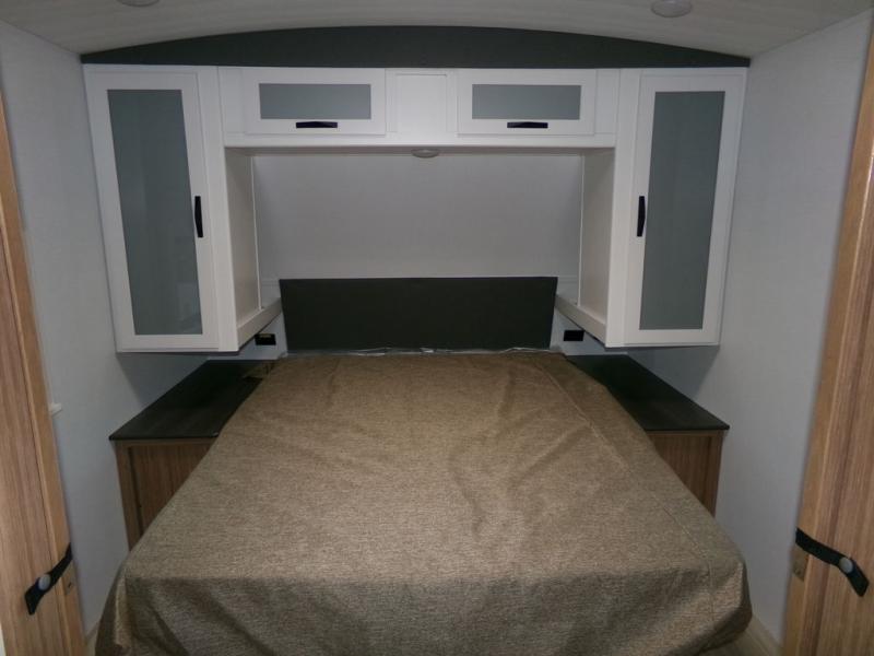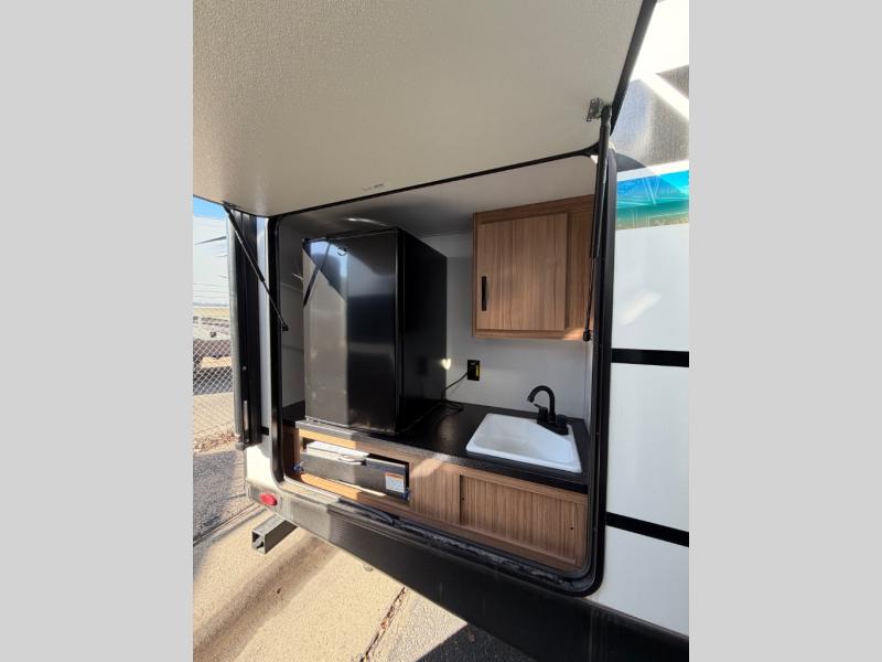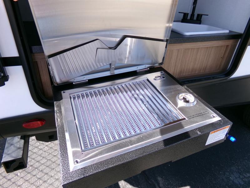 Time spent in this dual axle travel trailer will be time well spent. You can put out the 21' awning when you arrive, then unload the pass-thru storage and start lunch on the exterior kitchen with a Capital grill, sink, and 4.4 cu. ft. refrigerator. The tri-fold sofa and Do-More dinette table within the large slide out will provide a place to relax and dine each day, and there is a full interior kitchen when the weather isn't cooperating outdoors. This unit includes a front private bedroom with sliding doors for more space, a queen bed, dual wardrobes, and a nightstand to keep everything tidy. And don't overlook the full rear bath that will allow you to clean up each day without having to leave your trailer!