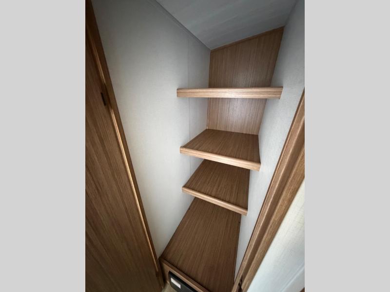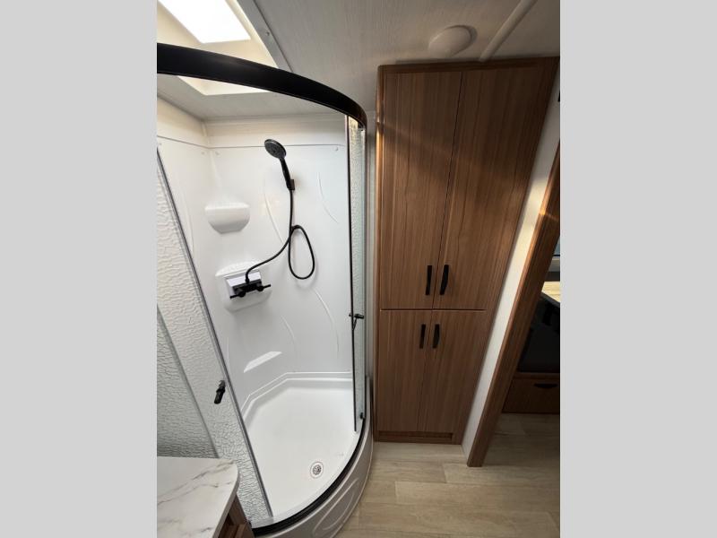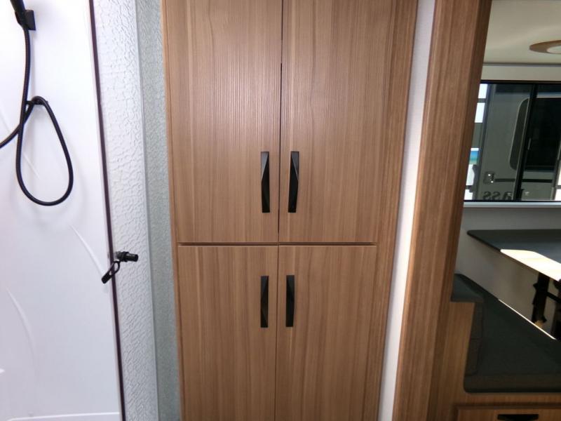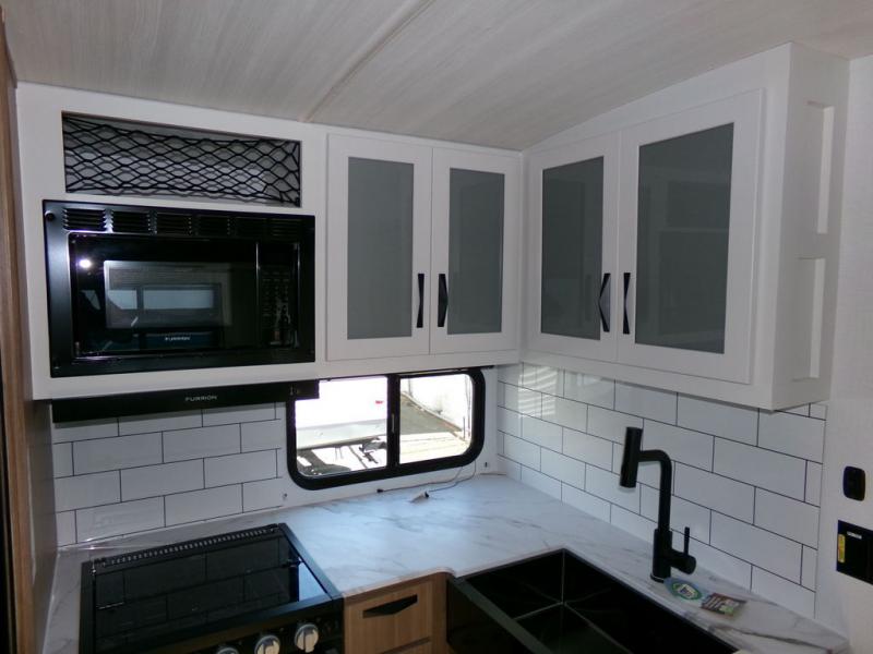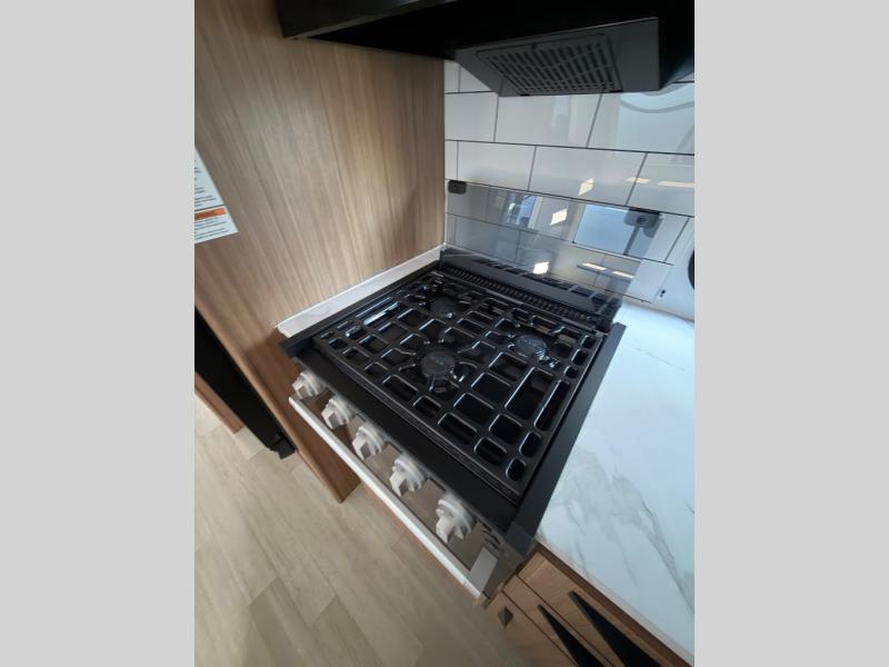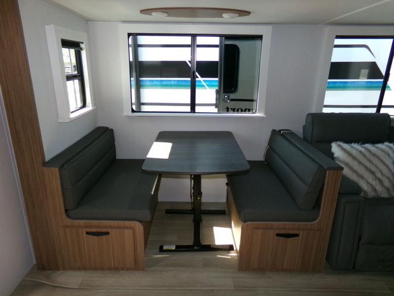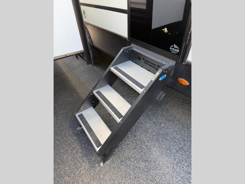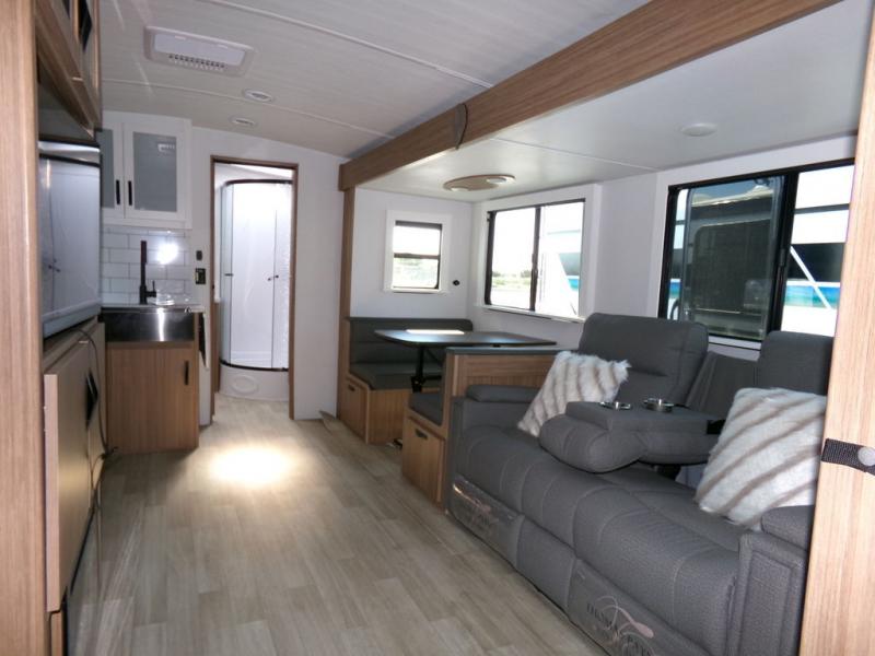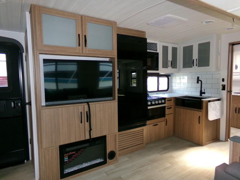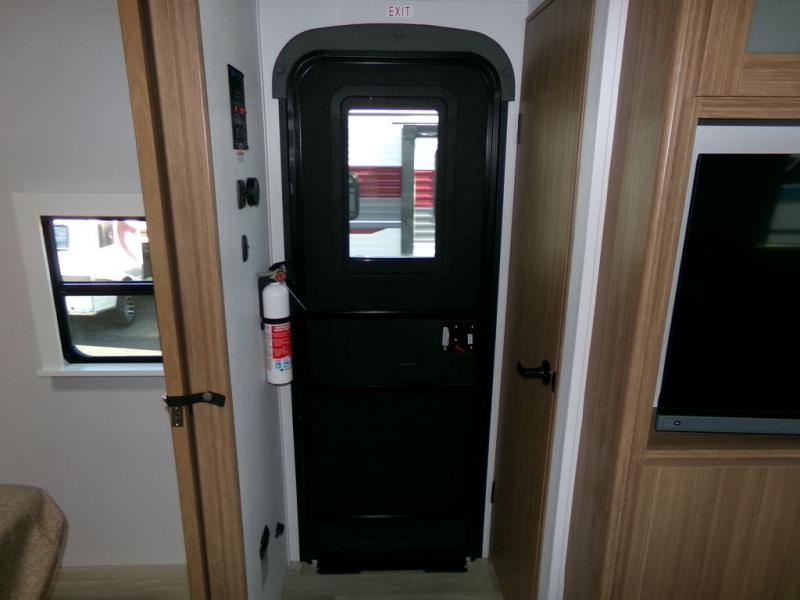 Time spent in this dual axle travel trailer will be time well spent. You can put out the 21' awning when you arrive, then unload the pass-thru storage and start lunch on the exterior kitchen with a Capital grill, sink, and 4.4 cu. ft. refrigerator. The tri-fold sofa and Do-More dinette table within the large slide out will provide a place to relax and dine each day, and there is a full interior kitchen when the weather isn't cooperating outdoors. This unit includes a front private bedroom with sliding doors for more space, a queen bed, dual wardrobes, and a nightstand to keep everything tidy. And don't overlook the full rear bath that will allow you to clean up each day without having to leave your trailer!