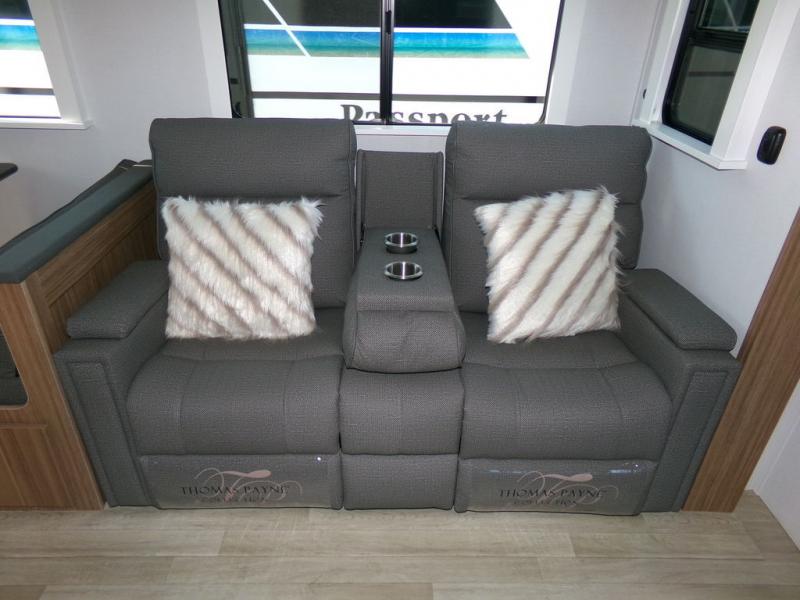 With any Keystone Passport Super Lite travel trailer you will enjoy lightweight towing and lots of interior comforts! The power tongue jack lets you hitch up at the drop of a hat, and the Dexter torsion axle rubber ride suspension will make towing easier than ever. You will appreciate having power stabilizer jacks for quick setup and an exterior convenience center to monitor tank levels. These trailers are constructed with a seamless, laminated and gel-coated filon exterior, 80% tinted safety glass windows, and a one-piece polypropylene underbelly. The interior will have you feeling right at home with residential durable Beauflor vinyl flooring, deluxe night shades, LED lighting throughout, and seamless kitchen countertops to name a few comforts.